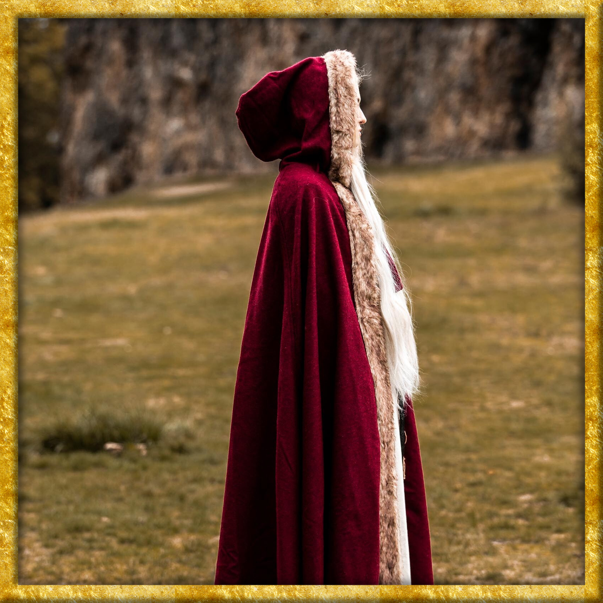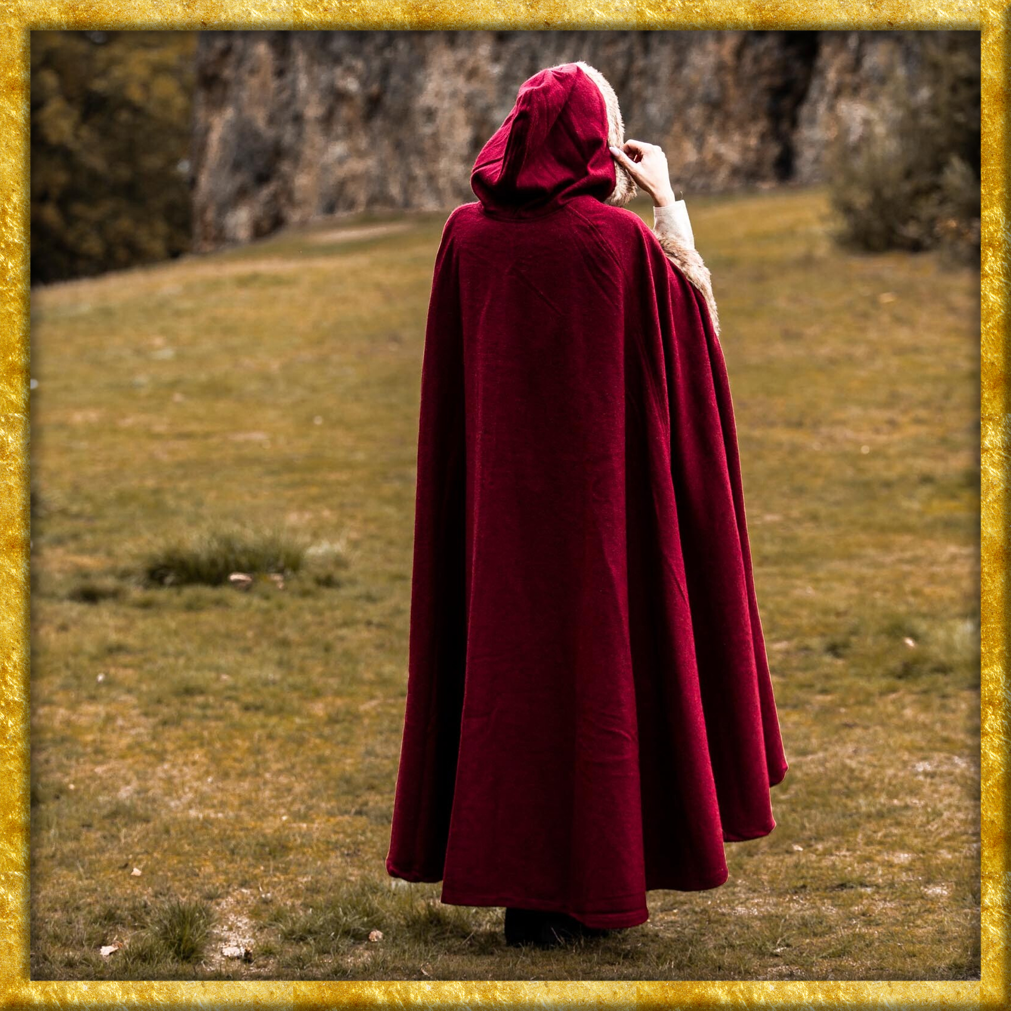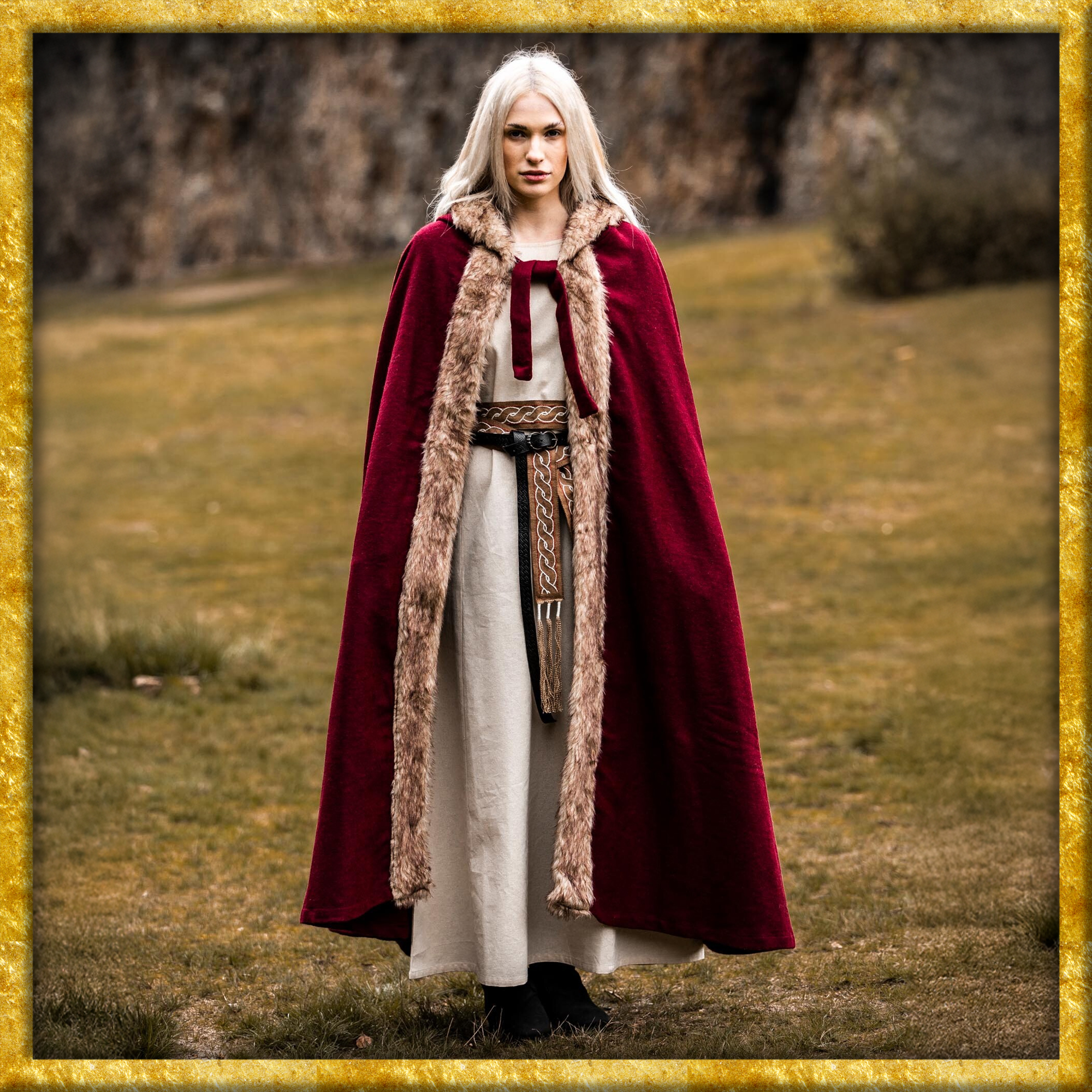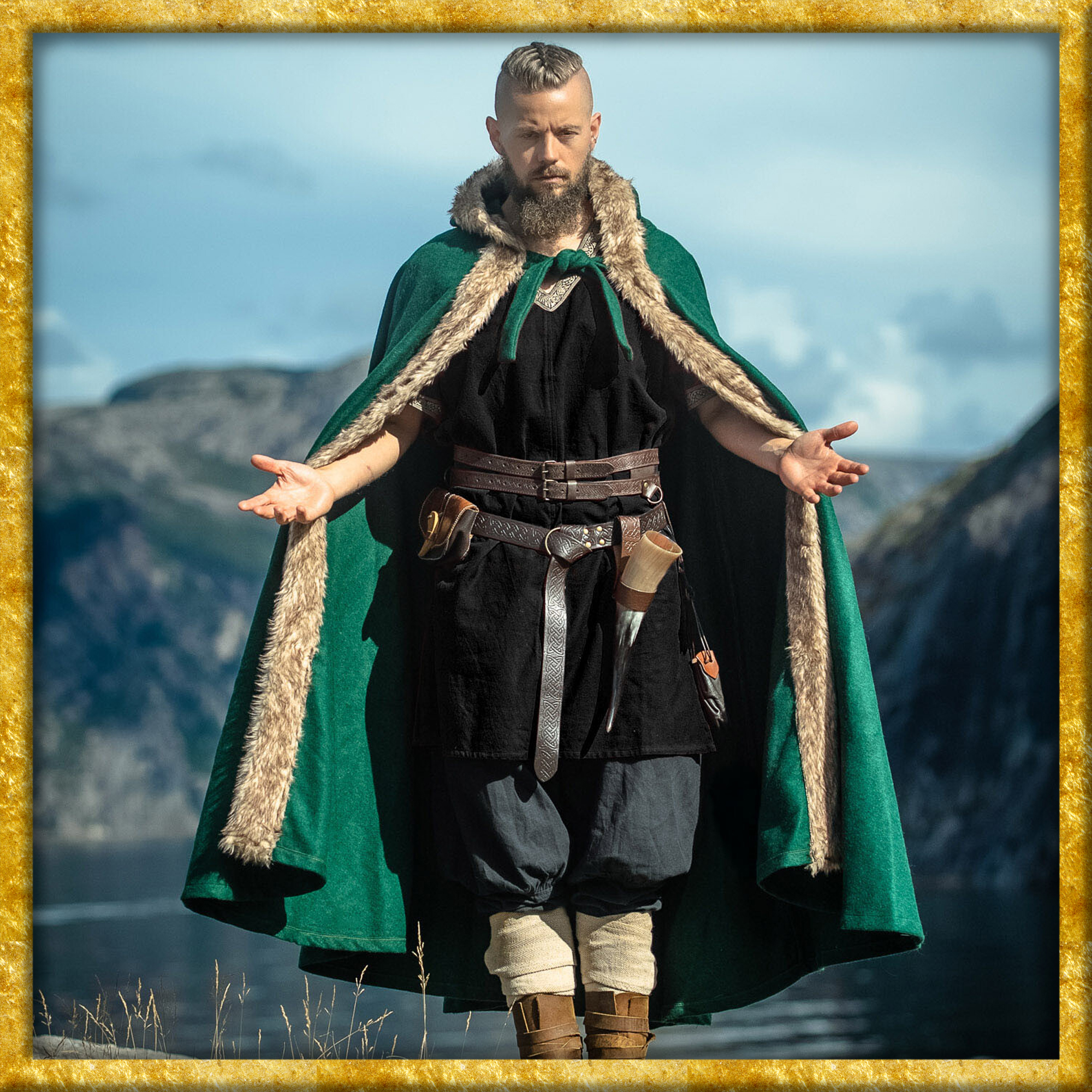Durch das qualitativ hochwertige Wollgemisch wirkt der Umhang bei nordischem Wetter und leichtem Regen wasserabweisend. Das Kunstfell an den Konturen sorgt für eine zusätzliche Schicht Wärme und verleiht dem Umhang eine raue, rustikale Optik, die perfekt zur Wikinger-Ästhetik passt. Die kurze Kapuze bietet zusätzlichen Schutz der Kälte und vervollständigt das klassische Wikinger-Design.