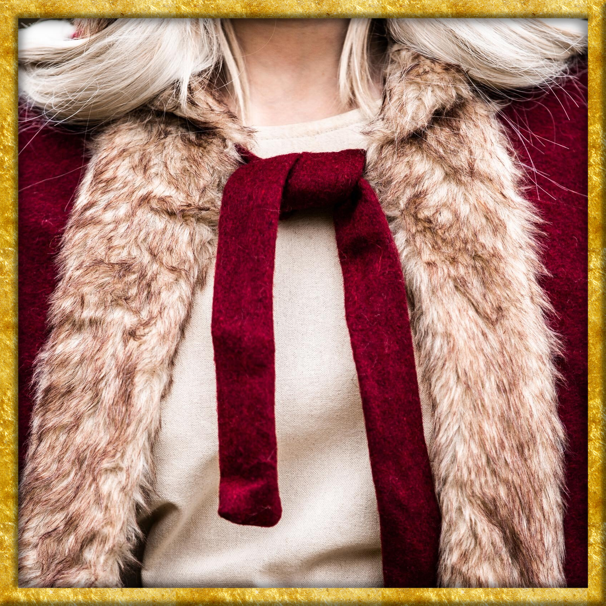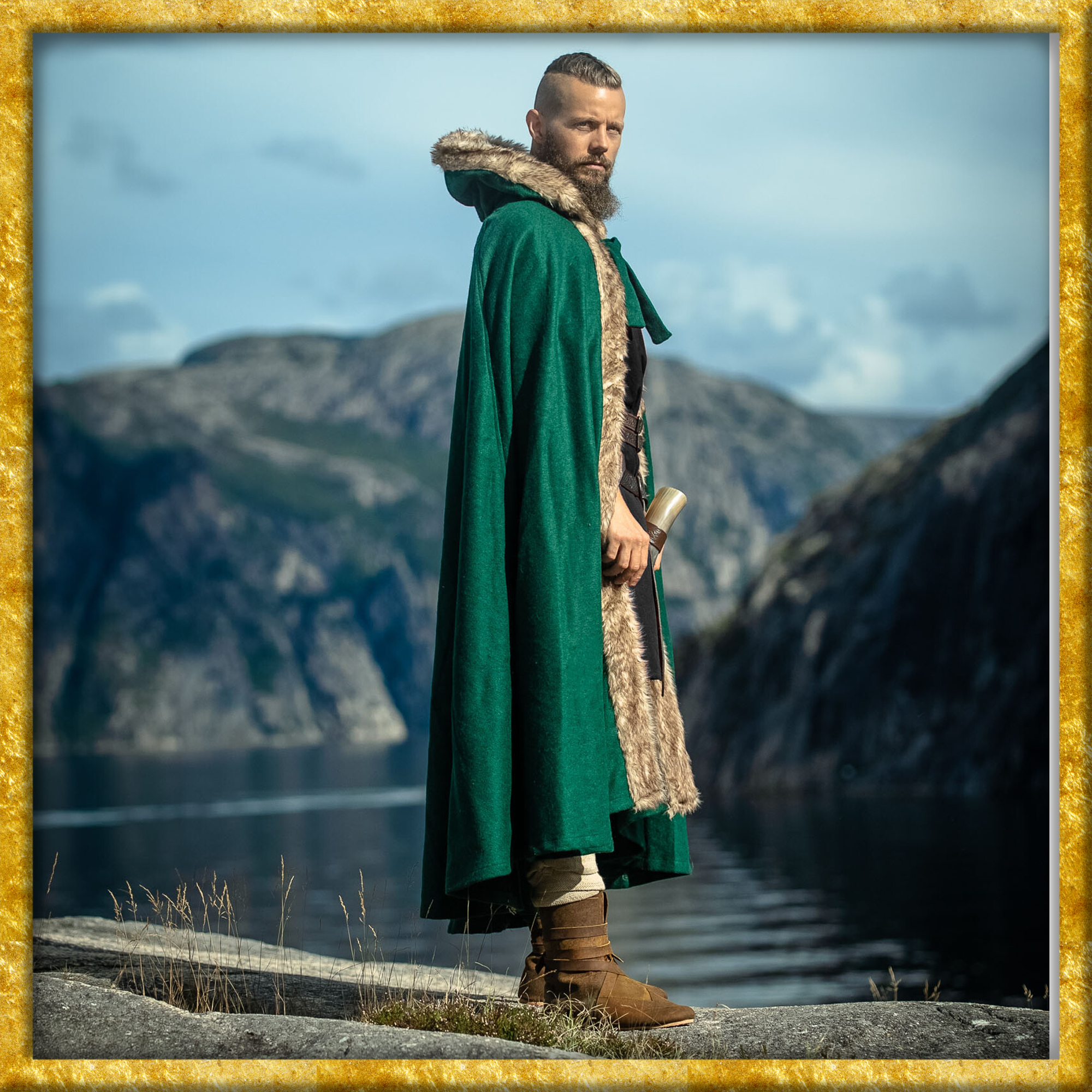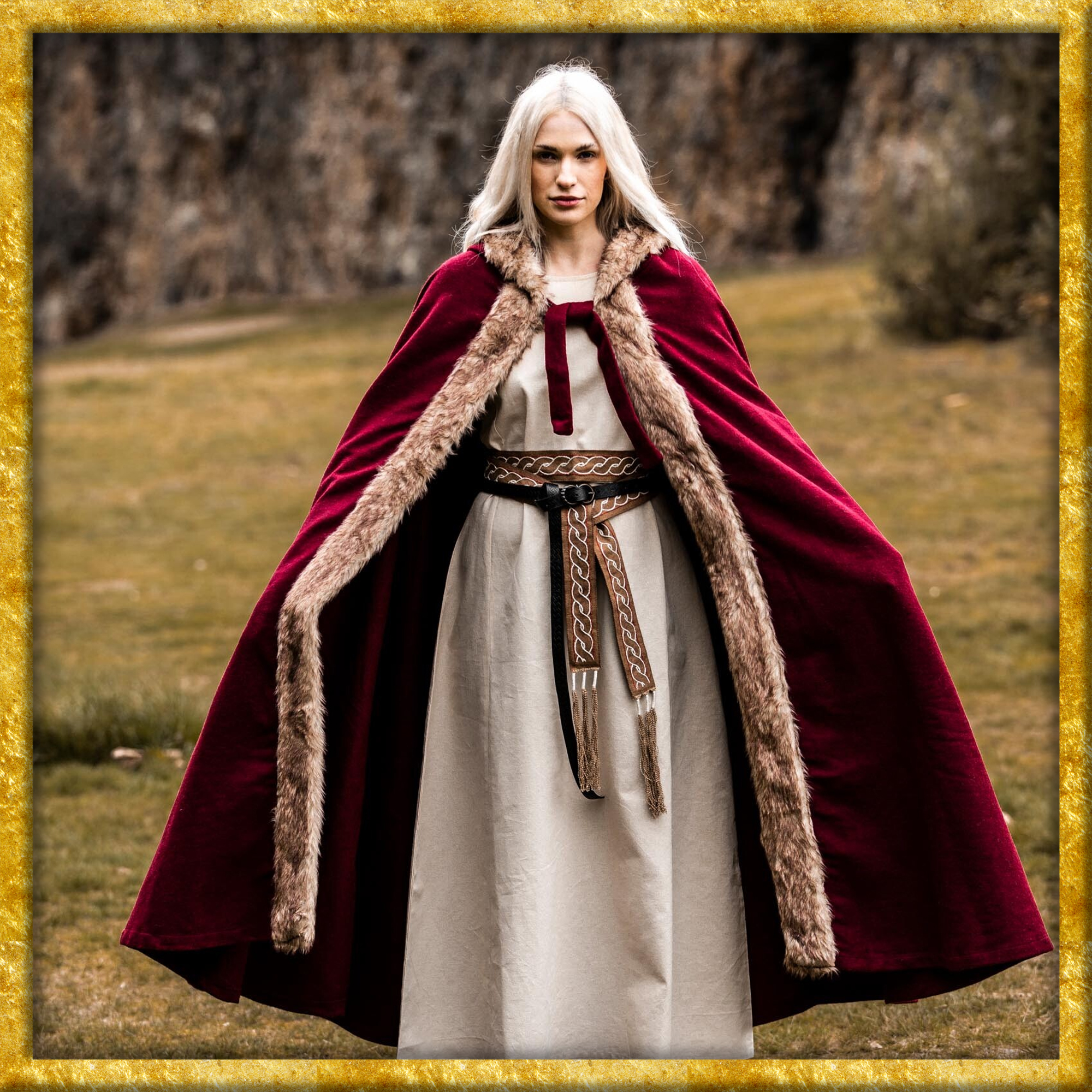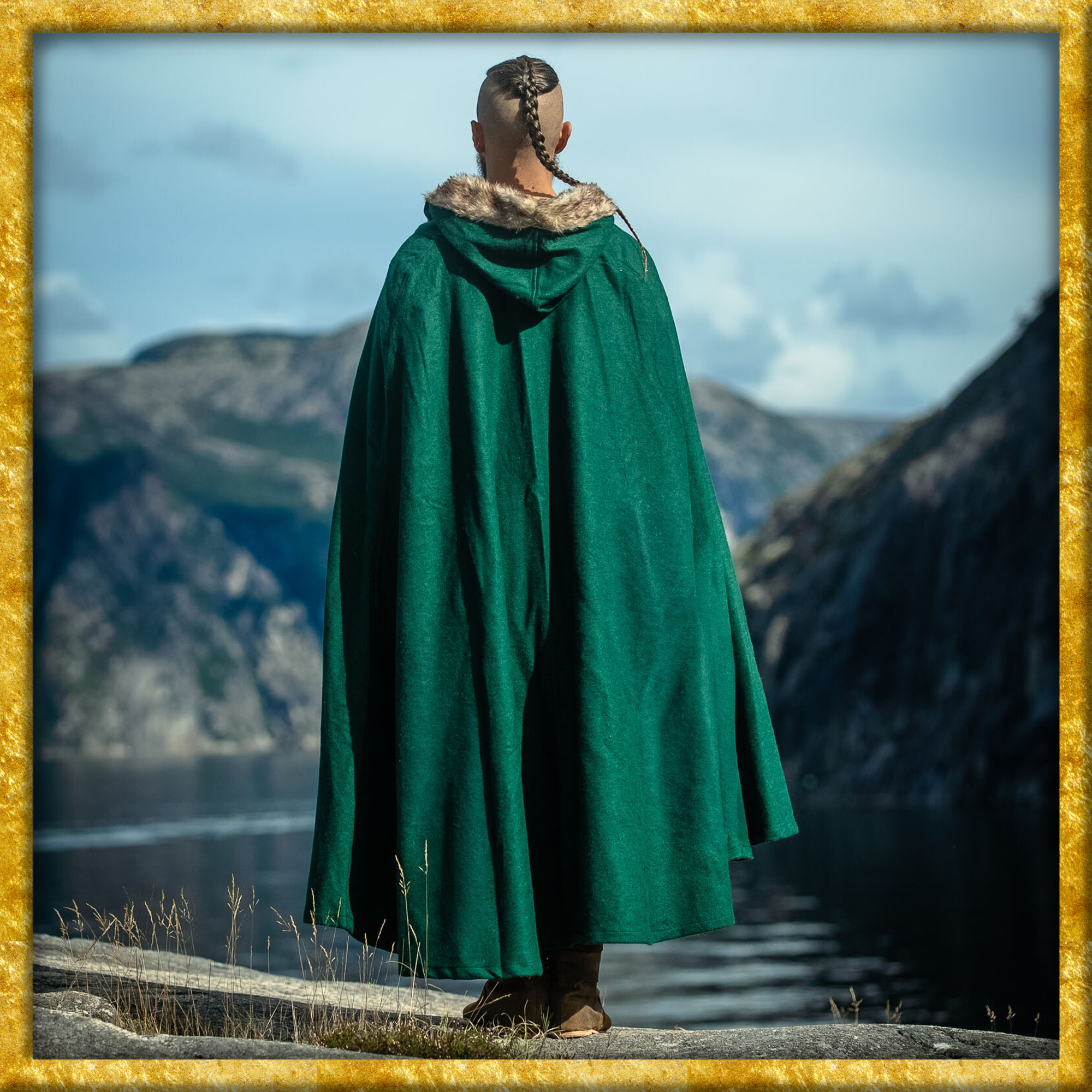 Durch das qualitativ hochwertige Wollgemisch wirkt der Umhang bei nordischem Wetter und leichtem Regen wasserabweisend. Das Kunstfell an den Konturen sorgt für eine zusätzliche Schicht Wärme und verleiht dem Umhang eine raue, rustikale Optik, die perfekt zur Wikinger-Ästhetik passt. Die kurze Kapuze bietet zusätzlichen Schutz der Kälte und vervollständigt das klassische Wikinger-Design.