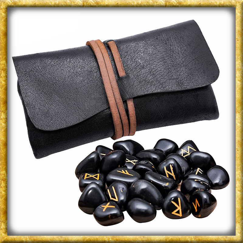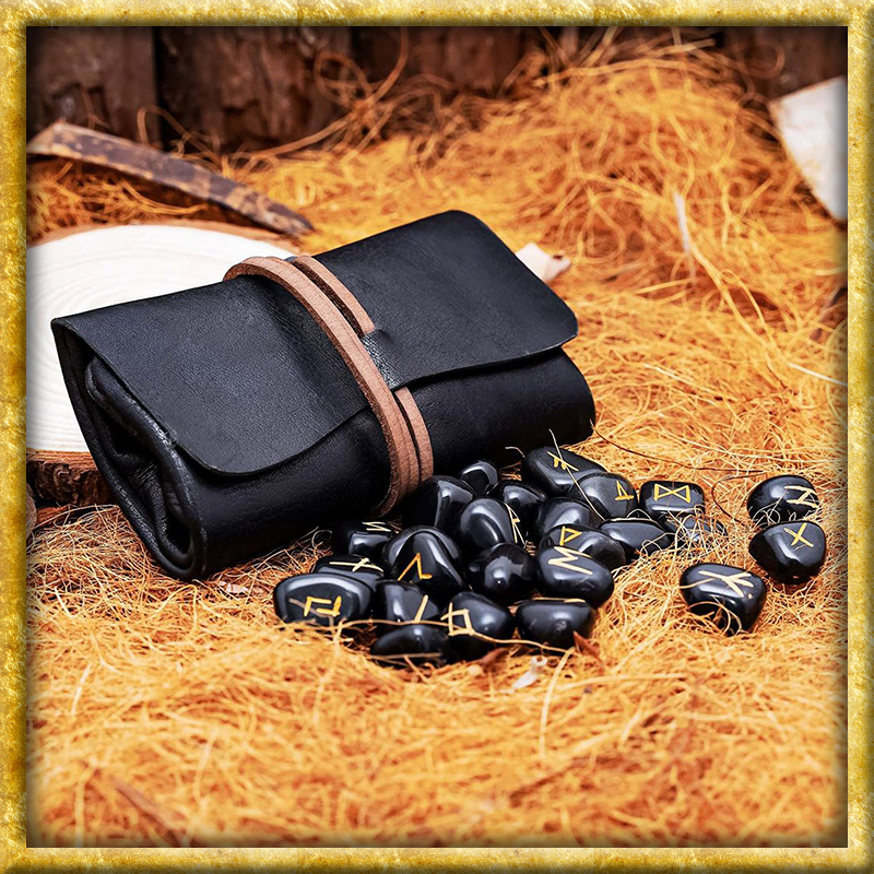 Beschreibung "Runensteine älteres Futhark mit Lederbeutel"