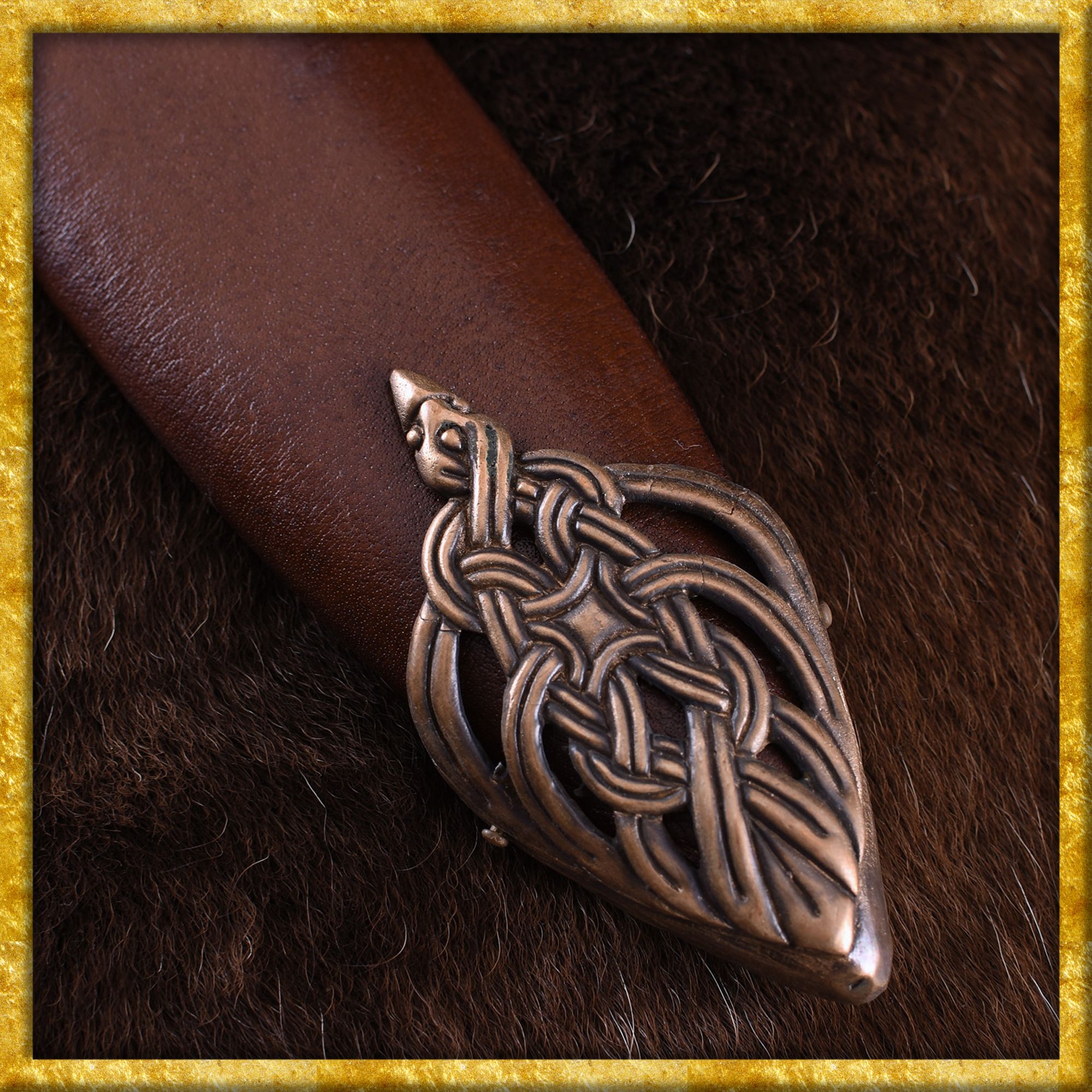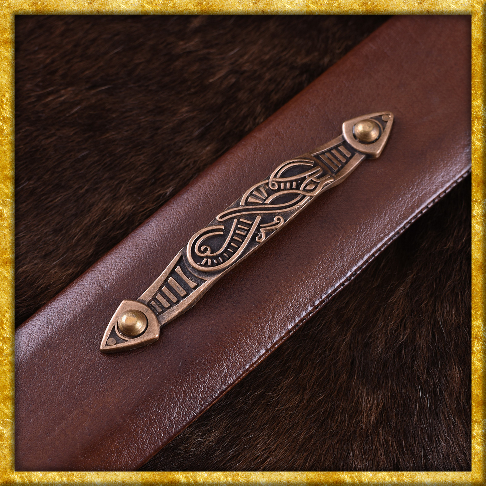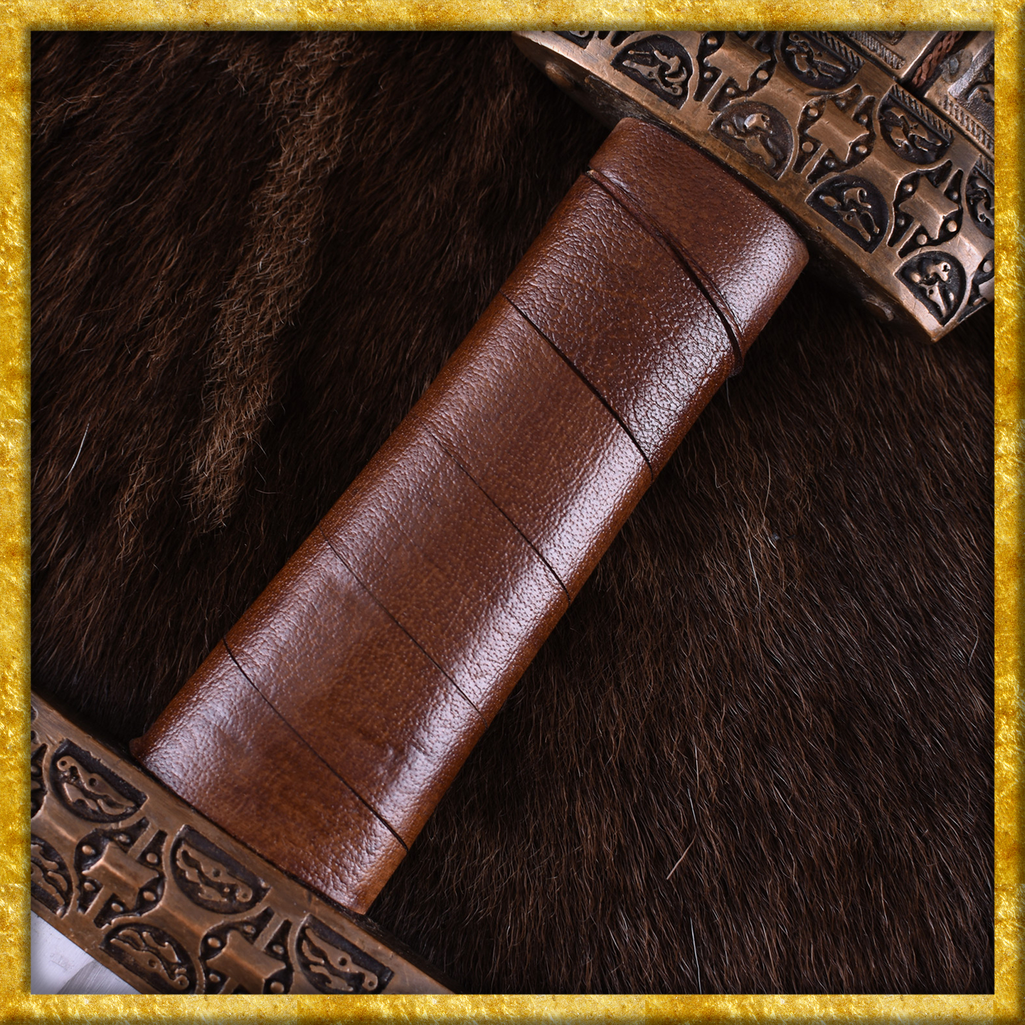 Geliefert wird dieser frühmittelalterliche Einhänder samt brauner Holz-/Lederscheide mit Mundblech, Ortband und Riemendurchzug aus Bronze. Die Gürtelschlaufe passt für Gürtel mit einer Breite von max. 6cm.