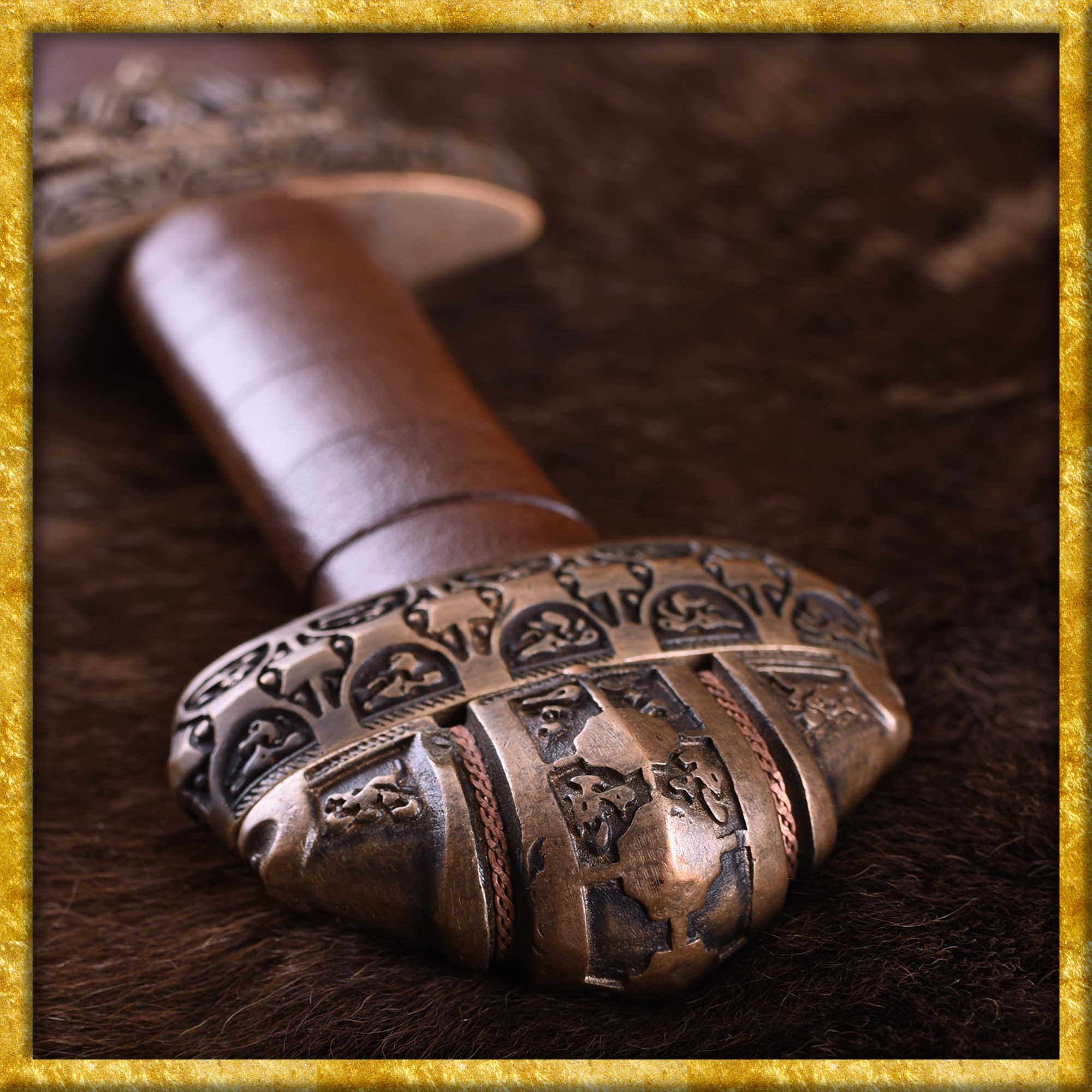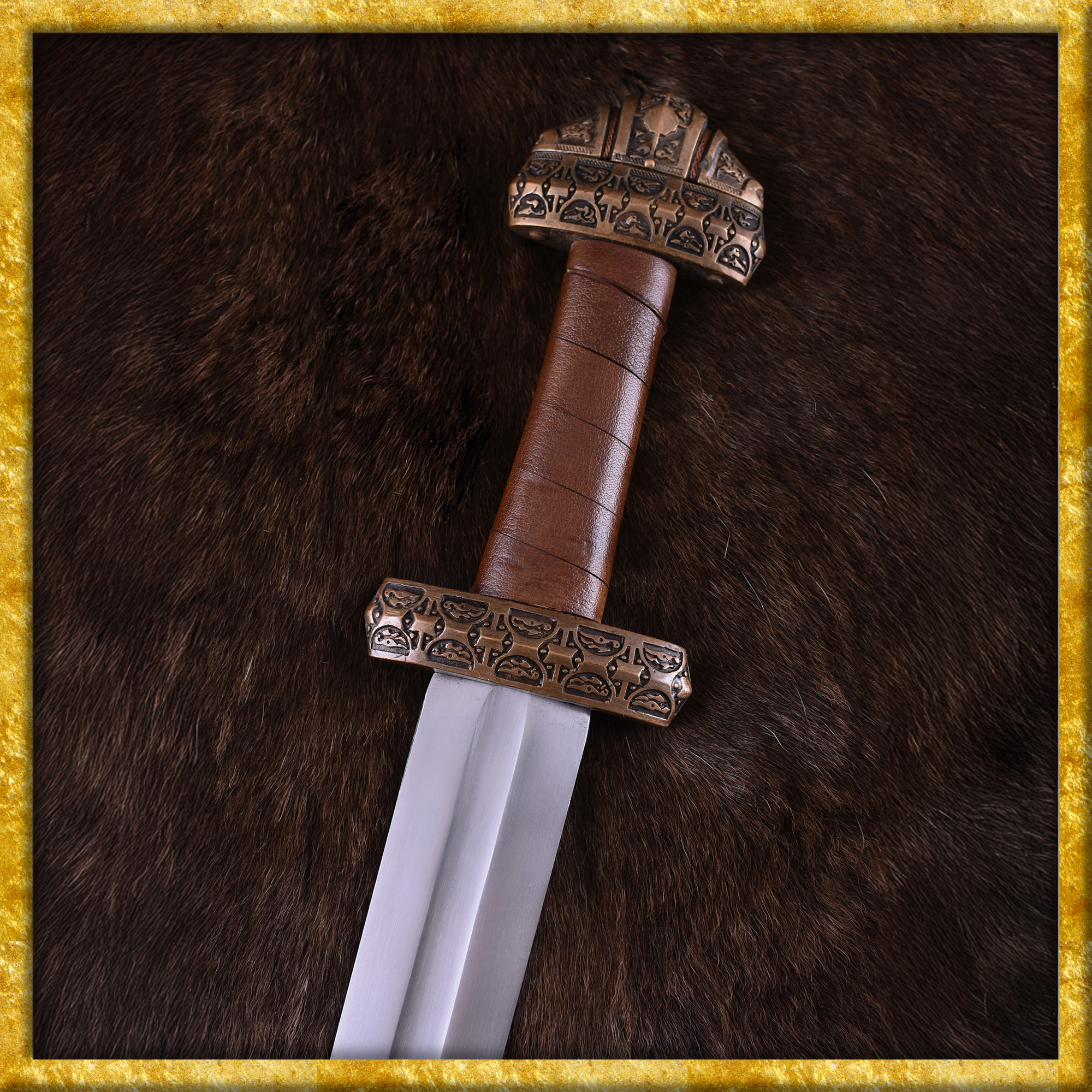 Die gerade, zweischneidige Klinge aus gehärtetem Federstahl EN45 hat eine breite Hohlkehle und ungeschärfte Schneiden. Das Heft, bestehend aus einer kurzen, ovalen Parierstange, einer mit braunem Leder bespannten Griffpartie und einem grosszügigen Knauf, ist aus Bronze gegossen. Parier und Knauf sind reich verziert. Dabei wurden hier die eingravierten, höchst detaillierten Motive und Muster, die das originale Artefakt schmückten, möglichst getreu nachgebildet.