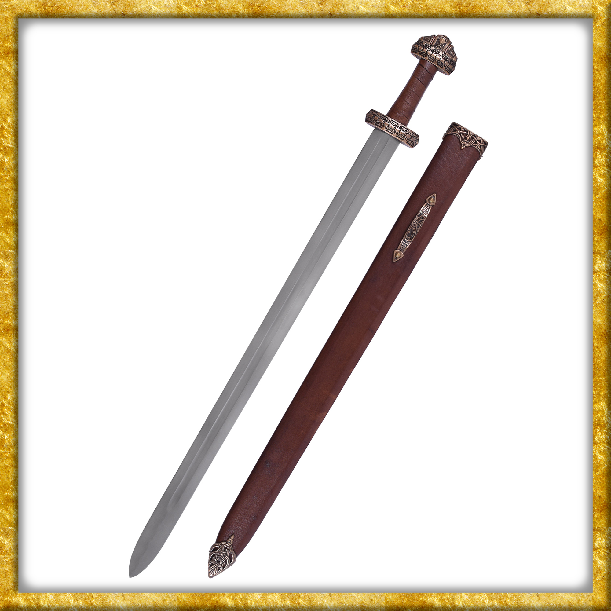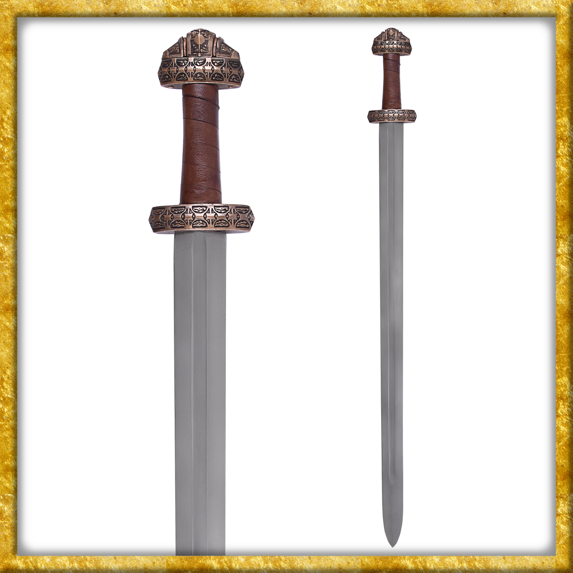 Dieses prächtige Wikingerschwert basiert auf einem silbertauschierten Bronze-Schwertgriff, welcher 1830 auf der Insel Eigg, Innere Hebriden in Schottland, ausgegraben wurde. Obwohl damals einige Klingenbruchstücke ebenfalls gefunden wurden, konnten diese nicht erhalten werden. Der originale, wunderschön detaillierte Grabfund ist im National Museum of Scotland in Edinburgh zu bewundern. Dieses auf das 9. bzw. frühe 10. Jahrhundert datierte, fein gearbeitete Stück Wikingergeschichte ist nach der Petersen Typologie für Wikingerschwerter als Typ D klassifiziert.