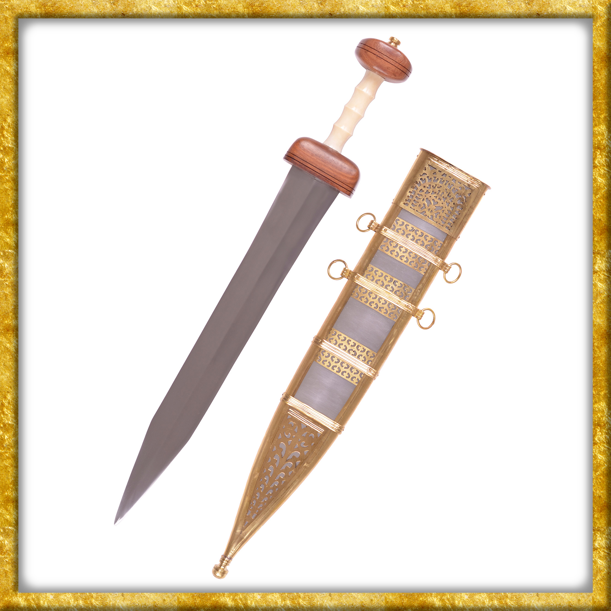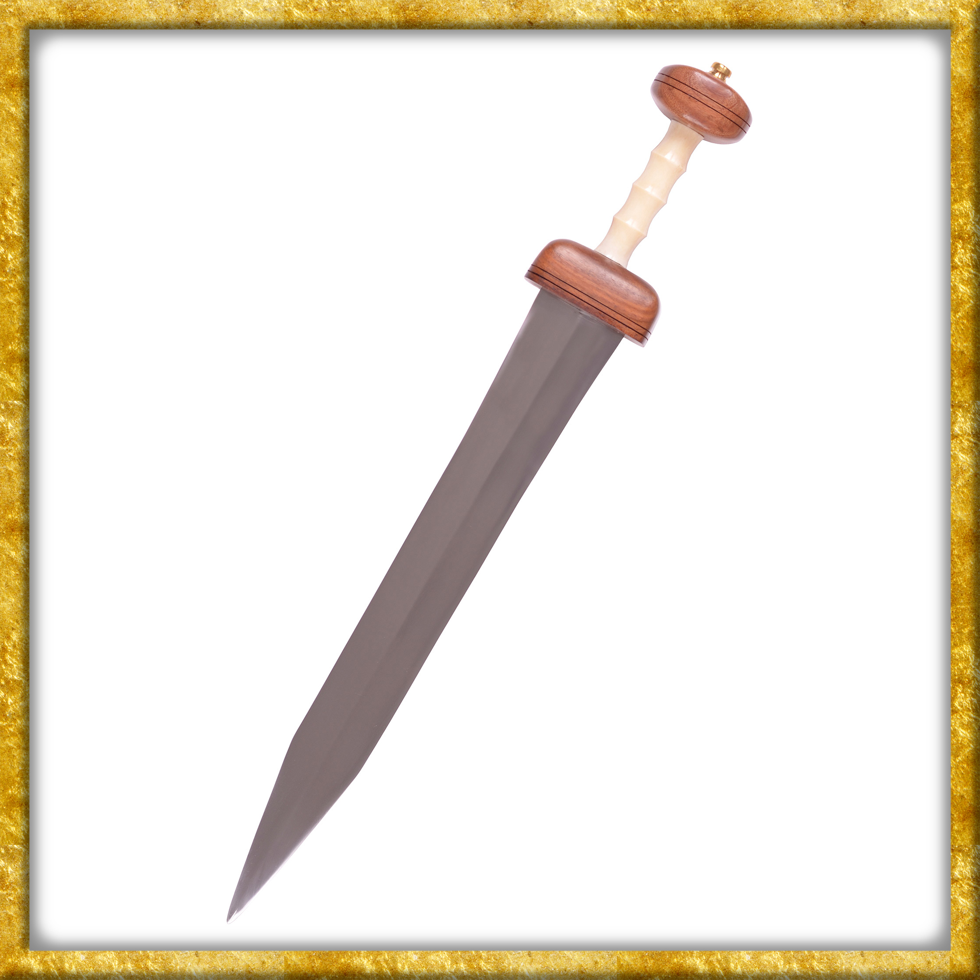 Die Klinge dieser Replik eines römischen Gladius ist aus Stahl geschmiedet. Der Griff besteht aus Knochen und Holz. Die Scheide ist mit typischen Messingapplikationen versehen und Rückseitig mit schwarzem Leder bezogen.