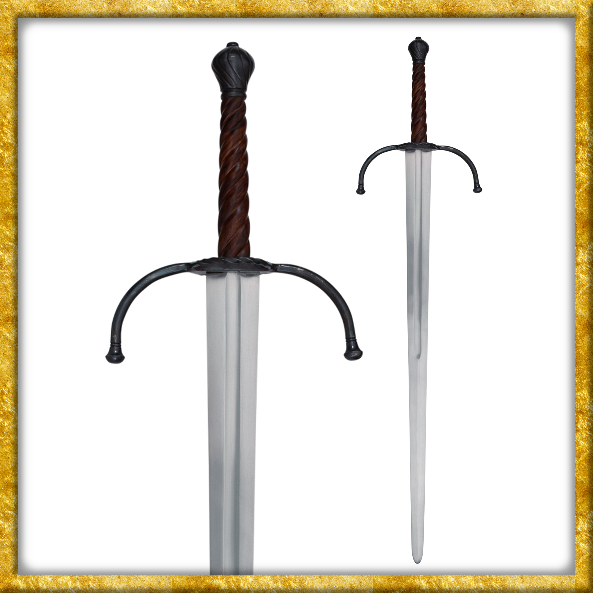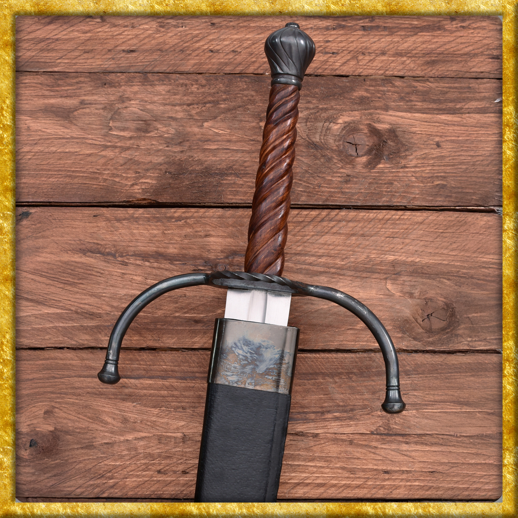 Dies ist eine sehr schöne Rekonstruktion eines spätmittelalterlichen Zweihänders. Dieses Schwert ist ausschliesslich in Handarbeit gefertigt. Die nach vorne gebogene Parierstange mit tordiertem Parierring ist aus Stahl. Der Holzgriff ist kunstvoll geschnitzt. Das Torsionsmuster findet sich hier und auch auf dem Eisenknauf wieder. Die in Öl auf ca. 48-50 HRC gehärtete Federstahlklinge geht bis zum Knauf durch und ist dort handvernietet. Der Klingenquerschnitt ist rautenförmig. Die Klingenspitze und die Schneiden sind stumpf und abgerundet.