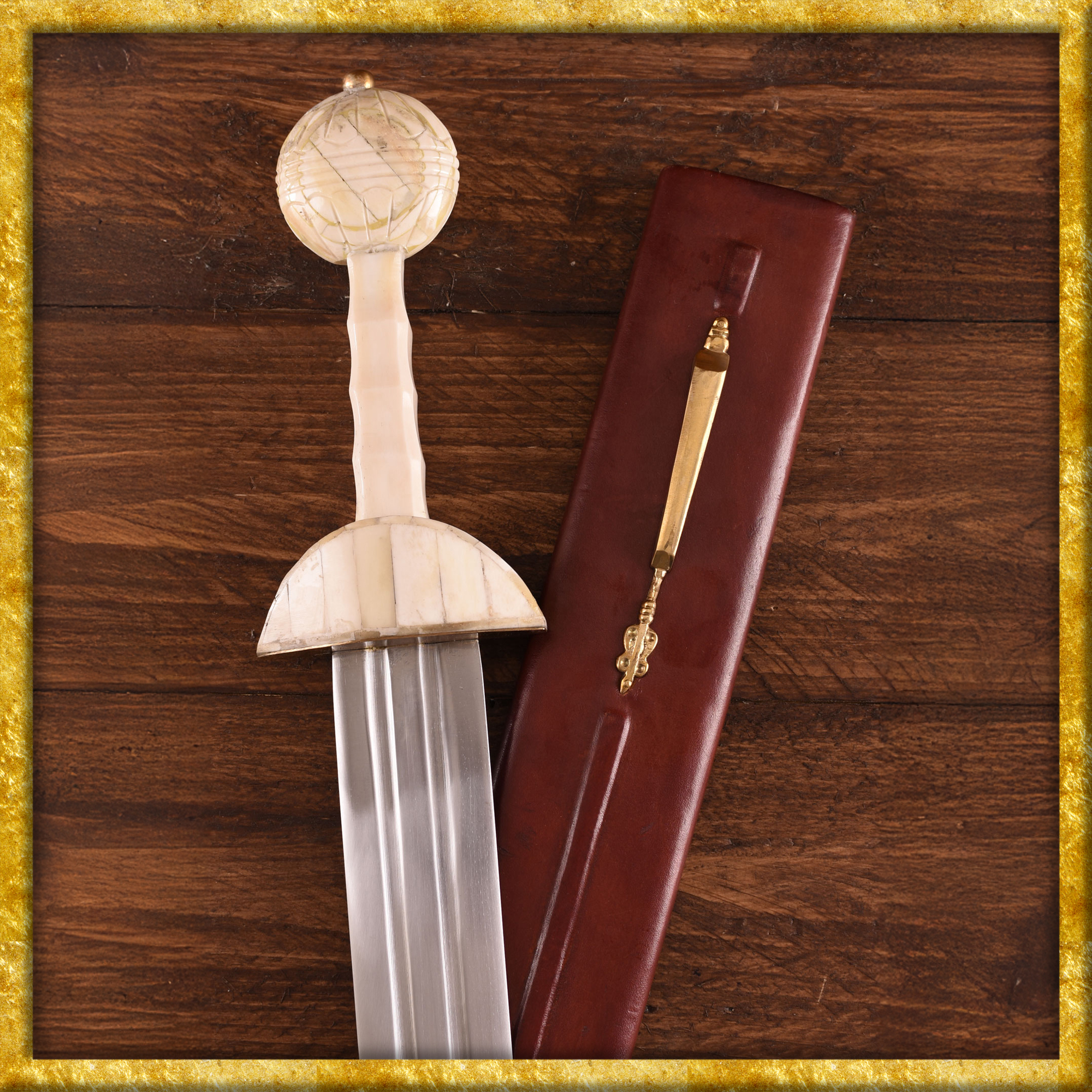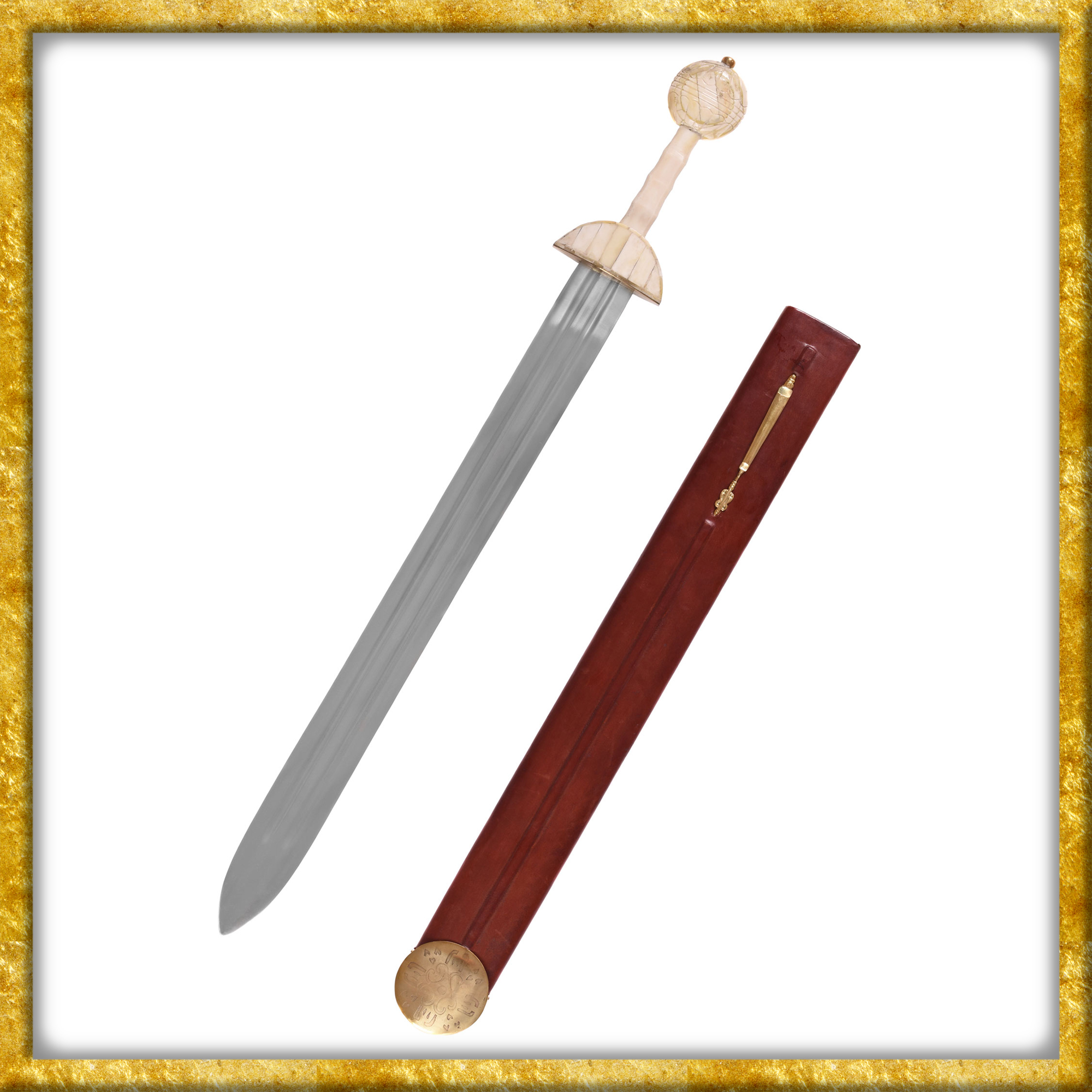 Bei dieser Replik handelt es sich um eine Rekonstruktion einer Spatha aus dem 3. Jahrhundert n. Chr. Die Klinge ist aus Stahl geschmiedet und der Griff aus Tierknochen gefertigt. Die Holzscheide ist mit rotem Leder umschlagen red leather und mit authentischen Messingbeschlägen verziert.
