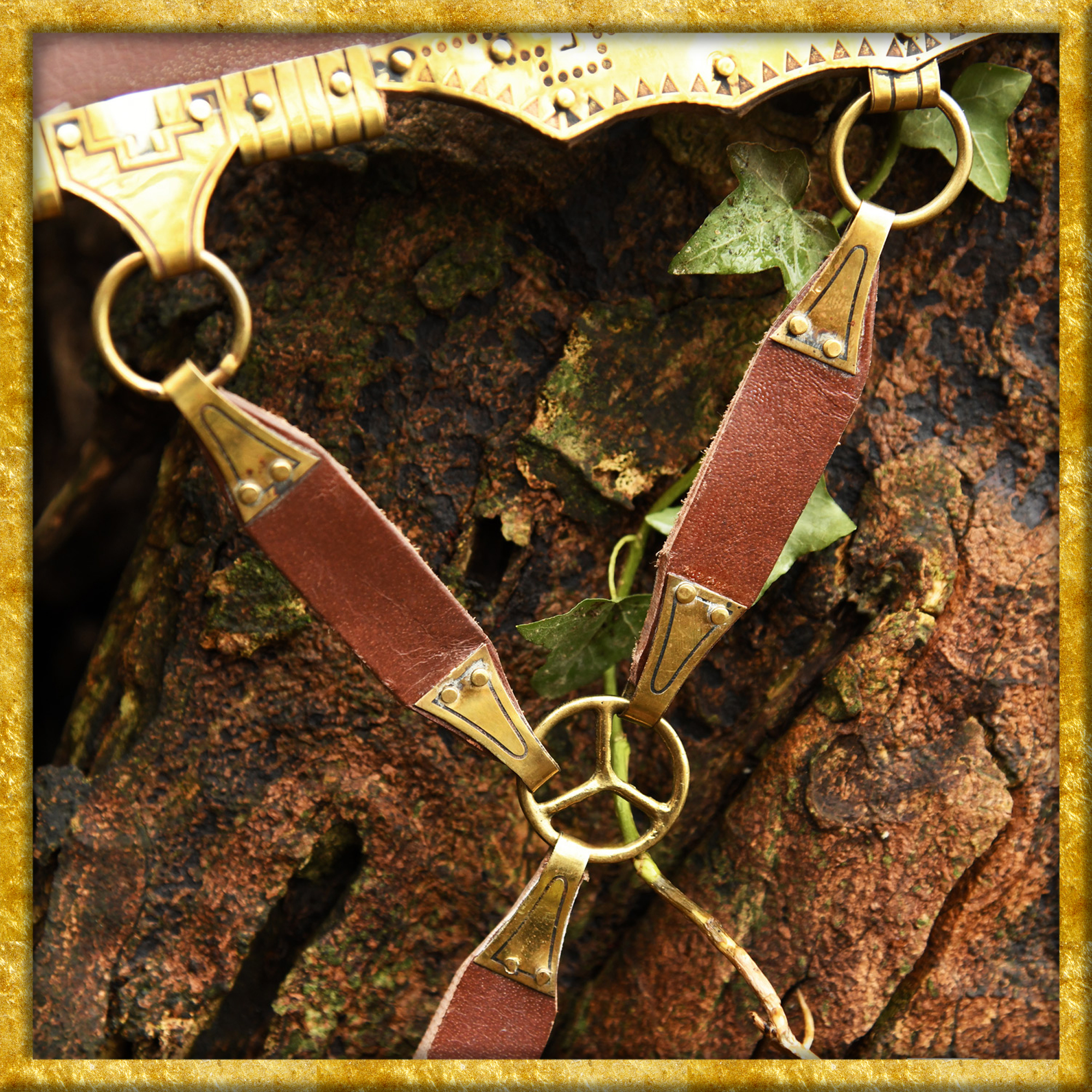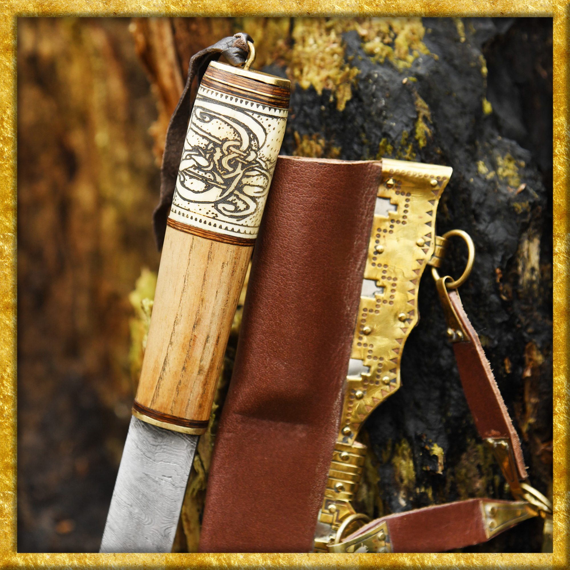 Zum Lieferumfang gehört eine wunderschöne Scheide aus gegerbtem Leder mit reich verzierten Messingbeschlägen. Das Tragesystem besteht aus zwei Tragringen, einem Riemenverteiler und drei Lederriemen. In der Wikingerzeit waren Tragesysteme dieser Art weit verbreitet. Der Riemenverteiler diente dazu, die einzelnen Riemen so zu verteilen, dass das Schwert, bzw. das Saxmesser für ein schnelles Herausziehen aus der Scheide in einem optimalen Winkel am Gürtel getragen werden konnte.
