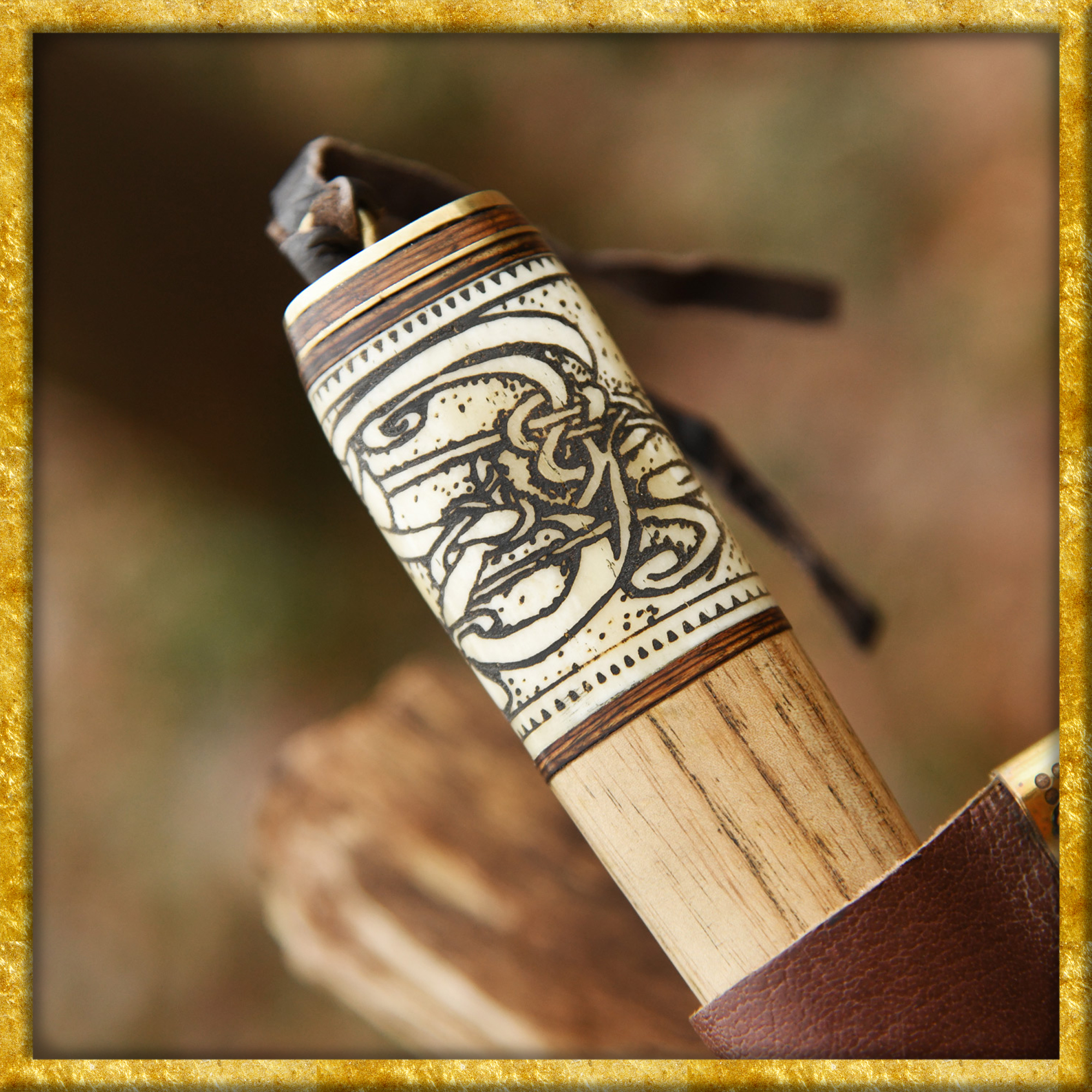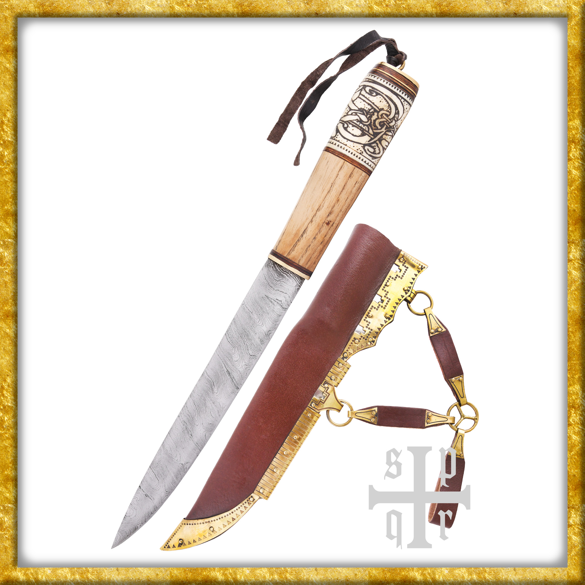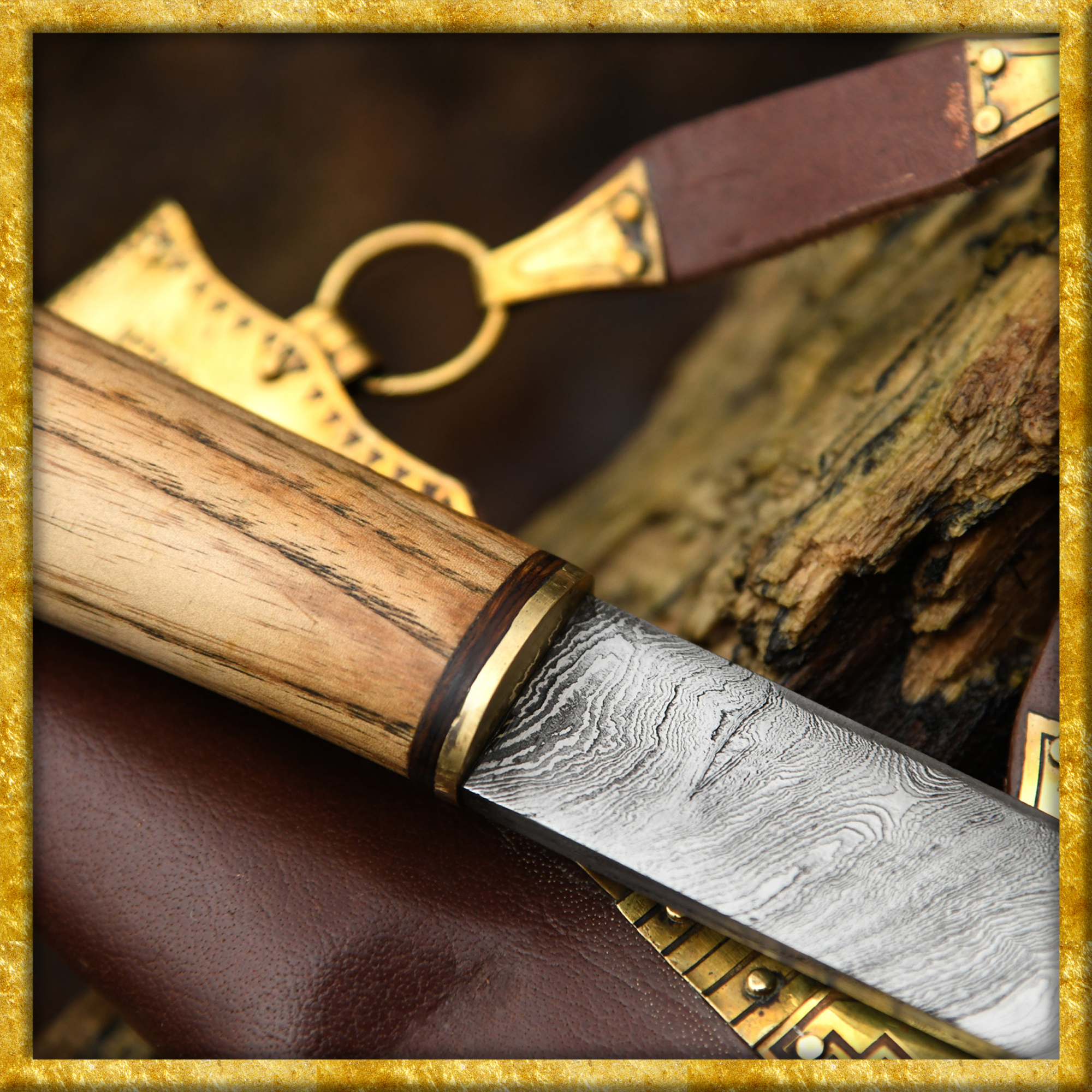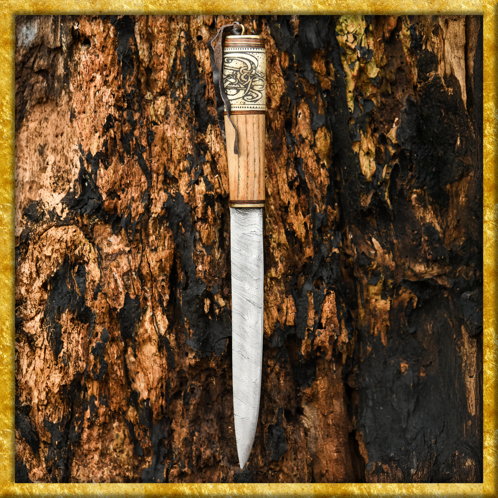 Dieses handgefertigte wikingerzeitliche Messer, auch Sax genannt, besitzt eine scharfe Klinge aus 256-Lagen-Damaststahl. Das untere Drittel des Holzgriffes besteht aus Knochen und ist mit einem schönen Knotenmuster verziert. Griff-Endkappe und -Zwinge sind aus Messing gefertigt.