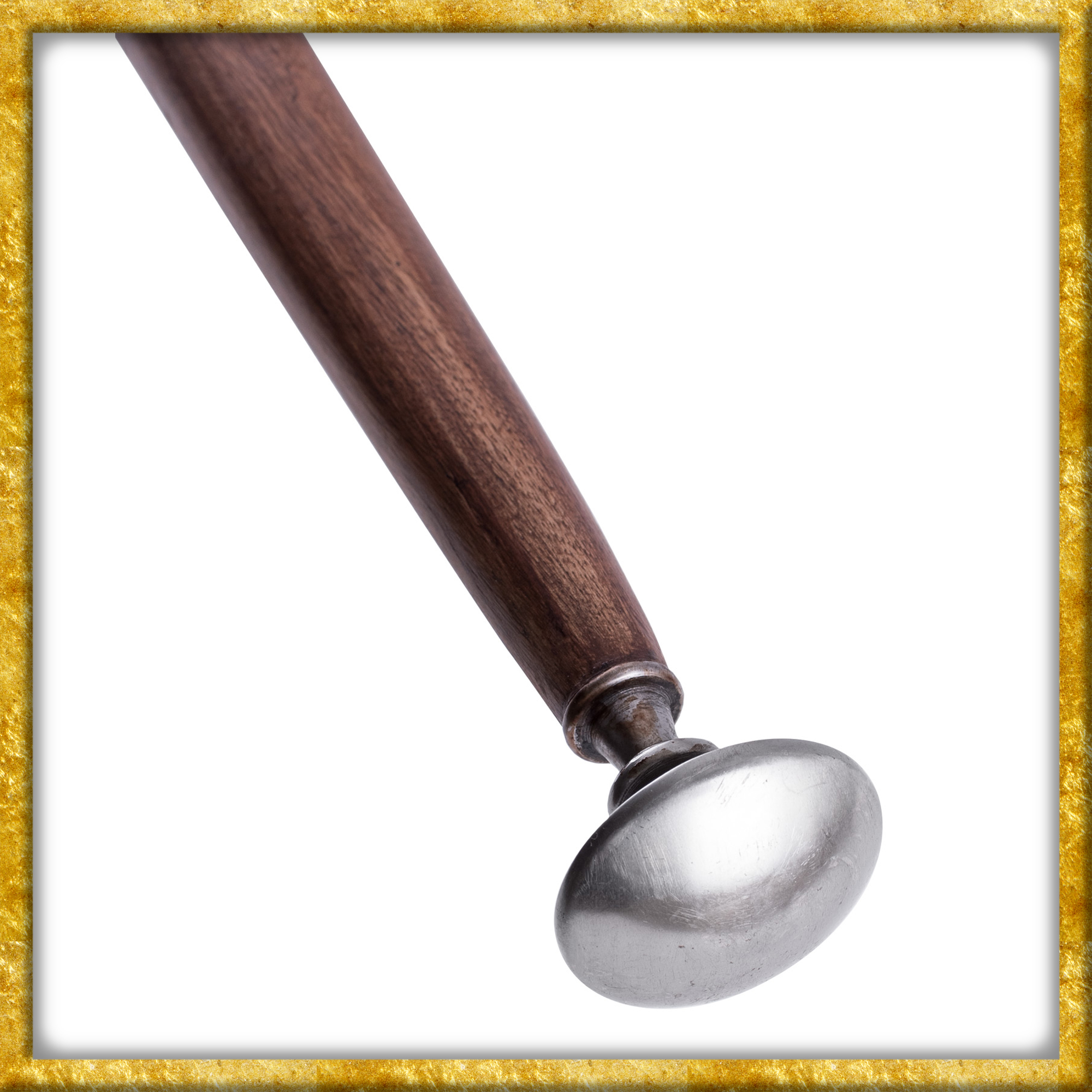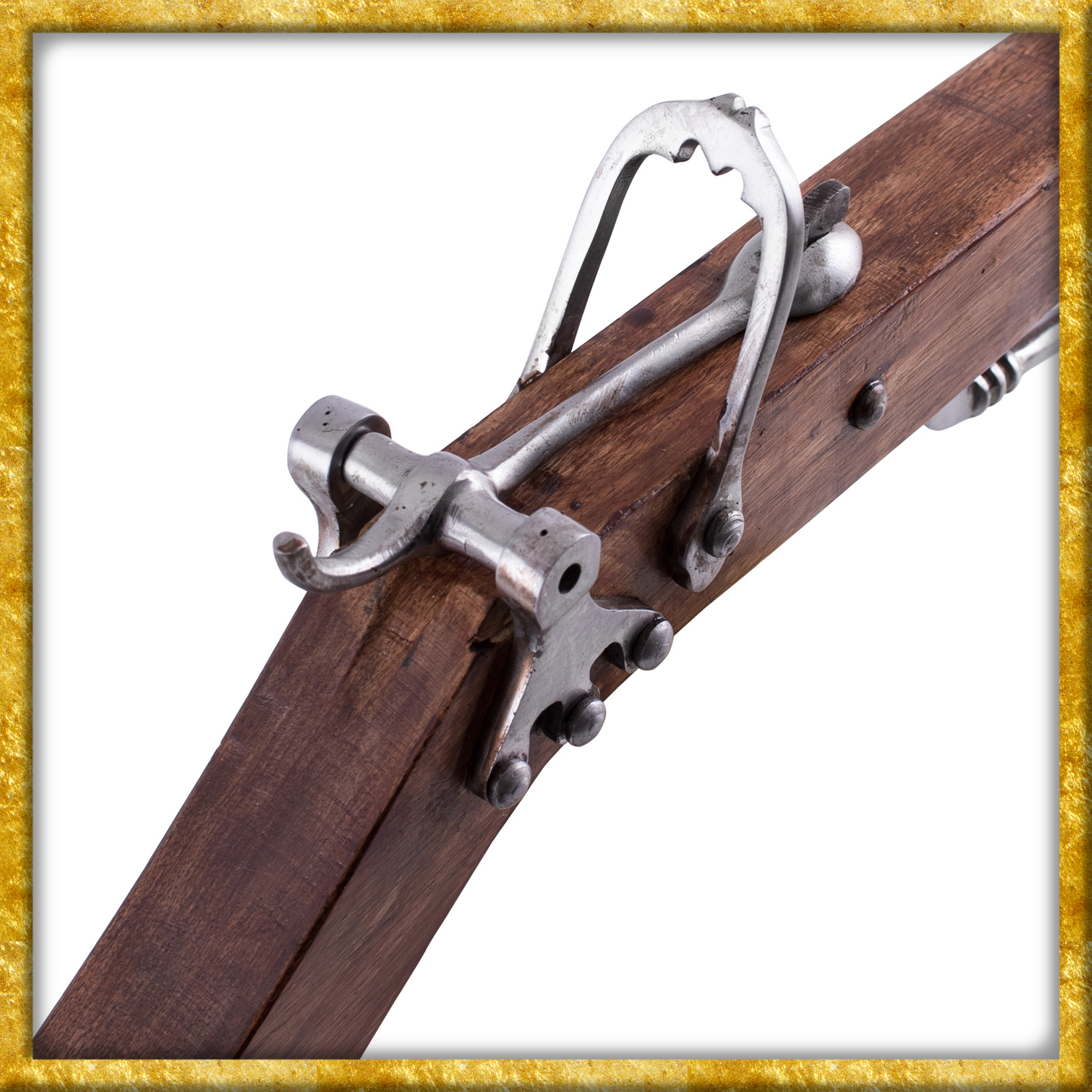 Diese dekorative Rekonstruktion eines sogenannten Kugelschneppers aus dem späten Mittelalter bzw. der Renaissance, auch als Kugelschnäpper, Balester, Vogelschnepper oder Kugelarmbrust bekannt, besitzt einen ledergebundenen Holzbogen und einen Holzschaft. Der Schloss, der Abzug und alle weitere Beschläge sind aus Stahl gefertigt. Die Bogenlänge dieser Armbrust beträgt 80cm.