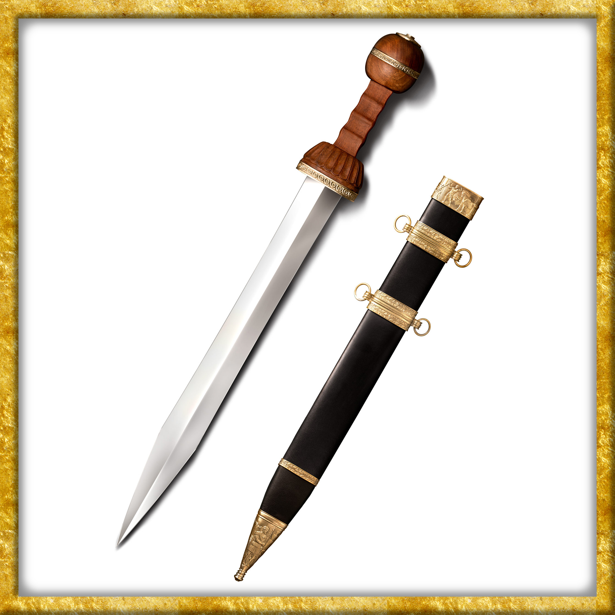Diese Interpretation eines römischen Gladius von Cold Steel® ist keine Reproduktion eines bestimmten antiken Gladius, sondern eine Sammlung der wichtigsten Merkmale dieses historischen Schwertes. Die Klinge zum Beispiel hat die traditionelle Form, ist aber im Gegensatz zur antiken Version aus Kohlenstoffstahl mit Federhärtung gefertigt. Sie ist auf beiden Seiten vollständig geschliffen und hochglanzpoliert. Die Spitze ist lang, aber stabil genug, um nicht zu verbiegen oder zu brechen. Der Griff ist aus Palisanderholz geschnitzt und im klassischen Stil verziert.