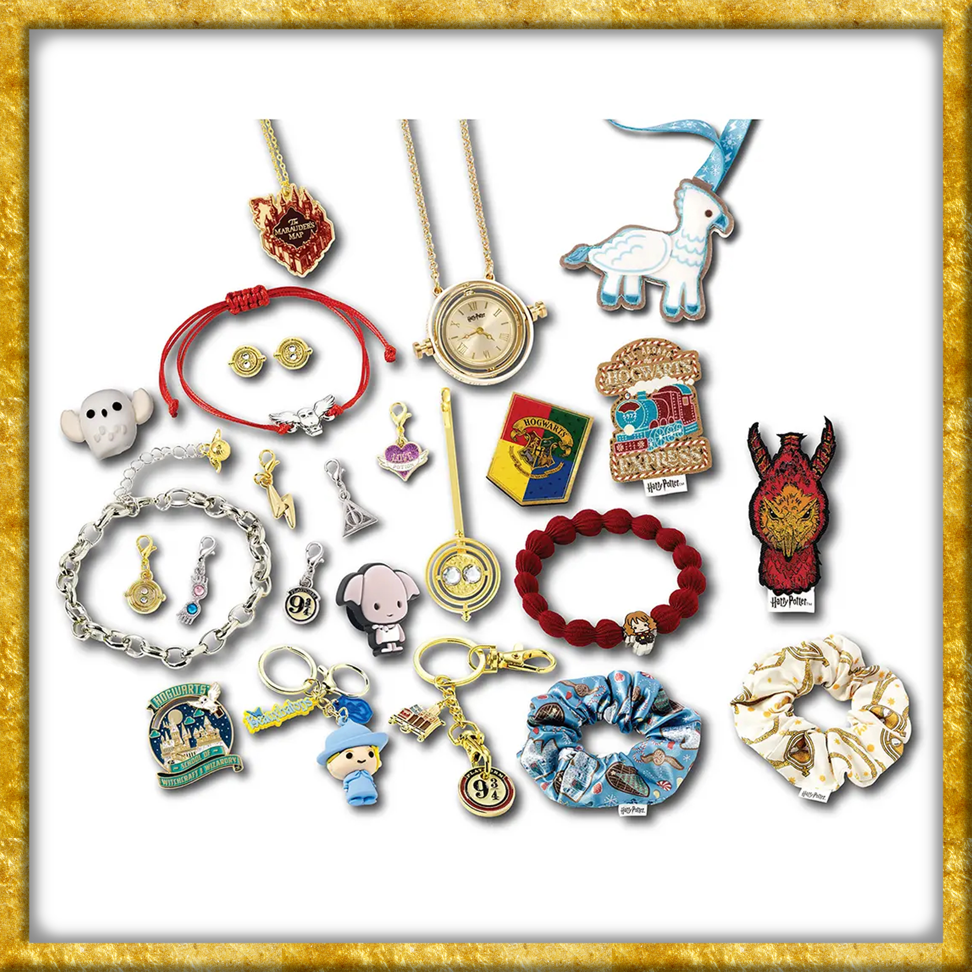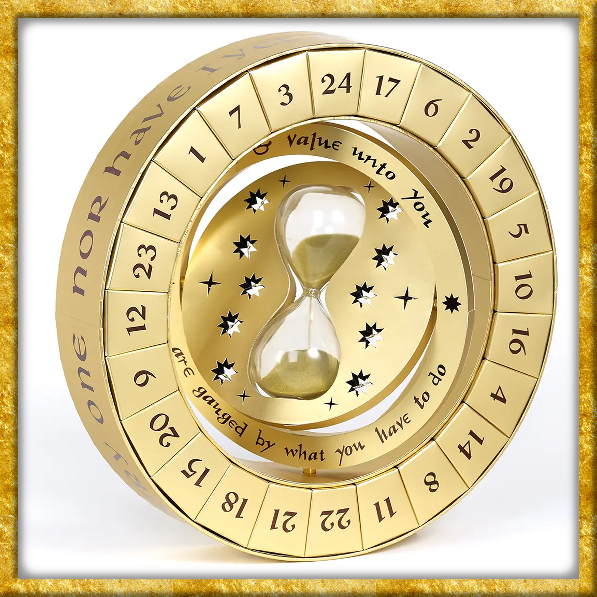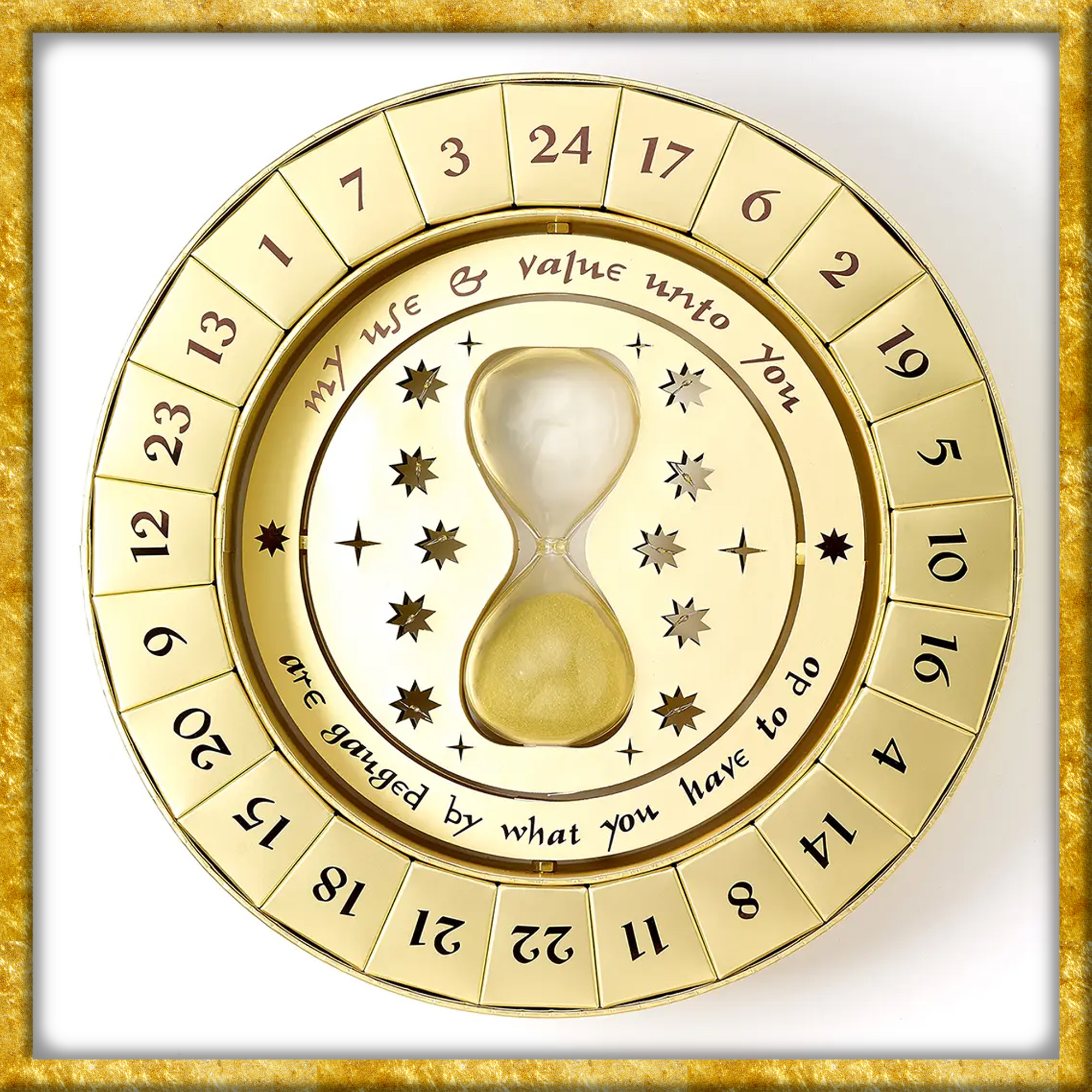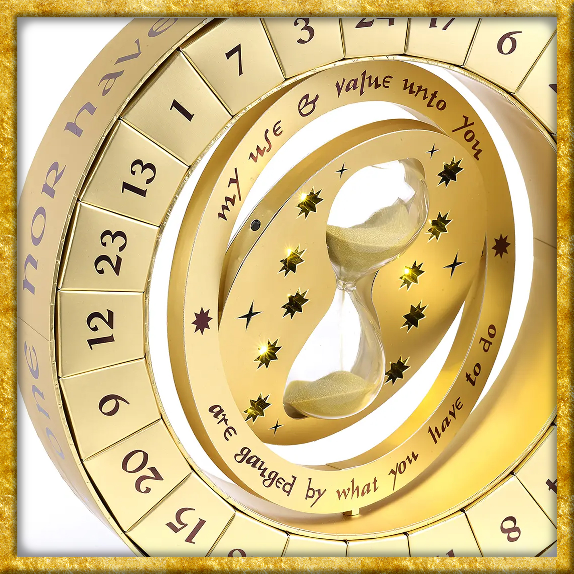Offiziell lizenzierter Adventskalender mit 24 Geschenkartikeln zum Thema Harry Potter. Dieser in Gold gehaltene, magische Kalender ist ganz dem verblüffenden Zeitumkehrer gewidmet. In der Mitte befindet sich die Sanduhr, welche voll funktionsfähig ist. Aussen befinden sich die 24 Boxen, in welchen kleine Geschenke wie Haargummis, Anhänger oder Pins aufbewahrt sind.