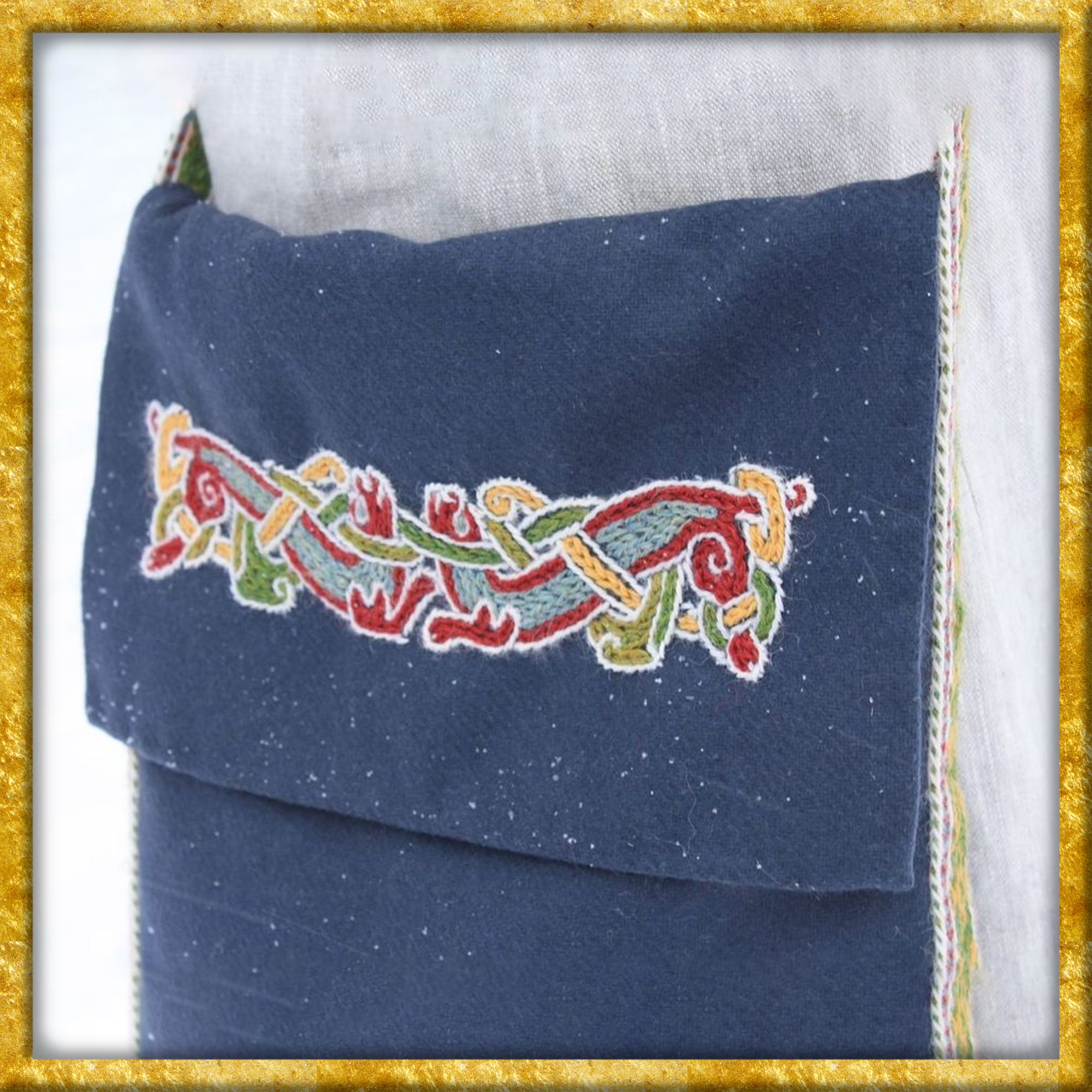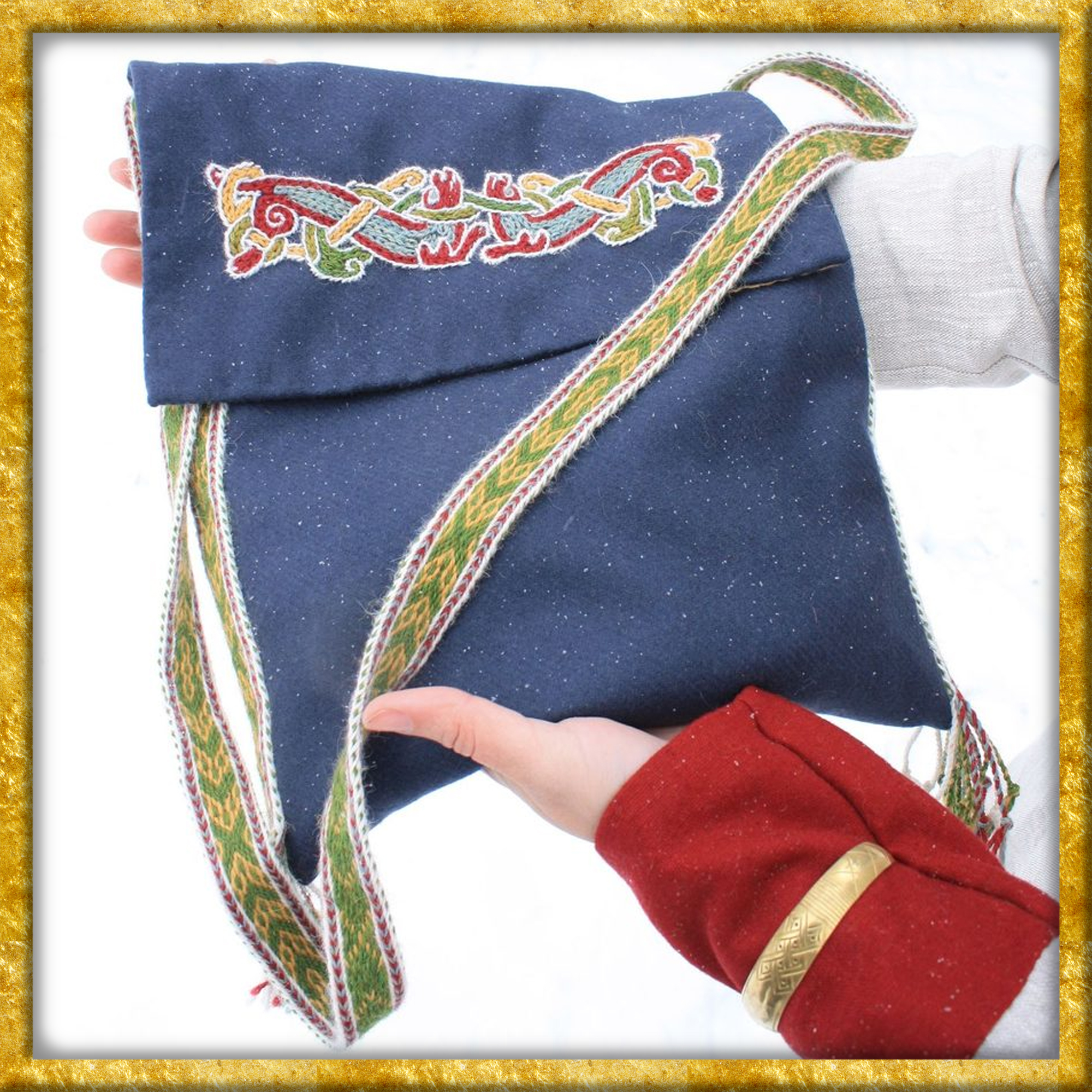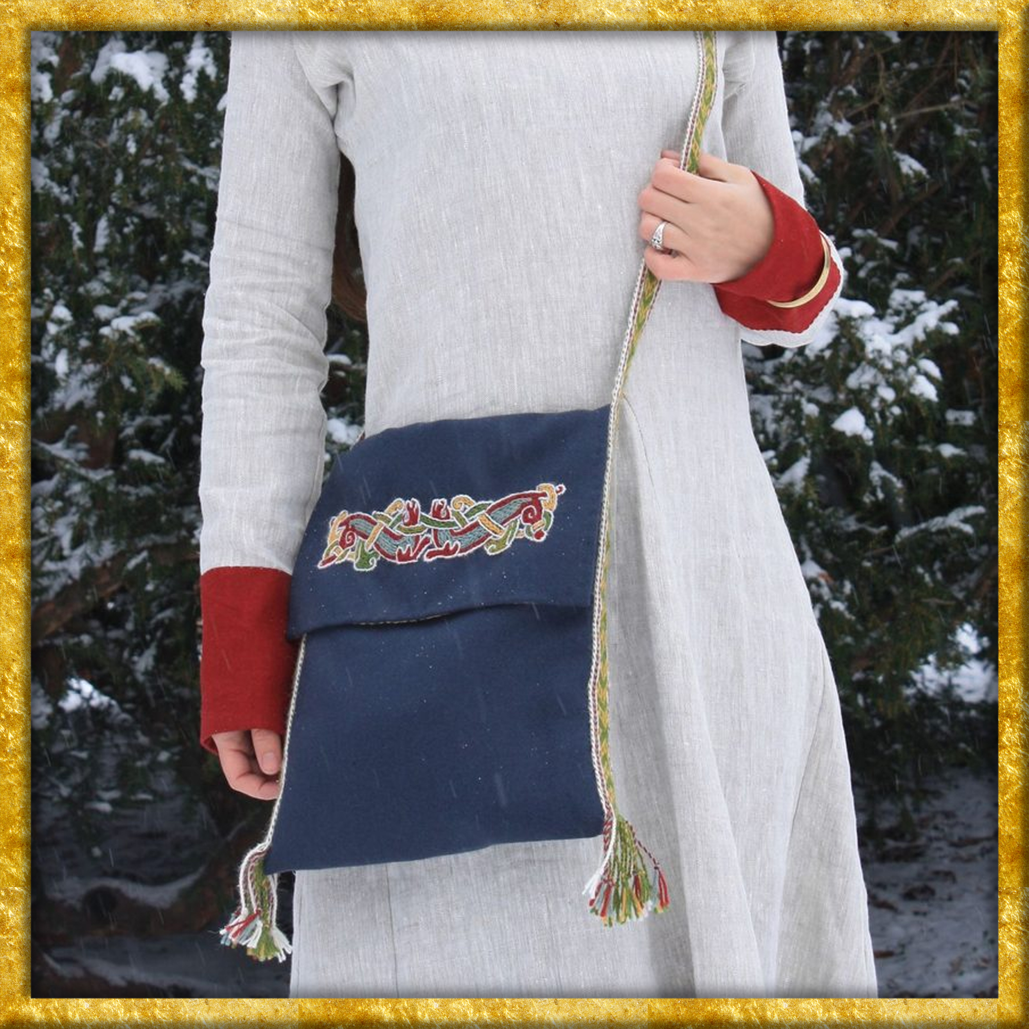 Diese wundervolle Wikinger Umhängetasche, wie auch der beeindruckende Riemen, sind aus Wolle handgefertigt. Die Tasche verfügt zudem über eine Fütterung durch Leinen. Die wunderschöne Stickerei ist ganz der Wikingerzeit verschreiben. Dadurch erweckt diese aussergewöhnliche Tasche die Kunstform der Wikinger zum Leben.
