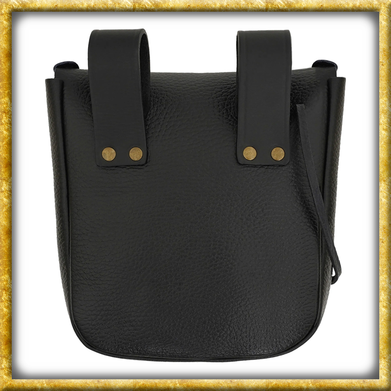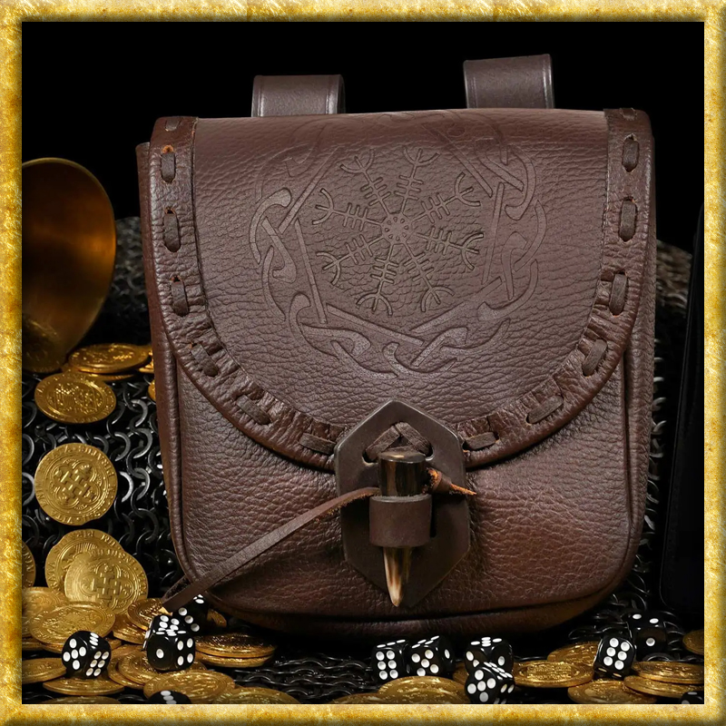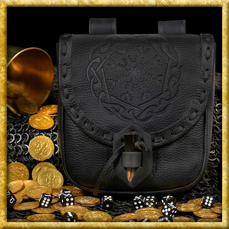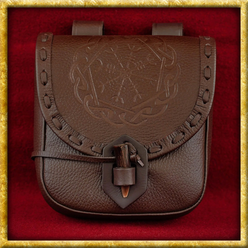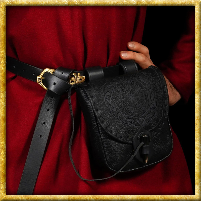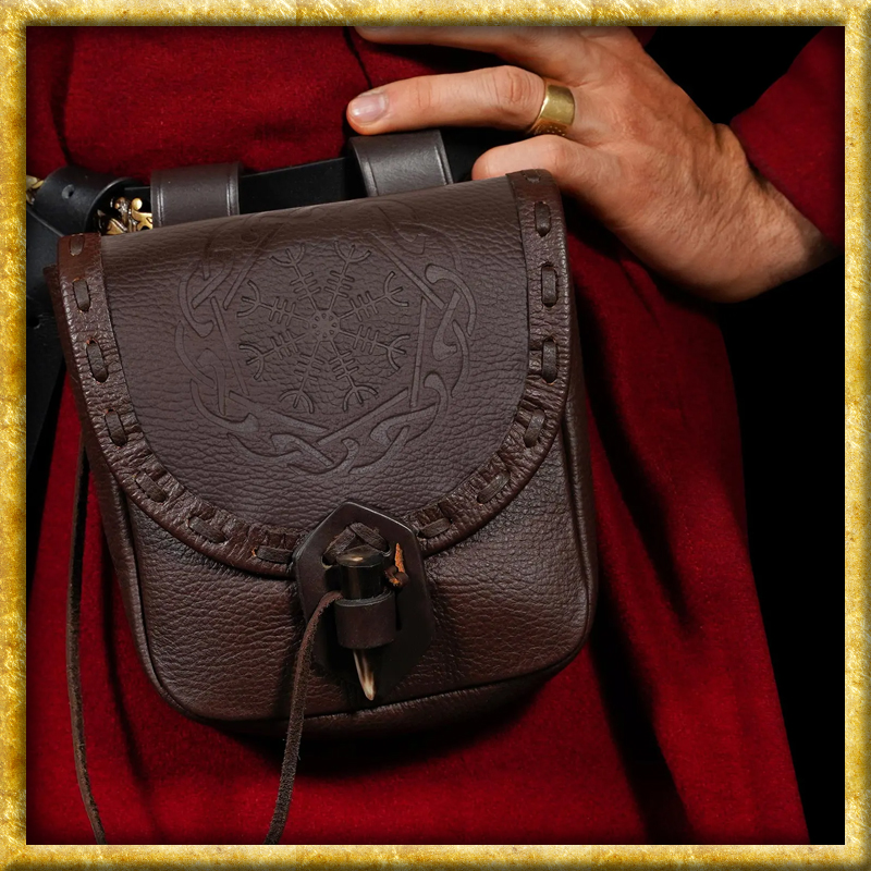 Diese Wikinger Gürteltasche ist aus echtem Leder in Handarbeit hergestellt und zeigt auf der Vorderseite das geprägte Motiv Aegishjalmur. Die sehr geräumige Tasche wird mit einem Verschluss aus echtem Horn verschlossen. Der Hornverschluss ist mit einem Lederband verbunden, damit er nicht verloren geht. Auch das die Tasche nicht genäht, sondern mit Lederbändern zusammengebunden ist, unterstützt das historische Aussehen. Die Tasche ist in braunem und schwarzem Leder verfügbar.