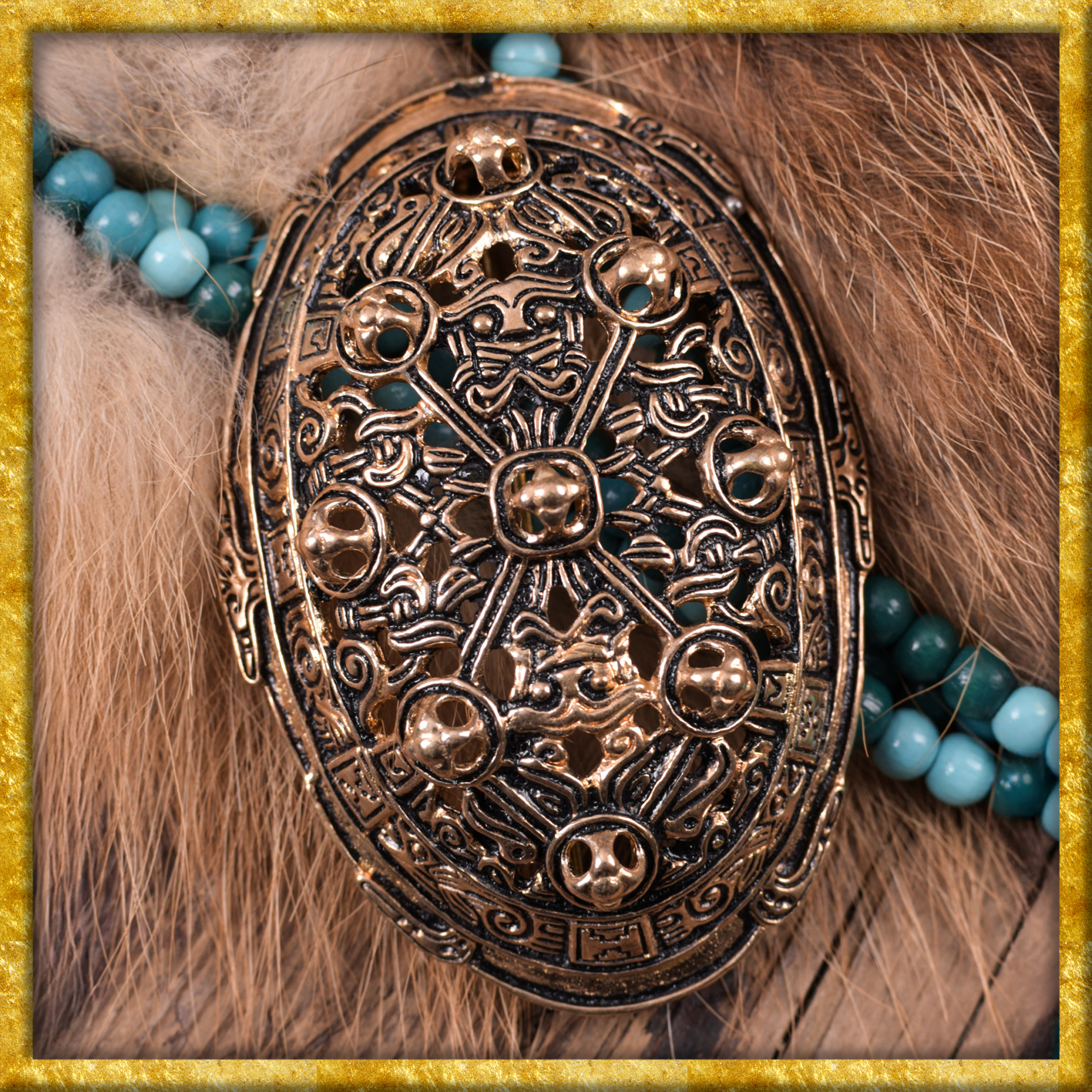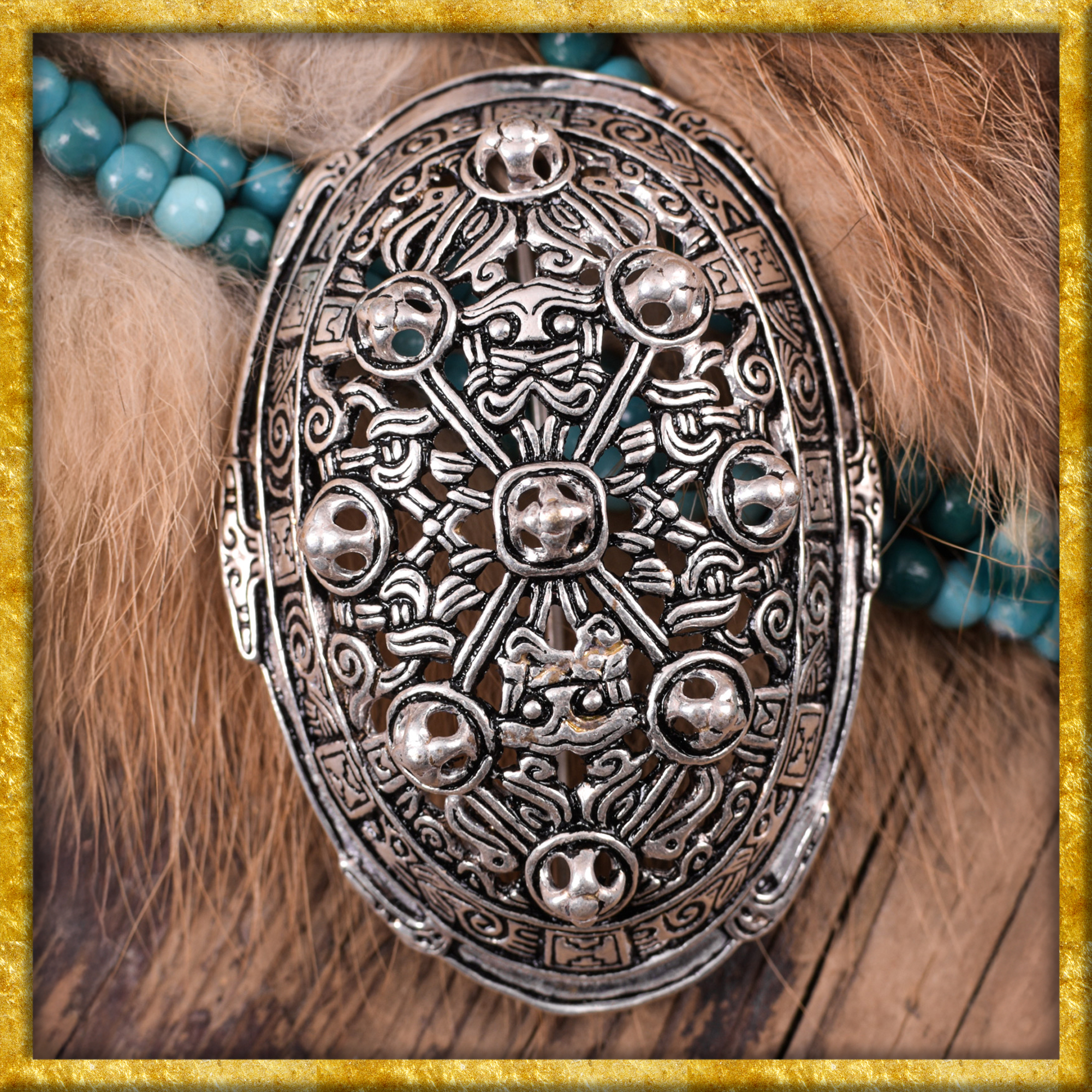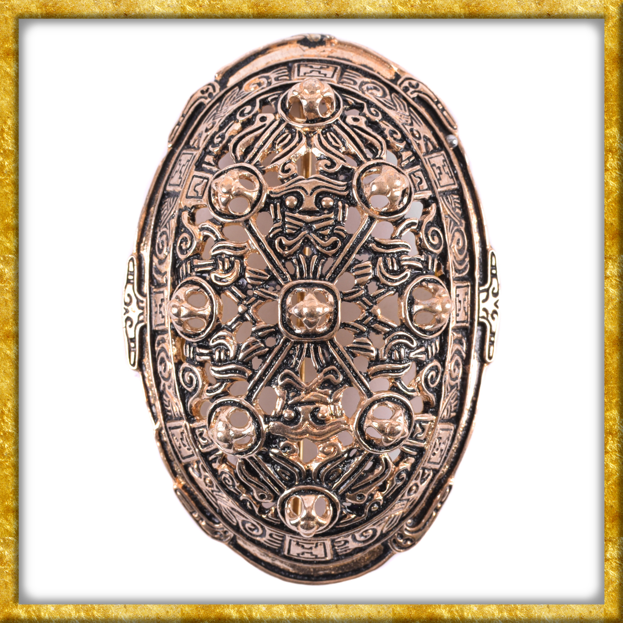 Diese Schalenfibel ist ein wahres Schmuckstück aus der Wikingerzeit, detailgetreu und sehr genau gearbeitet, aus Bronze oder versilbert erhältlich. Auf der Rückseite dieser wikingerzeitlichen ovalen Gewandschliesse befinden sich eine stabile Nadel und eine Öse zur Befestigung an der Kleidung.