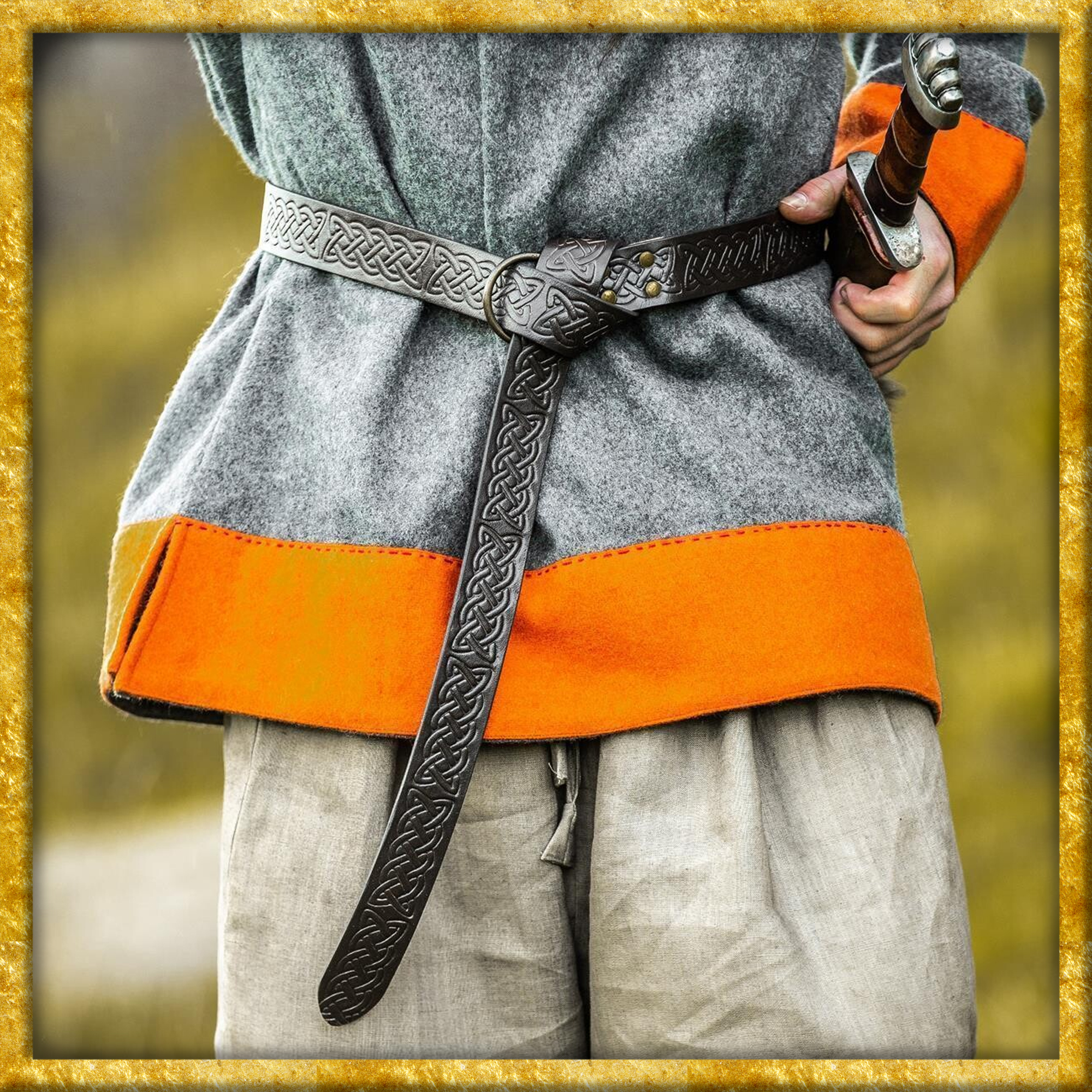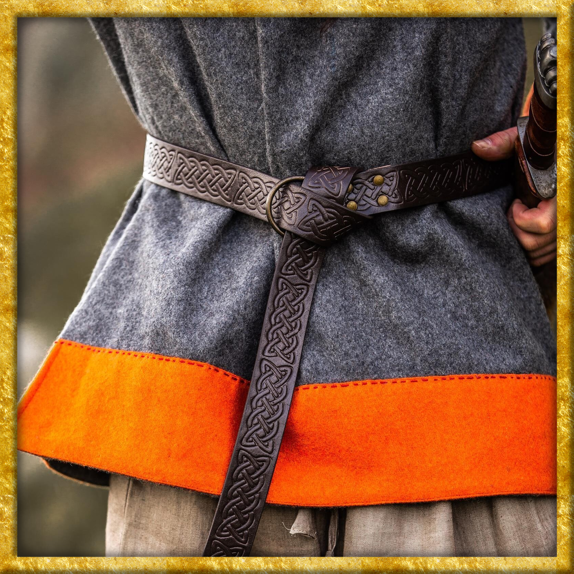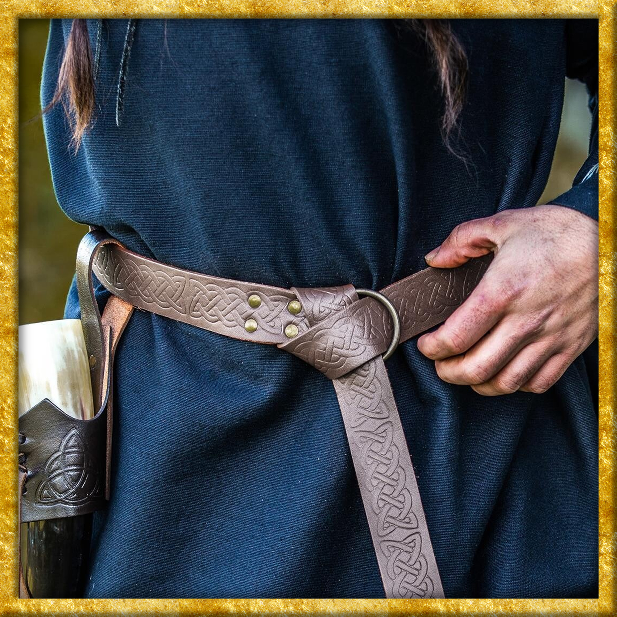 Dieser keltische Gürtel aus Glattleder verfügt über eine durchgehende keltische Prägung. Er wurde in Handarbeit aus dickem und robustem Glattleder gefertigt.
