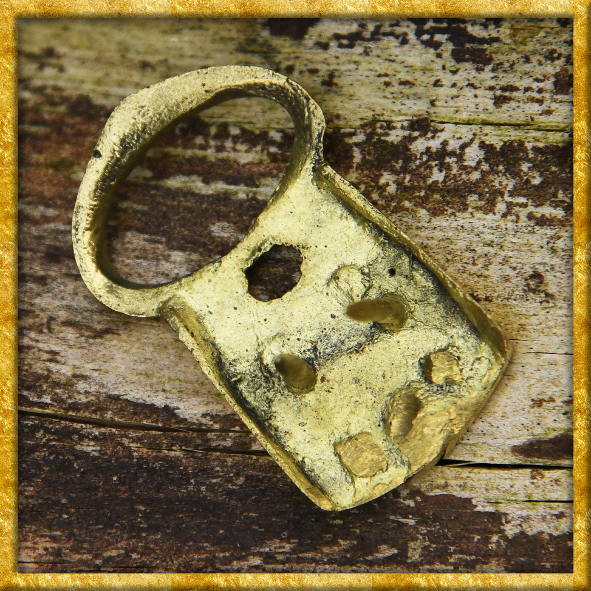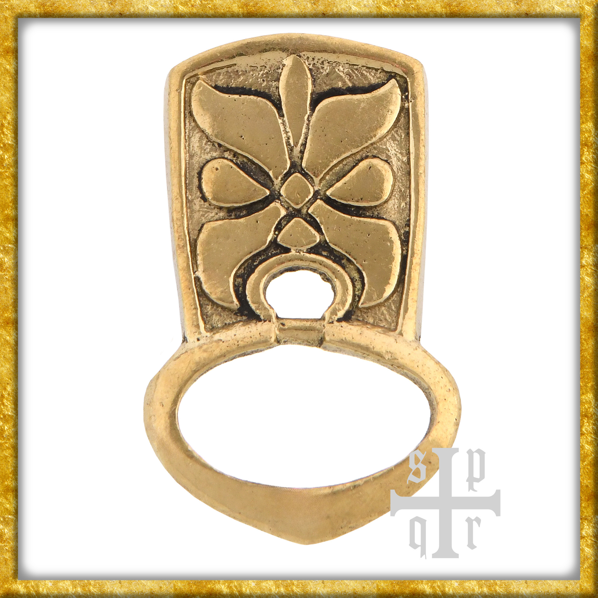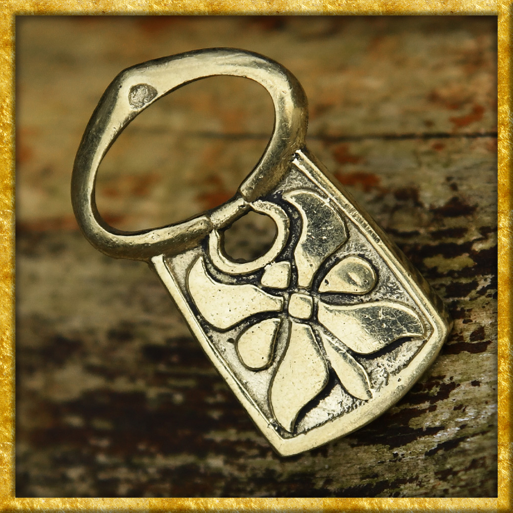Diese aus Messing gefertigte Gürtelschliesse ist mit einem schönen floralen Motiv verziert. Auf der Rückseite befinden sich zwei ca. 1cm lange Nietstifte, mit denen die Schliesse einfach an einem Gürtel befestigt werden kann. Die Gürtelschnalle hat keinen Dorn, so dass der Gürtel, wie im Mittelalter üblich, zum Schliessen verknotet wird.