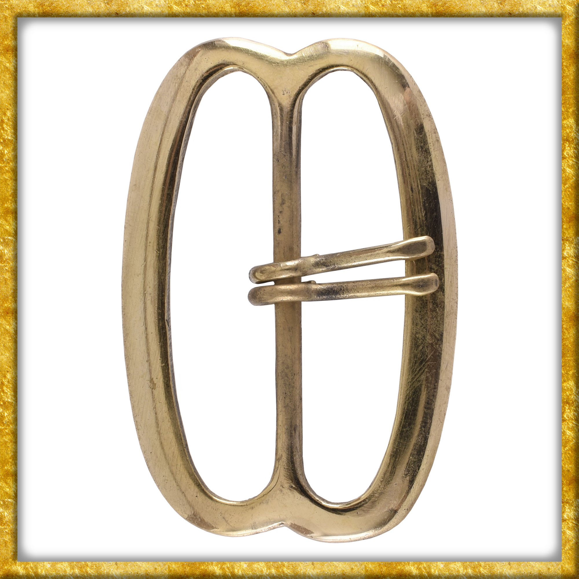 Mithilfe dieser einfachen Gürtelschnalle aus Messing lassen sich leicht schöne Gürtel kreieren und so die eigene Gewandung aufwerten. Diese Schnalle besitzt zwei Dorne, welche locker auf der Mittelschiene aufliegen.