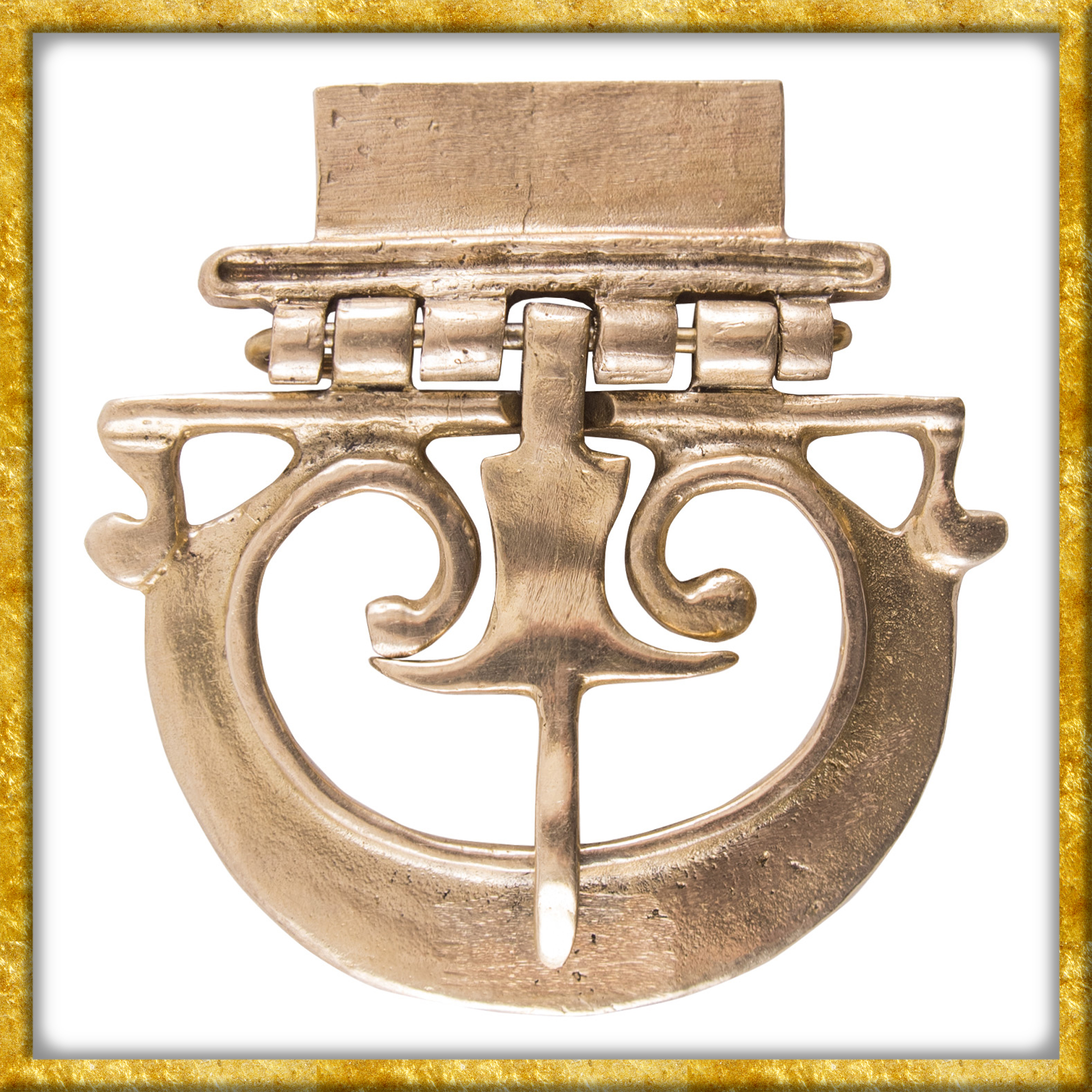 Diese schöne Gürtelschnalle für den Cingulum oder Balteus eines römischen Legionärs ist von Fundstücken aus dem 1 Jh. n. Chr. inspiriert und aus 2mm starkem Messing gegossen. Für die Befestigung an einem Gürtel müssen zunächst Löcher in das bewegliche Riemenblech gebohrt werden, da dieses nicht vorgebohrt ist.