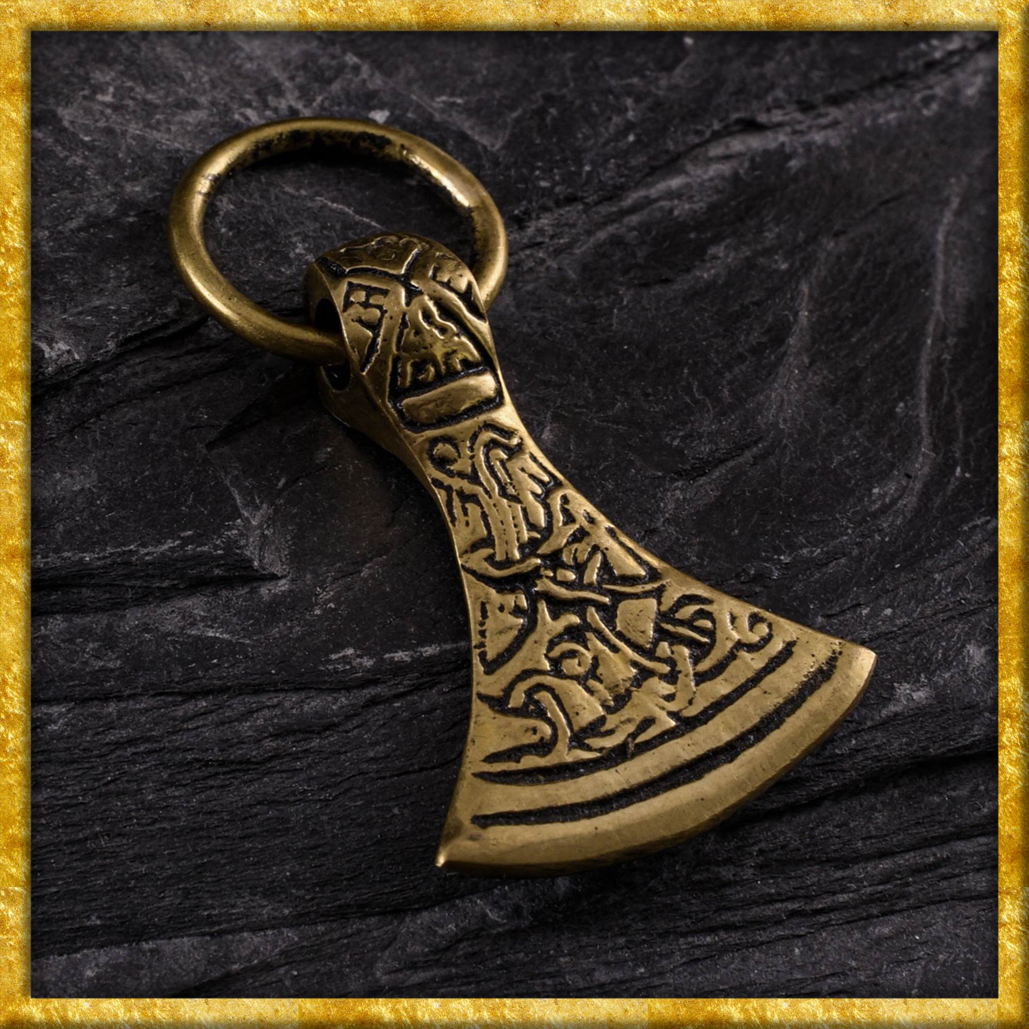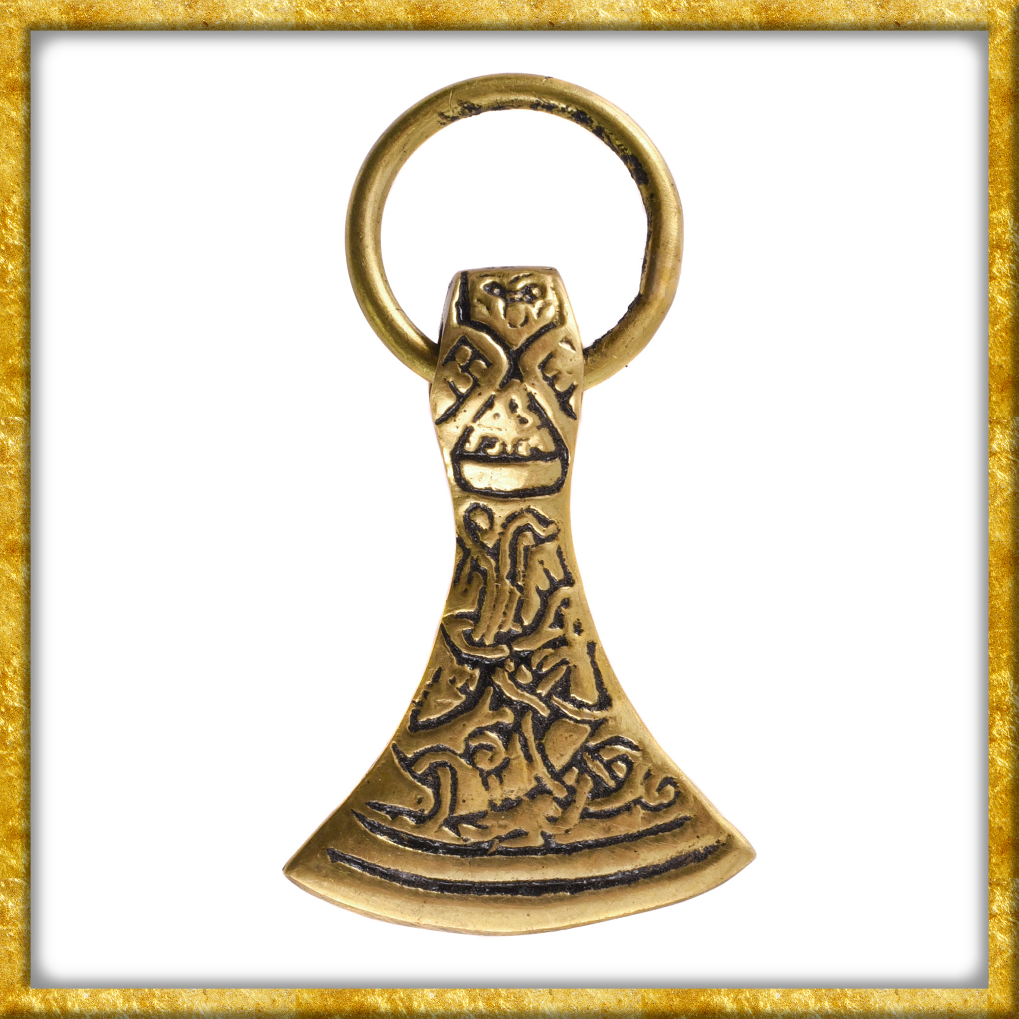 Dieser Anhänger aus Messing ist eine Replik eines dänischen Axtblatt-Anhängers. Der Anhänger ist im Jellinge-Stil hergestellt.