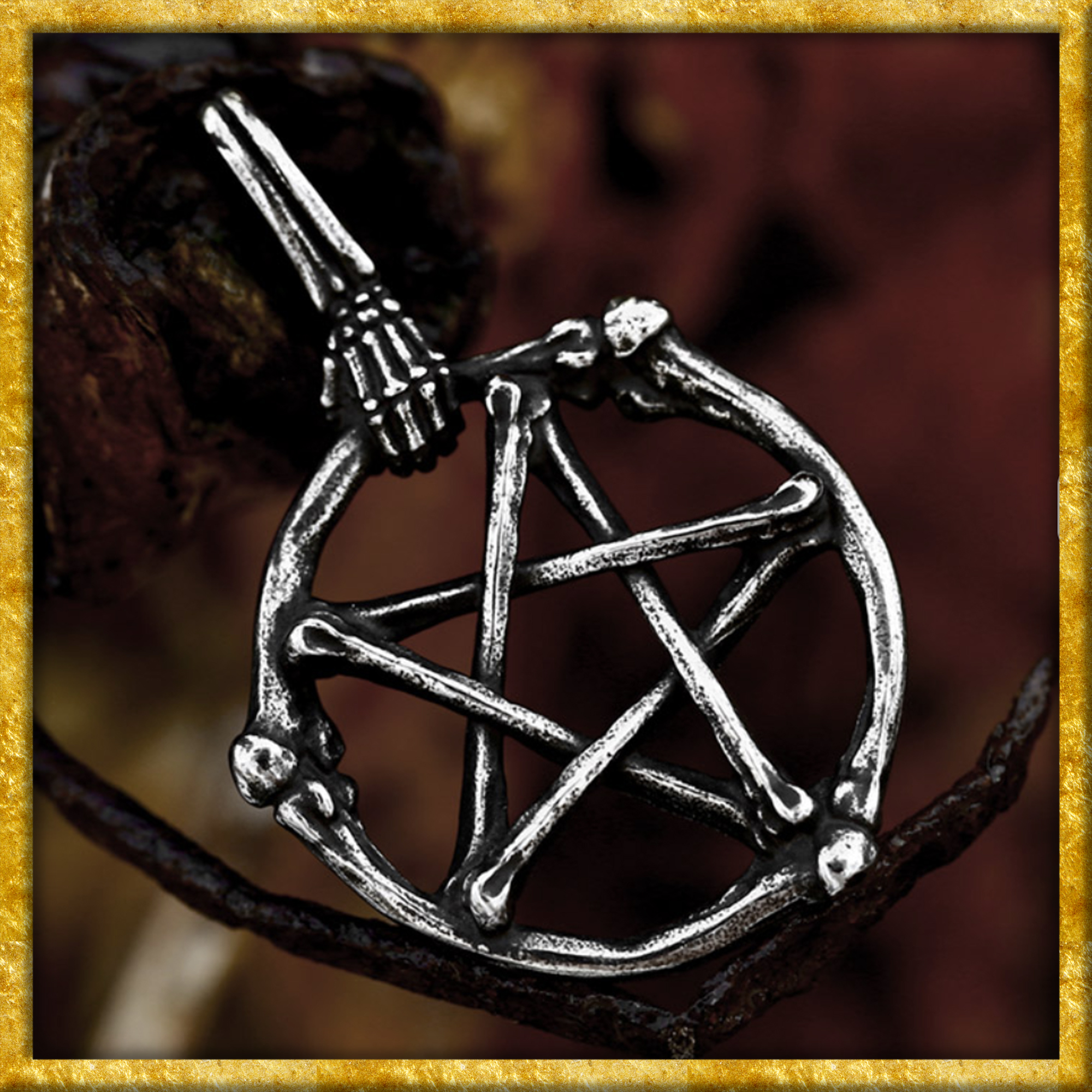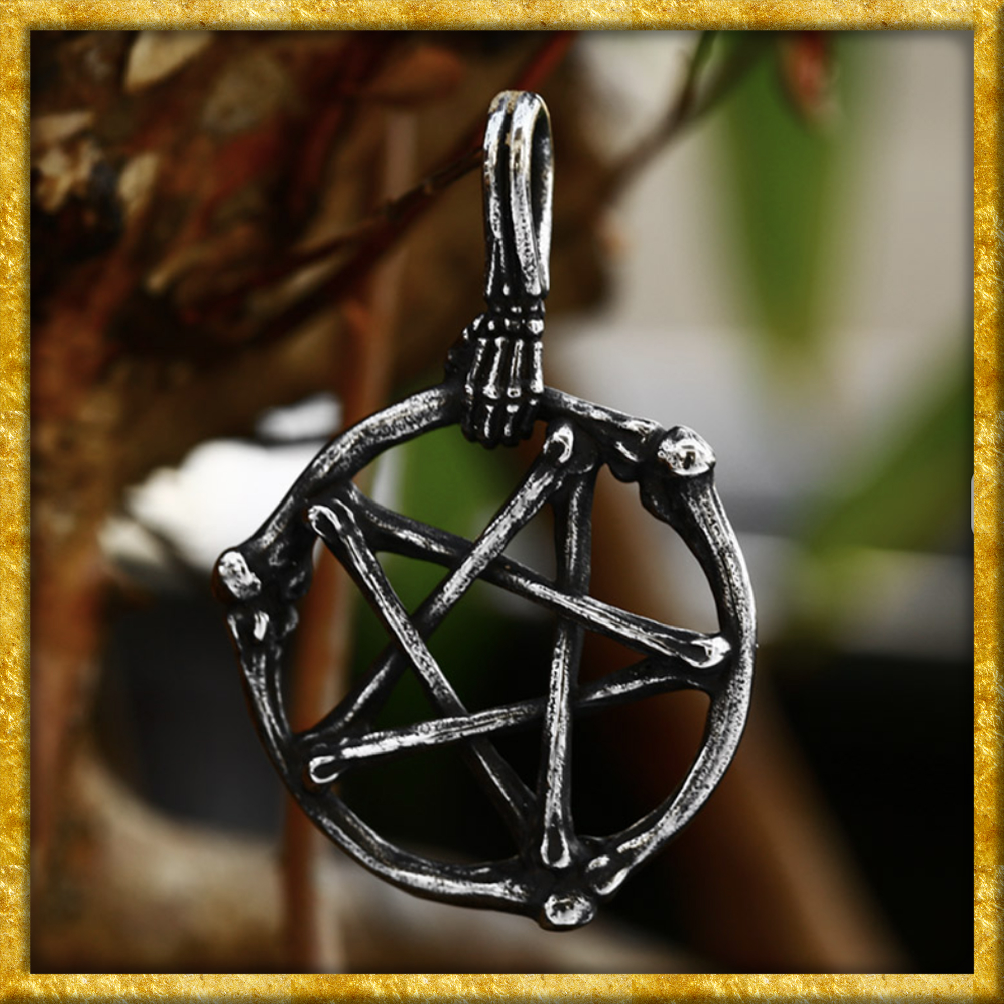Gehalten wird das Pentagramm von einer kunstvoll gearbeiteten Skeletthand, die zugleich als Öse dient und deinem eigenen Lederband oder deiner Lieblingskette sicheren Halt bietet. Diese Kombination aus feiner Detailarbeit und düsterer Symbolik macht den Anhänger zu einem auffälligen Stück, das sofort ins Auge fällt.
