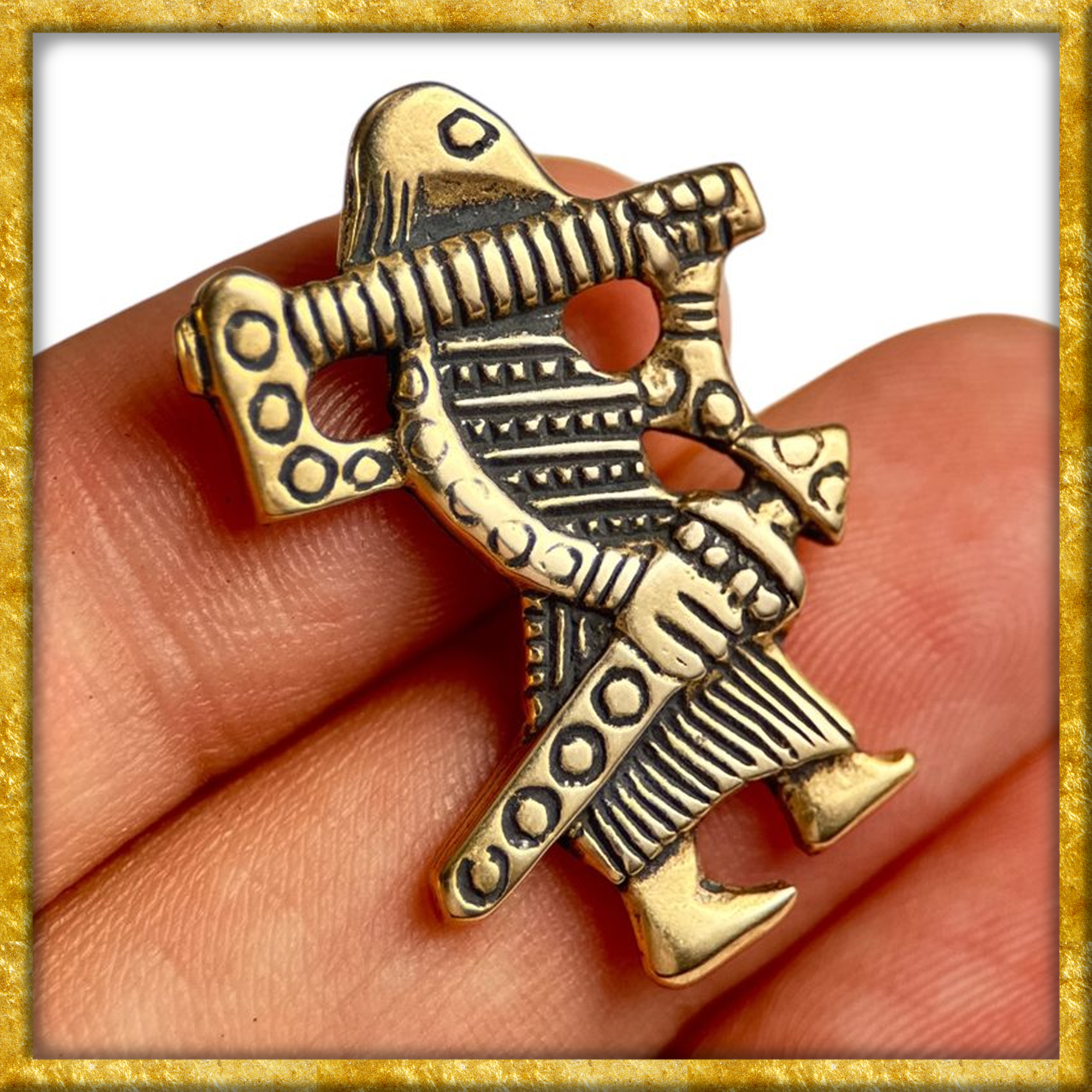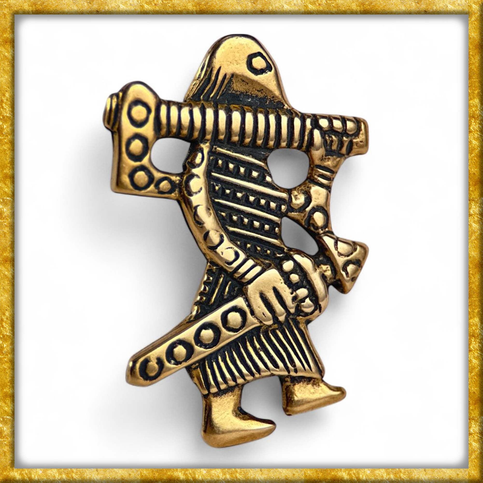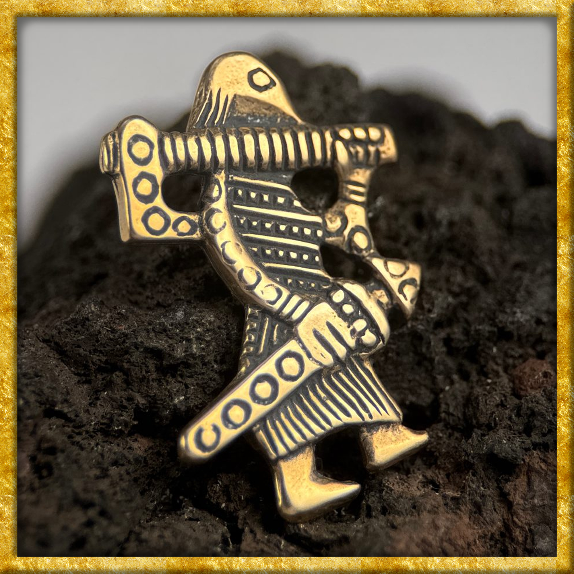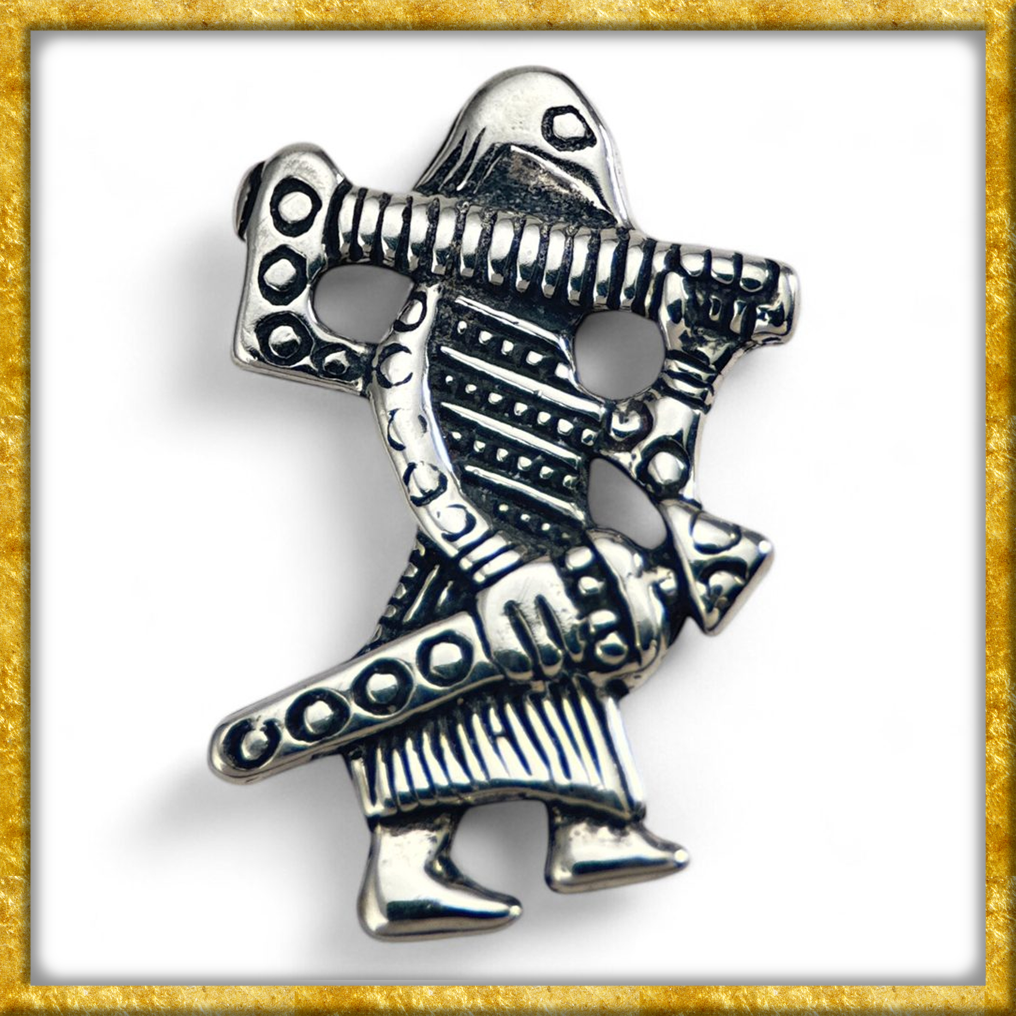 Dieser aussergewöhnliche Anhänger ist eine detailgetreue Replik eines sensationellen Wikingerfundes aus Schweden. Dargestellt ist ein vornehmer Krieger in prächtiger Kleidung, bewaffnet mit einer zweihändigen Axt und einem Schwert. Diese Kombination steht sinnbildlich für Macht, Status und Kampfkunst. Der Anhänger erzählt von einer Zeit, in der Waffen nicht nur Werkzeuge des Krieges waren, sondern auch Zeichen von Rang und Ehre. Die fein ausgearbeitete Form verleiht dem Schmuckstück eine starke Präsenz trotz seiner kompakten Grösse.