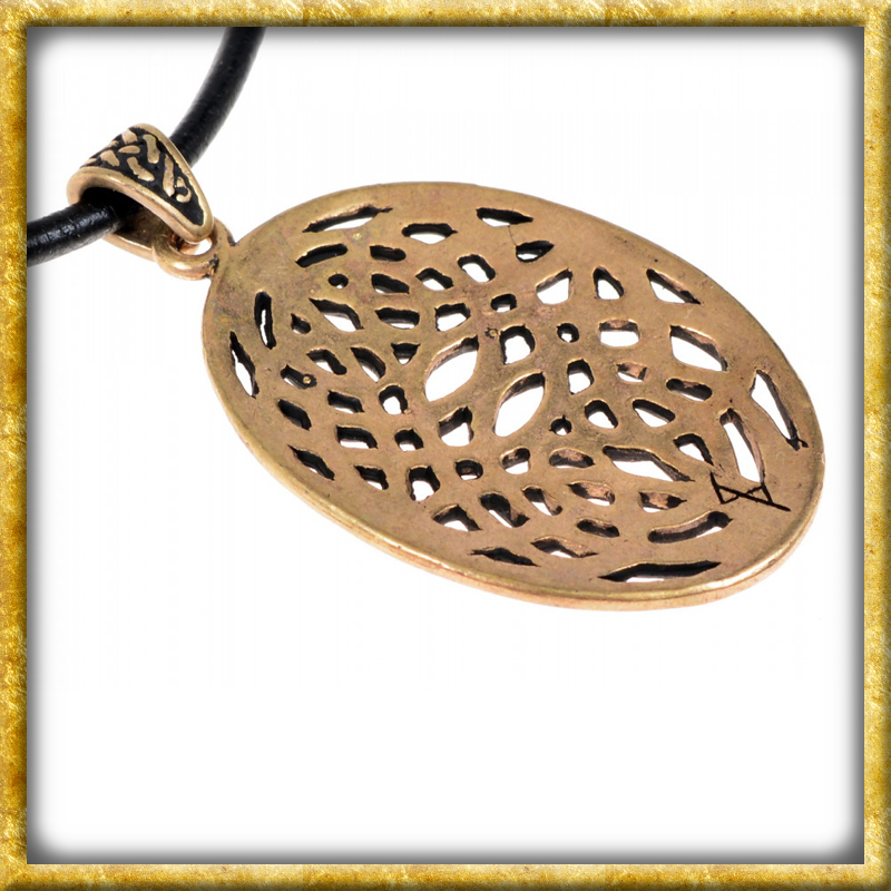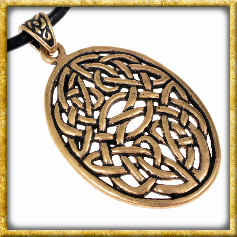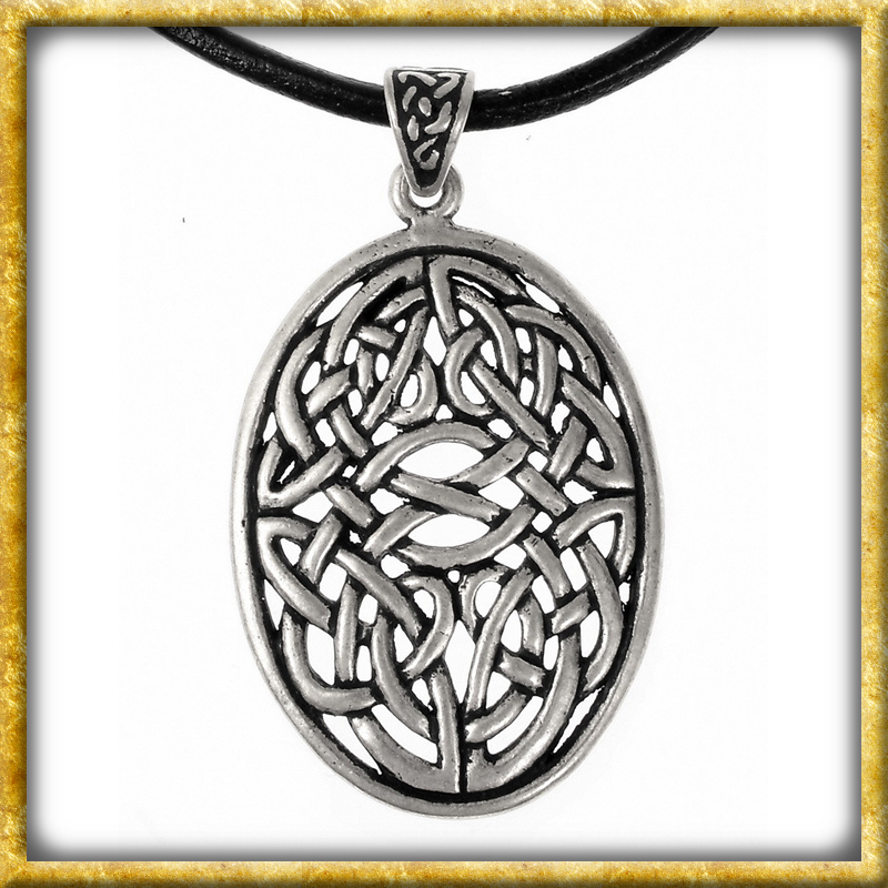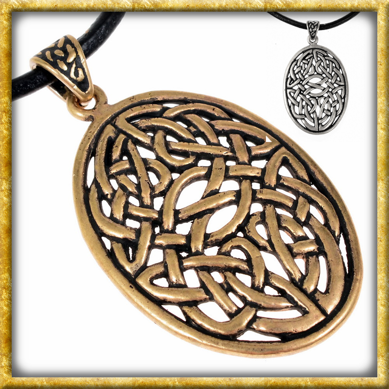 Diese keltische Halskette verfügt über einen Anhänger mit ovalem Knotenmotiv. Er wird aus hochwertiger Bronze gefertigt und ist auch in echt versilbert erhältlich. Der als durchbrochener keltischer Knoten gestaltete Anhänger wurde von historischen Vorbildern aus der irischen Kunst inspiriert. Ein schönes Schmuckstück für die historische Gewandung und macht sich auch als Halsschmuck im Alltag sehr gut.