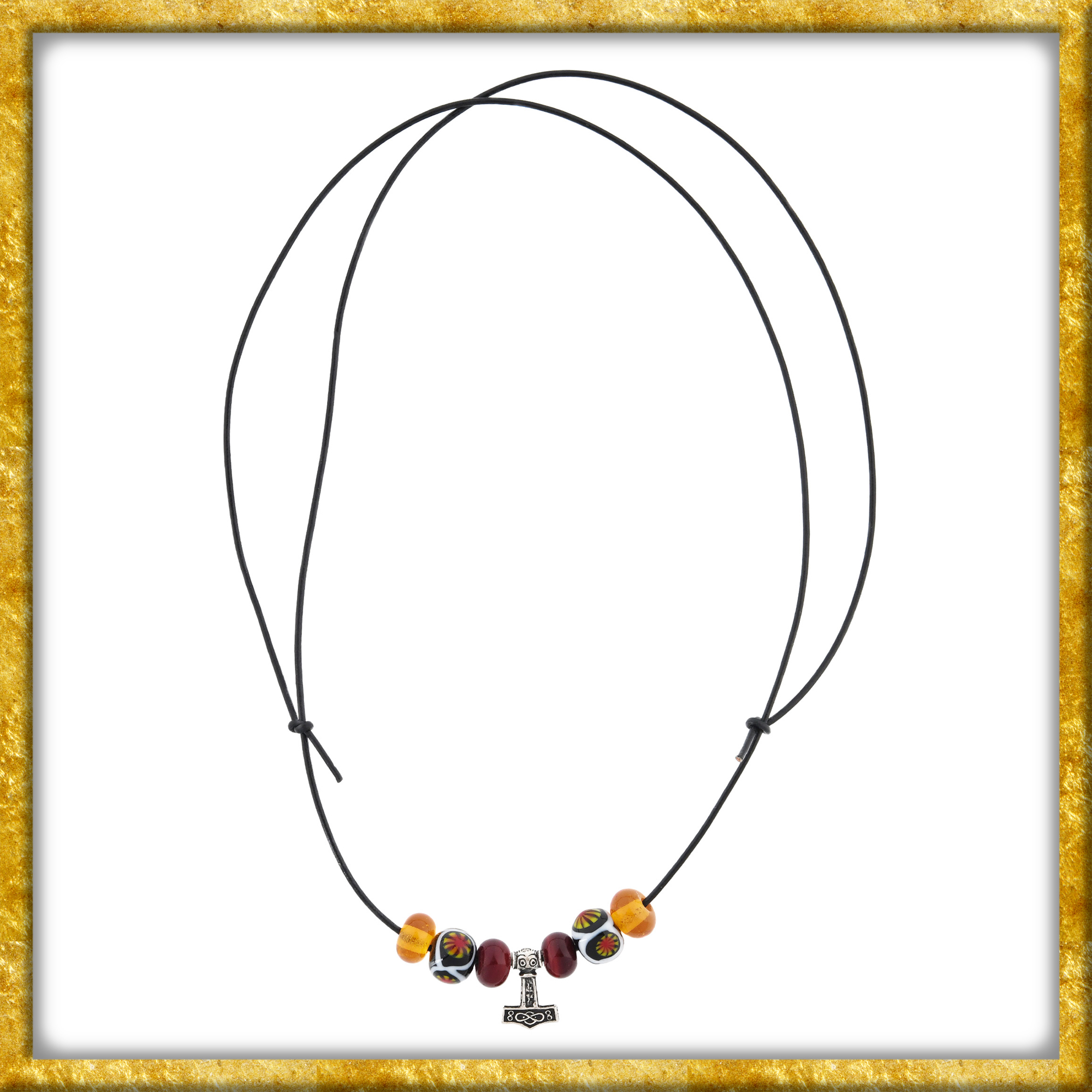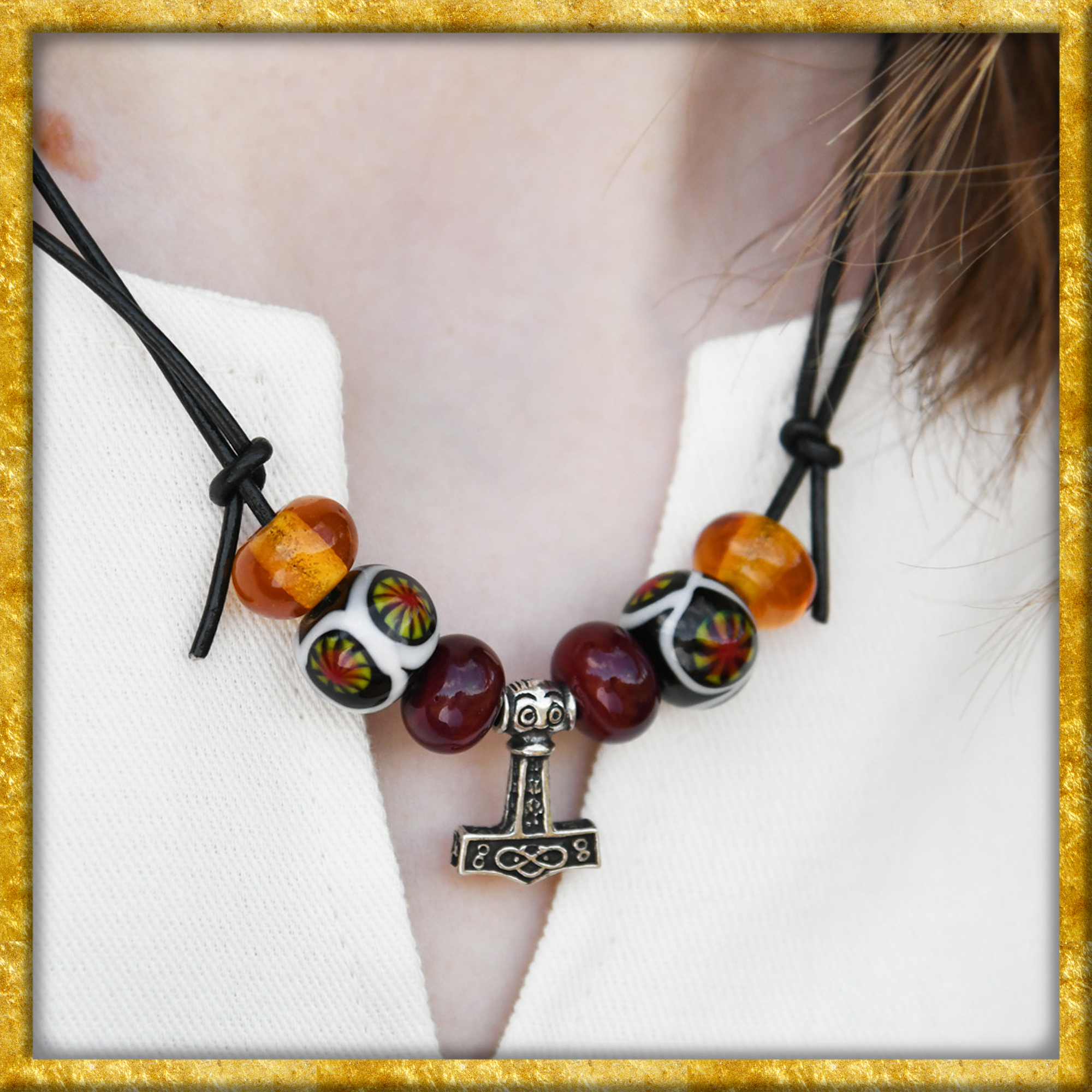 Ob beim LARP, auf Mittelaltermärkten oder bei Reenactment-Events, diese Halskette verleiht jeder Gewandung eine authentische und zugleich elegante Note. Die Glasperlen sind nach historischen Vorbildern gefertigt und basieren auf Grabfunden aus Haithabu, einem der bedeutendsten Handelsplätze der Wikingerzeit. Dort wurden über 7.000 Perlen und Perlenfragmente in vielfältigen Farben, Formen und Mustern entdeckt. Der Thorshammer, auch Mjölnir genannt, ist das Attribut des Donnergottes Thor, welcher nach seinem Vater Odin als zweithöchste nordische Gottheit gilt. Laut der nordischen Mythologie wurde der sog. Uru-Hammer von den Zwergen Sindri und Brokkr aus Uru-Erz geschmiedet. Wenn der Hammer geworfen wird, besteht seine aussergewöhnliche Eigenschaft darin, dass er sein Ziel niemals verfehlt und stets zur Hand seines Werfers zurückkehrt. Dies macht ihn zu einer mächtigen Waffe, die nur Thor vorbehalten ist.