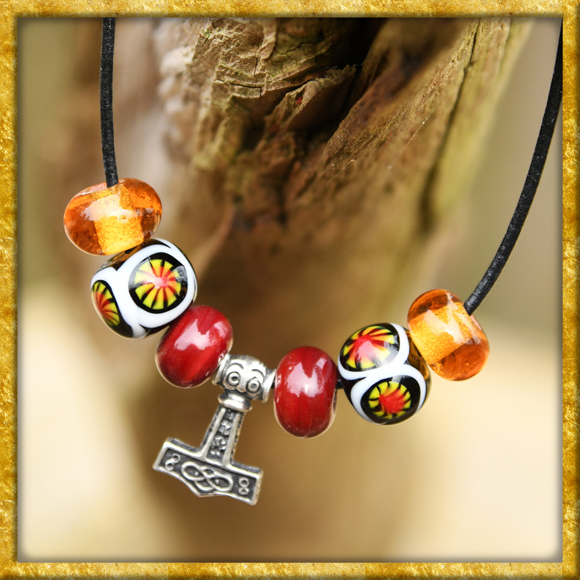 Diese stilvolle Kette mit bunten Glasperlen und einem schönen Mjölnir-Anhänger ist ein besonderes Schmuckstück für alle, die sich für die faszinierende Welt der Wikinger begeistern. Der silberne Anhänger in Form des Thorshammers, verziert mit filigranen Wikinger-Knoten, macht die Kette zu einem echten Blickfang. Der Anhänger hat die Masse 1,9 x 1,3cm.