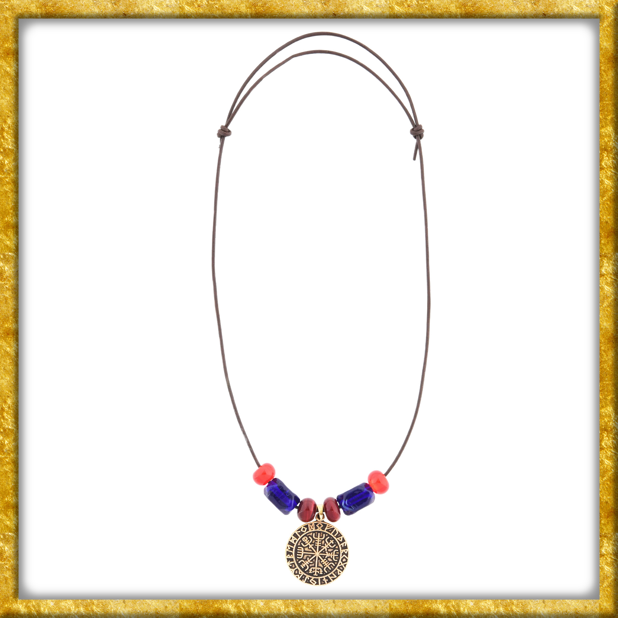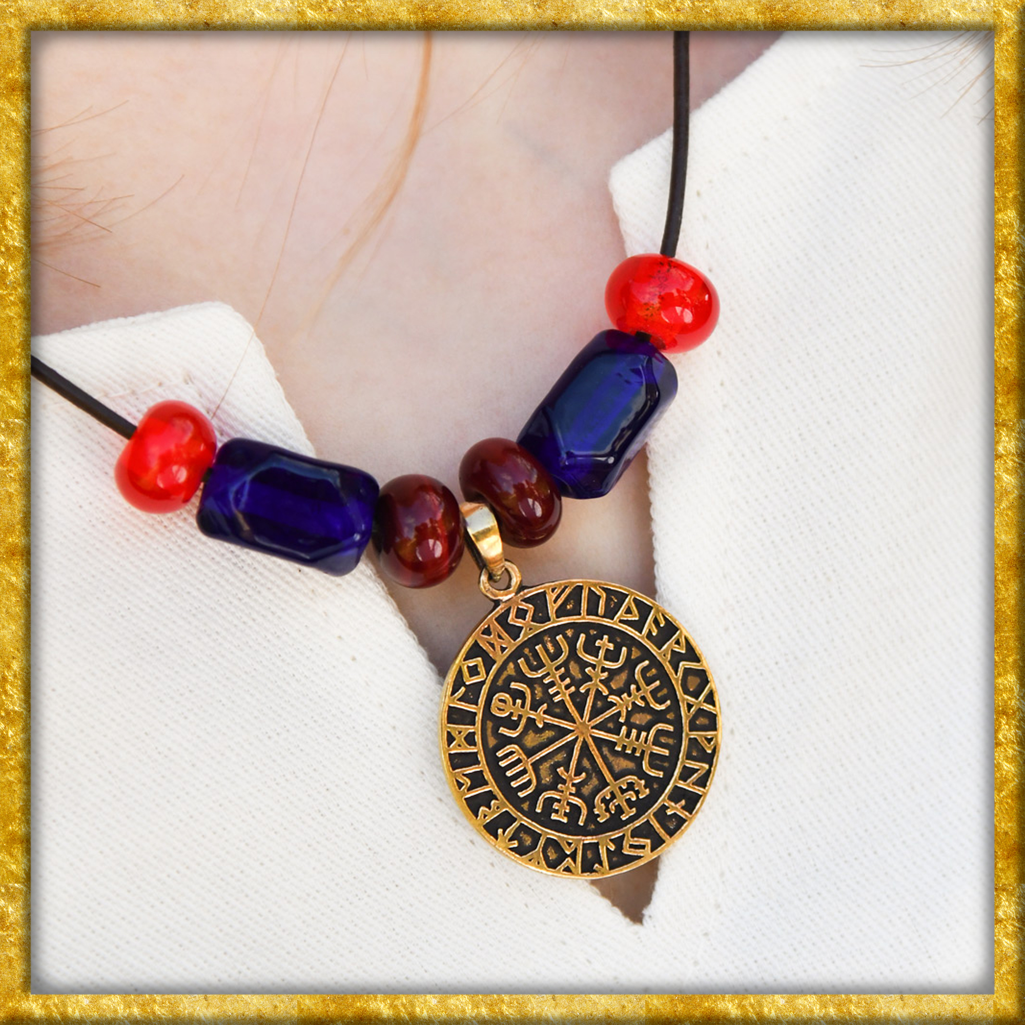 Ob beim LARP, auf Mittelaltermärkten oder bei Reenactment-Events, diese Halskette verleiht jeder Gewandung eine authentische und zugleich elegante Note. Die Glasperlen sind nach historischen Vorbildern gefertigt und basieren auf Grabfunden aus Haithabu, einem der bedeutendsten Handelsplätze der Wikingerzeit. Dort wurden über 7.000 Perlen und Perlenfragmente in vielfältigen Farben, Formen und Mustern entdeckt. Der Vegvísir ist ein magisches Zeichen bzw. eine sogenannte Sigille isländischen Ursprungs. Obwohl der Vegvísir heute häufig als Wikinger-Kompass bezeichnet wird, gibt es keinerlei Überlieferungen dafür, dass er tatsächlich in der Wikingerzeit von den Nordmännern verwendet wurde. Nichtsdestotrotz bleibt er heutzutage bedeutungsträchtig. Während die Anhänger des germanischen Neuheidentums ihn als Repräsentation der neun Welten der nordischen Mythologie interpretieren, wird er im modernen Alltag – z.B. als Anhänger oder Amulett / Talisman – gerne als Wegweiser im übertragenen Sinne genutzt. So soll er seinem Träger helfen, die Stürme zu überstehen, die das Leben mit sich bringt, auch auf unbekannten Wegen.