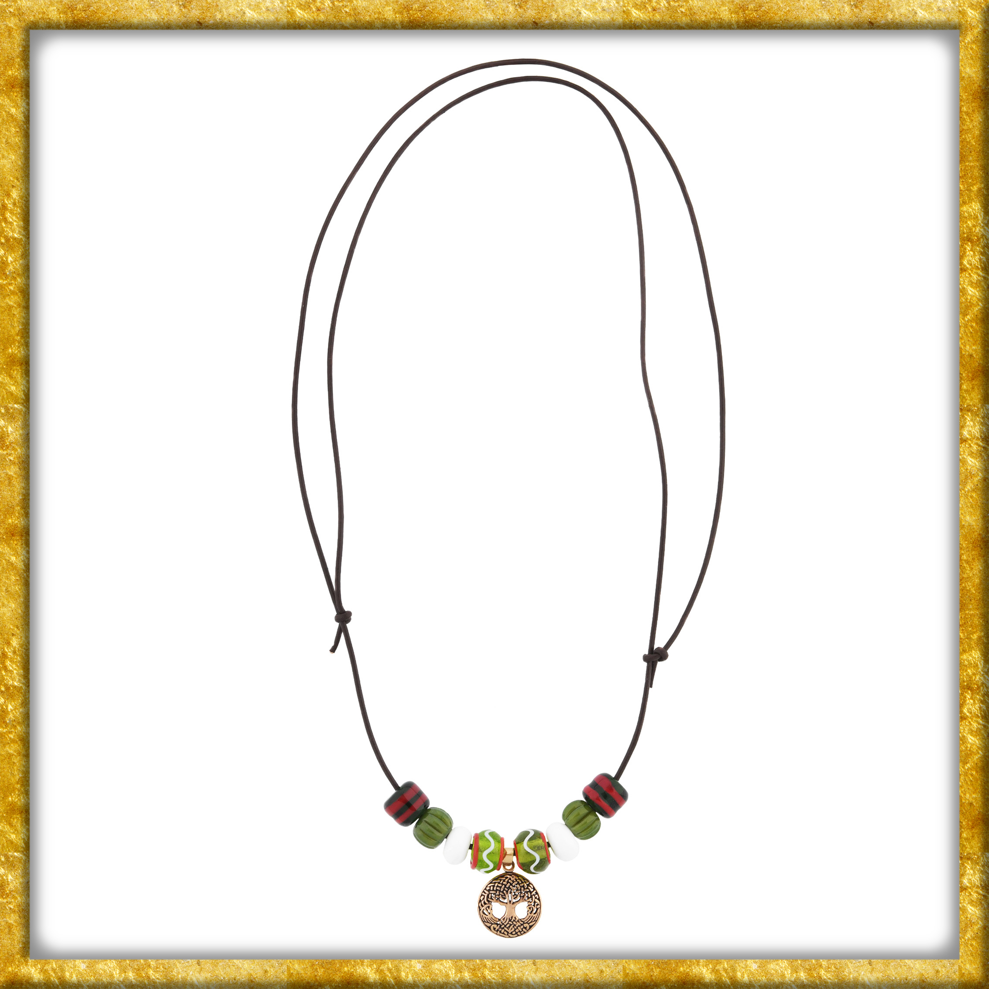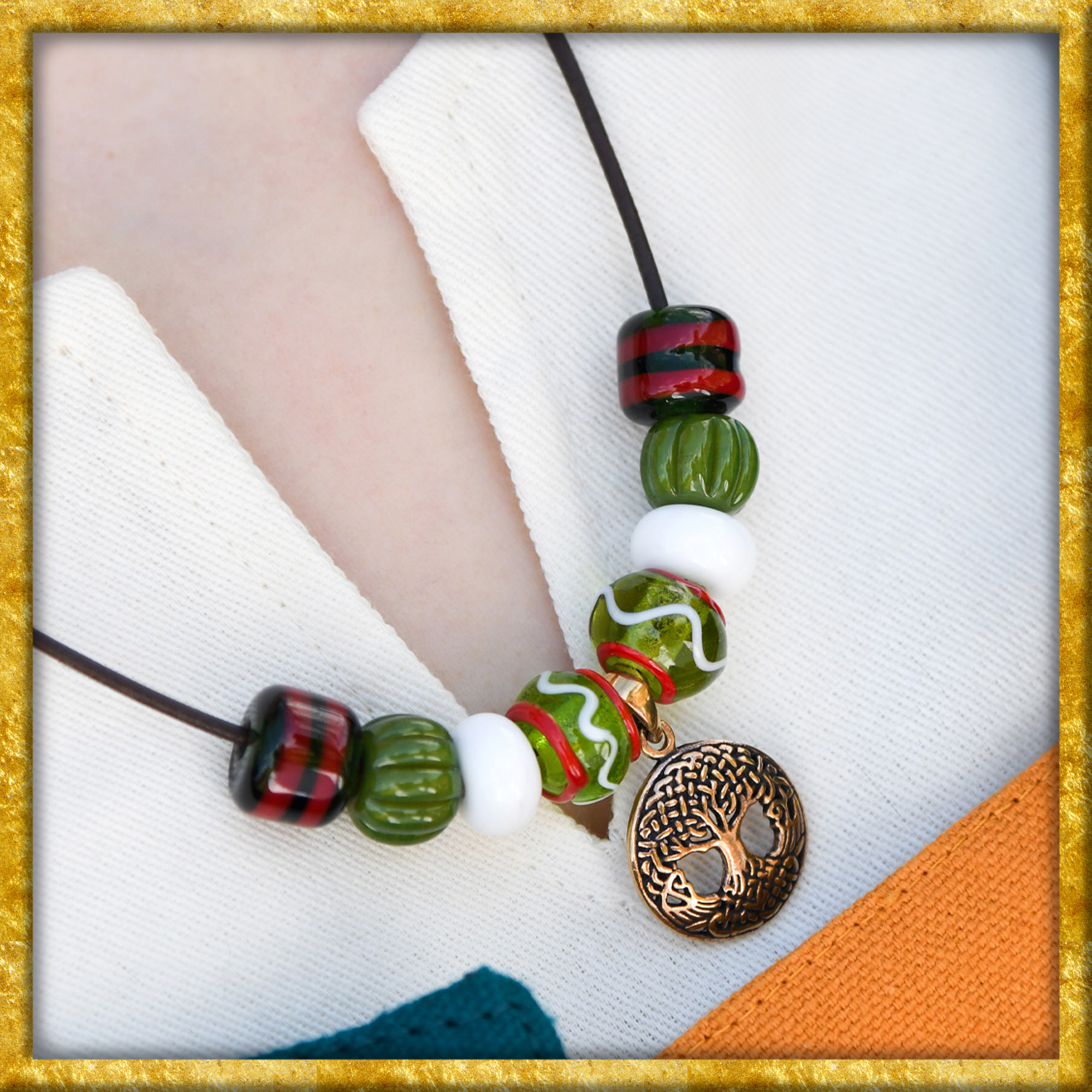 Ob beim LARP, auf Mittelaltermärkten oder bei Reenactment-Events, diese Halskette verleiht jeder Gewandung eine authentische und zugleich elegante Note. Die Glasperlen sind nach historischen Vorbildern gefertigt und basieren auf Grabfunden aus Haithabu, einem der bedeutendsten Handelsplätze der Wikingerzeit. Dort wurden über 7.000 Perlen und Perlenfragmente in vielfältigen Farben, Formen und Mustern entdeckt. In der nordischen Mythologie ist die immergrüne Esche Yggdrasil die Weltachse, welche Oberwelt, Erde und Unterwelt miteinander verbindet. Als Verkörperung des gesamten Kosmos bzw. der gesamten Schöpfung ist dieser heilige Baum Sinnbild des Wissens, des Lebens, des Vergehens, der Wiedererneuerung und, letzten Endes, der Unsterblichkeit.