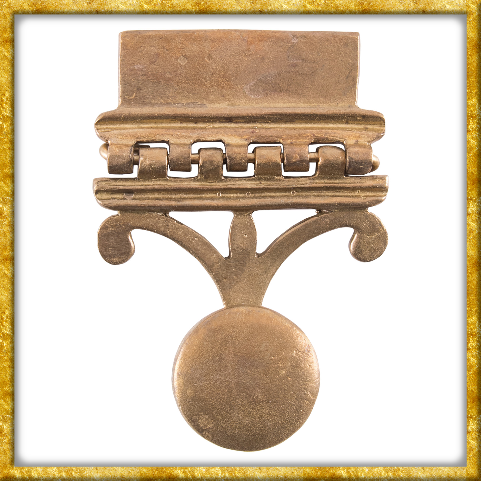 Diese Nachbildung eines römischen Pugio-Halters für einen römischen Gürtel ist aus 2mm starkem Messing gegossen. Für die Befestigung an einem Gürtel müssen zunächst Löcher in das bewegliche Riemenblech gebohrt werden, da dieses nicht vorgebohrt ist.