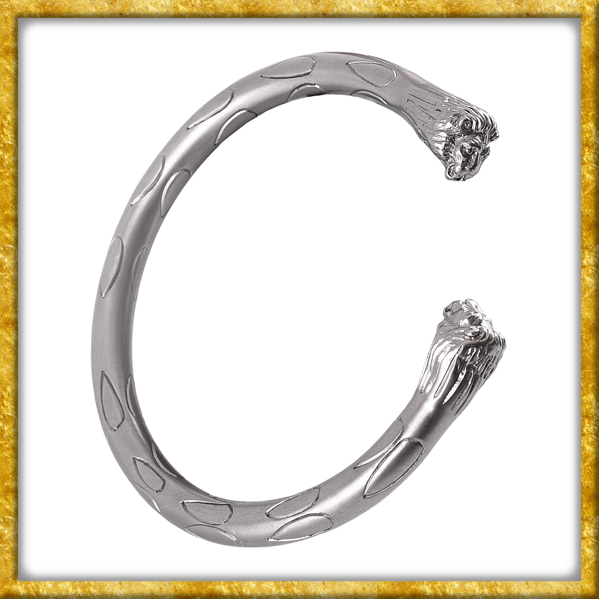 Diese Nachbildung eines römischen Torques mit als Löwenköpfen ausgebildeten Enden ist aus Messing gegossen und verzinnt. Sie ist ideal zum Bestücken eines eigenen Brustgeschirrs und eignet sich auch hervorragend als Ersatzteil. Ein ideales Accessoire für römisches Reenactment.