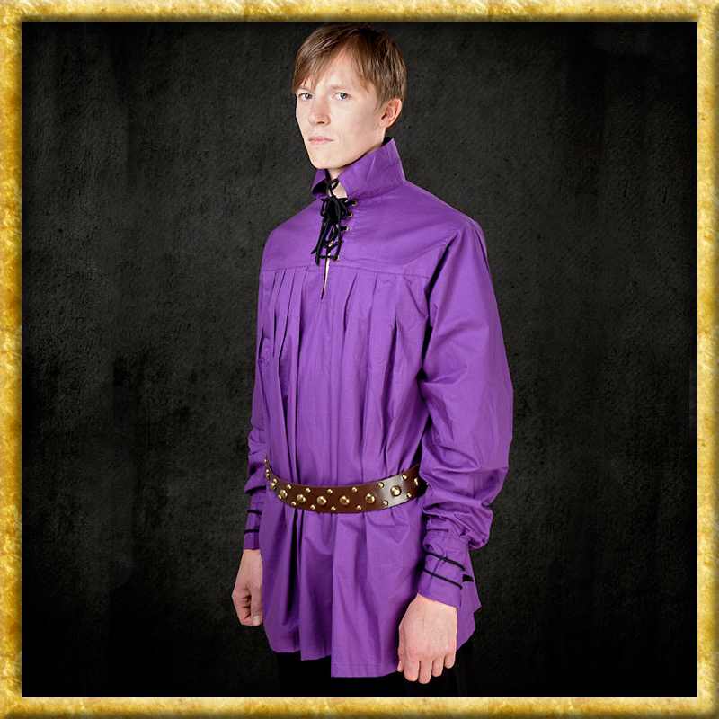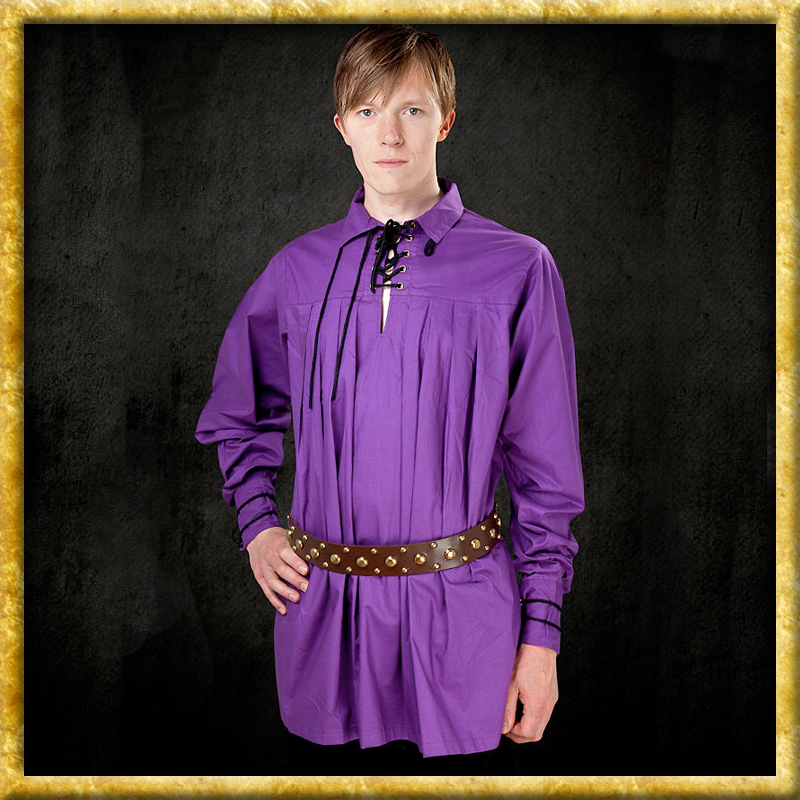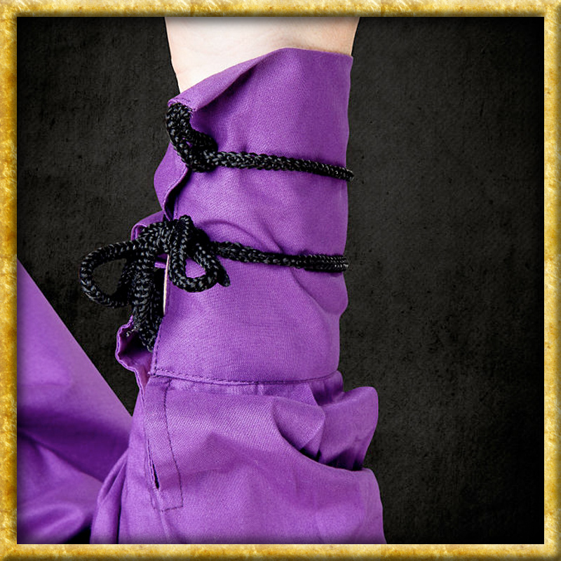 Dieses hochwertige Baumwollhemd in Voilett verfügt über lange Ärmeln. Weite Ärmel treffen auf enge Bünde, ein weiter Ausschnitt auf elegante Schnürung und überdies kann das schwarze Baumwollhemd aufgrund seiner Länge in der Regel über den Beinkleidern getragen werden. Ergänzungen mit farbigen Schärpen oder Waffengürteln aus Leder bieten sich dabei nicht nur an, sondern waren historisch auch üblich. Raffiniertes Detail des langen Baumwollhemds in Schwarz, die extravagante, doppelte Schnürung der Manschetten.