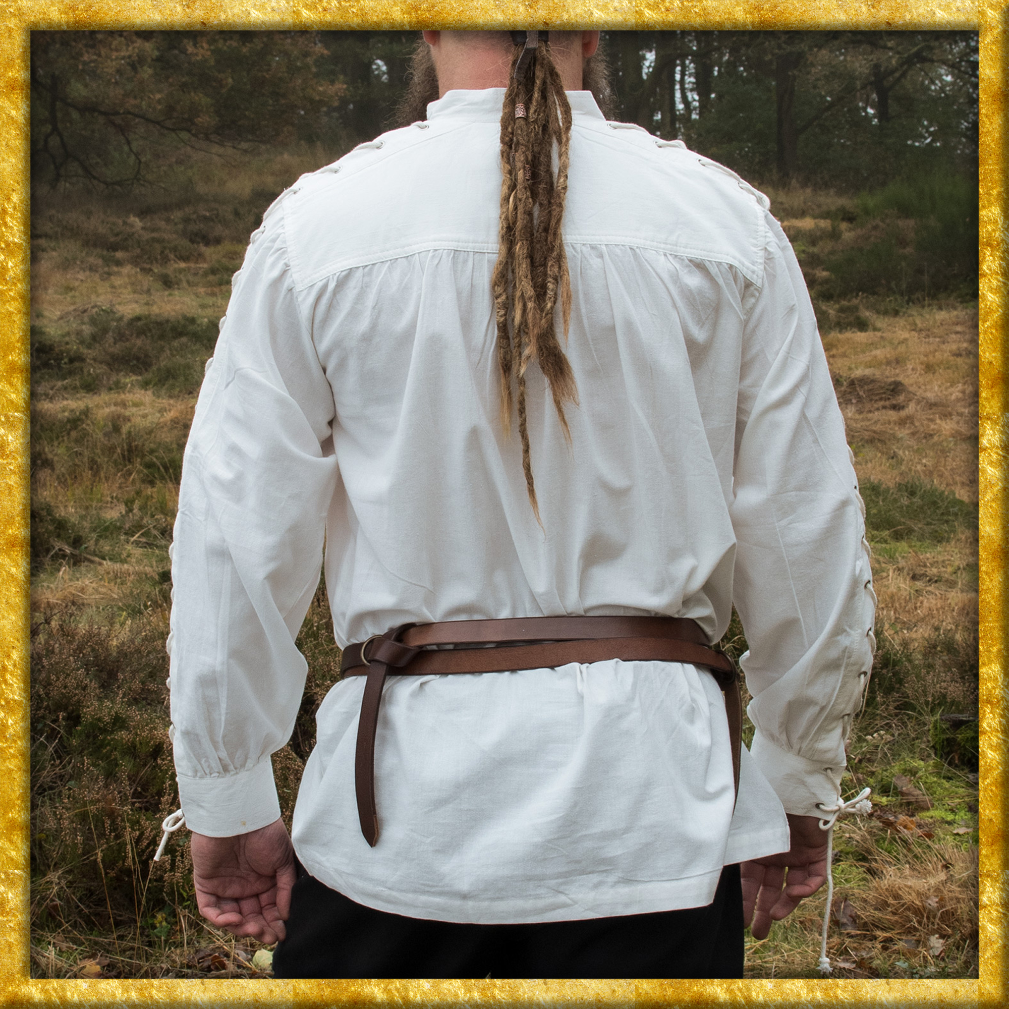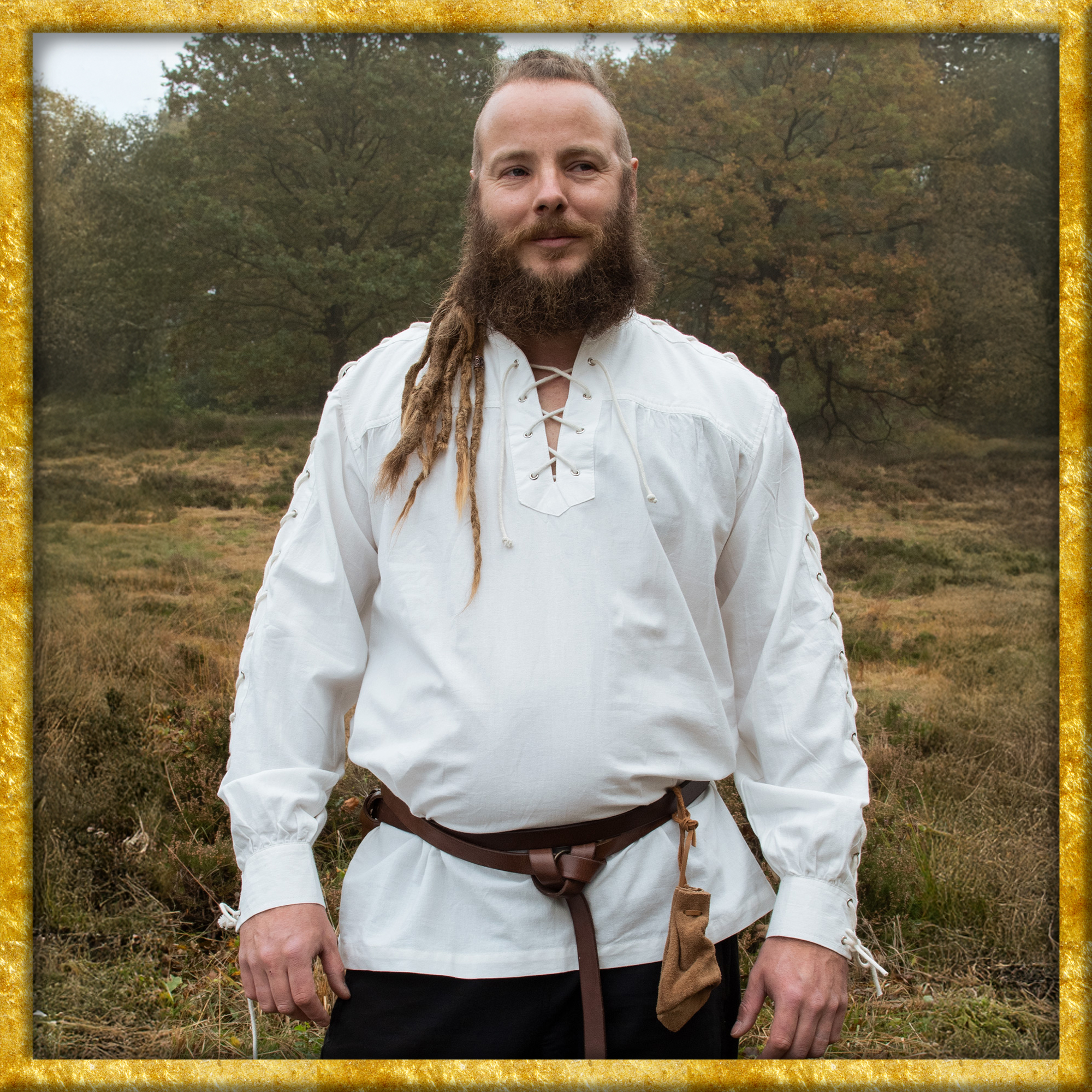 Das locker geschnittene Hemd ist ein Klassiker der mittelalterlichen Gewandung und gehört zur Grundausstattung für jeden Besucher auf dem Mittelaltermarkt. Auch in der Gothic-Szene und bei Metal Fans ist dieses geschnürte Stehkragenhemd sehr beliebt. Charakteristisch für dieses Mittelalterhemd ist, dass die kompletten Ärmel sowie der Ausschnitt mit einer Schnürung versehen sind. Weitere Details wie der Stehkragen und eine gedoppelte Schulterpasse mit anschließender Raffung unterstützen den Look. Das Hemd ist aus Baumwollstoff gefertigt und trägt sich sehr angenehm.