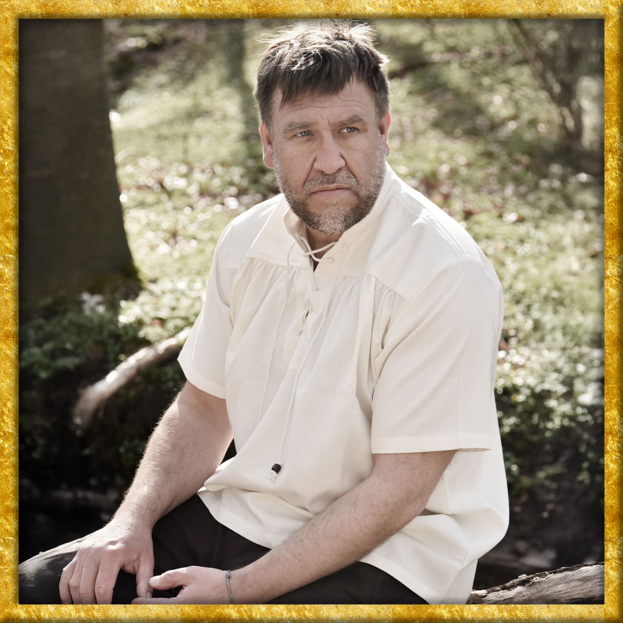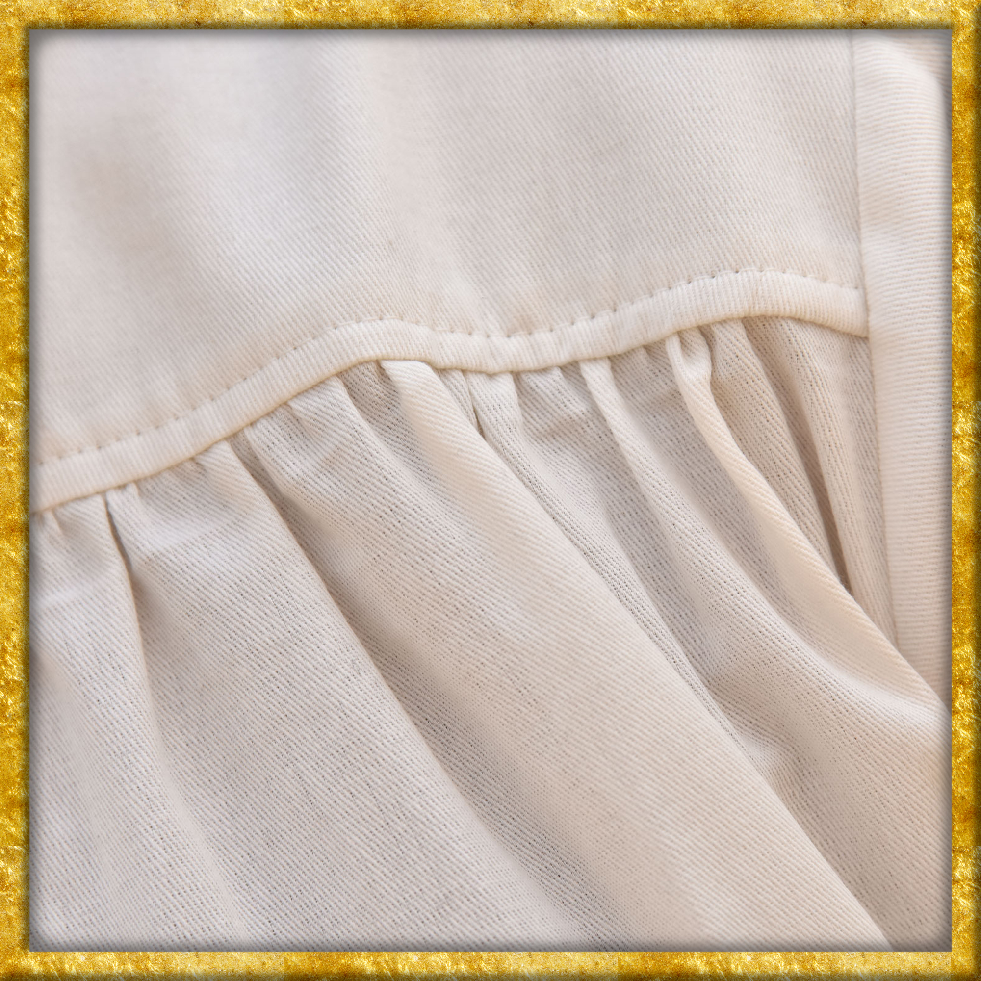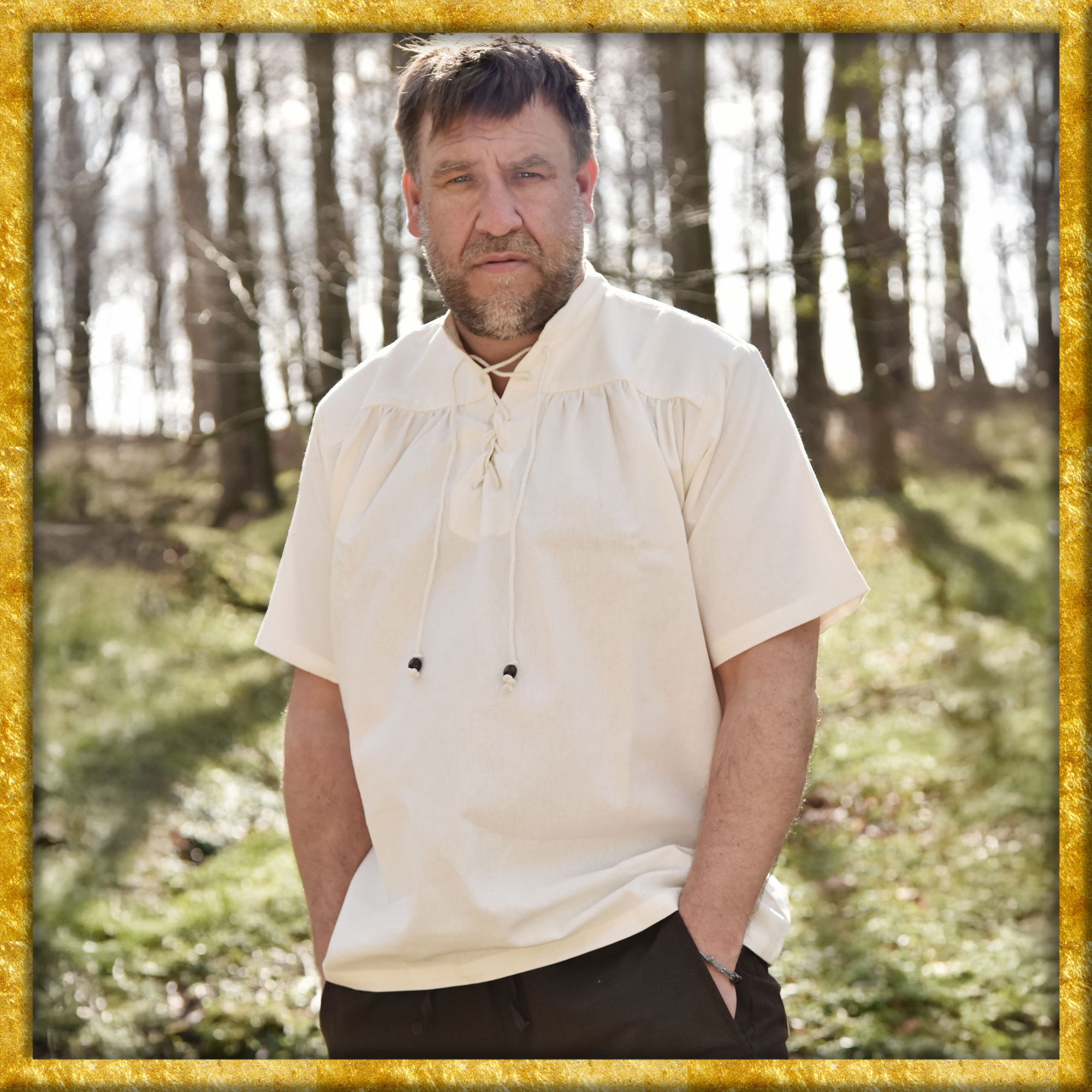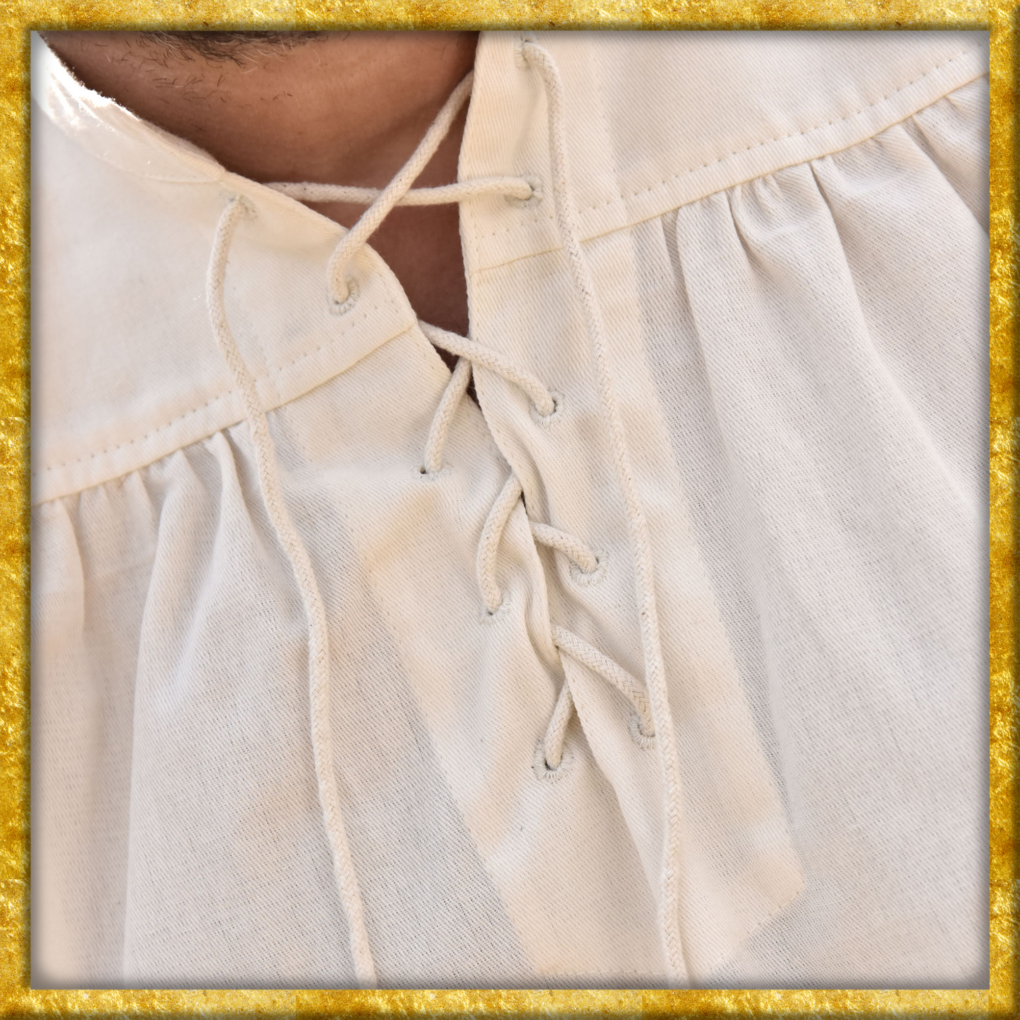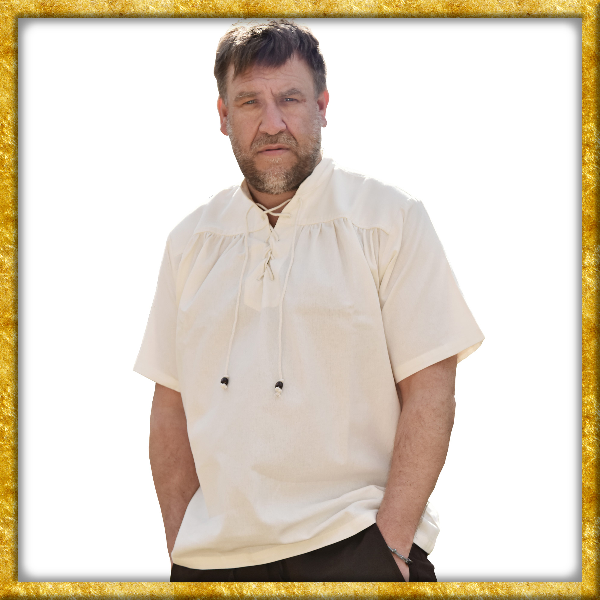 Dieses locker geschnittene, kurzärmlige Hemd in Natur ist ein Klassiker der spätmittelalterlichen Gewandung und vielseitig einsetzbar. Es hat einen Stehkragen und eine Schnürung am Ausschnitt. An der vorderen und hinteren Passe befinden sich Raffungen. Das Hemd ist aus feinem Baumwollstoff in Köperbindung gefertigt und hat einen angenehmen Tragekomfort.