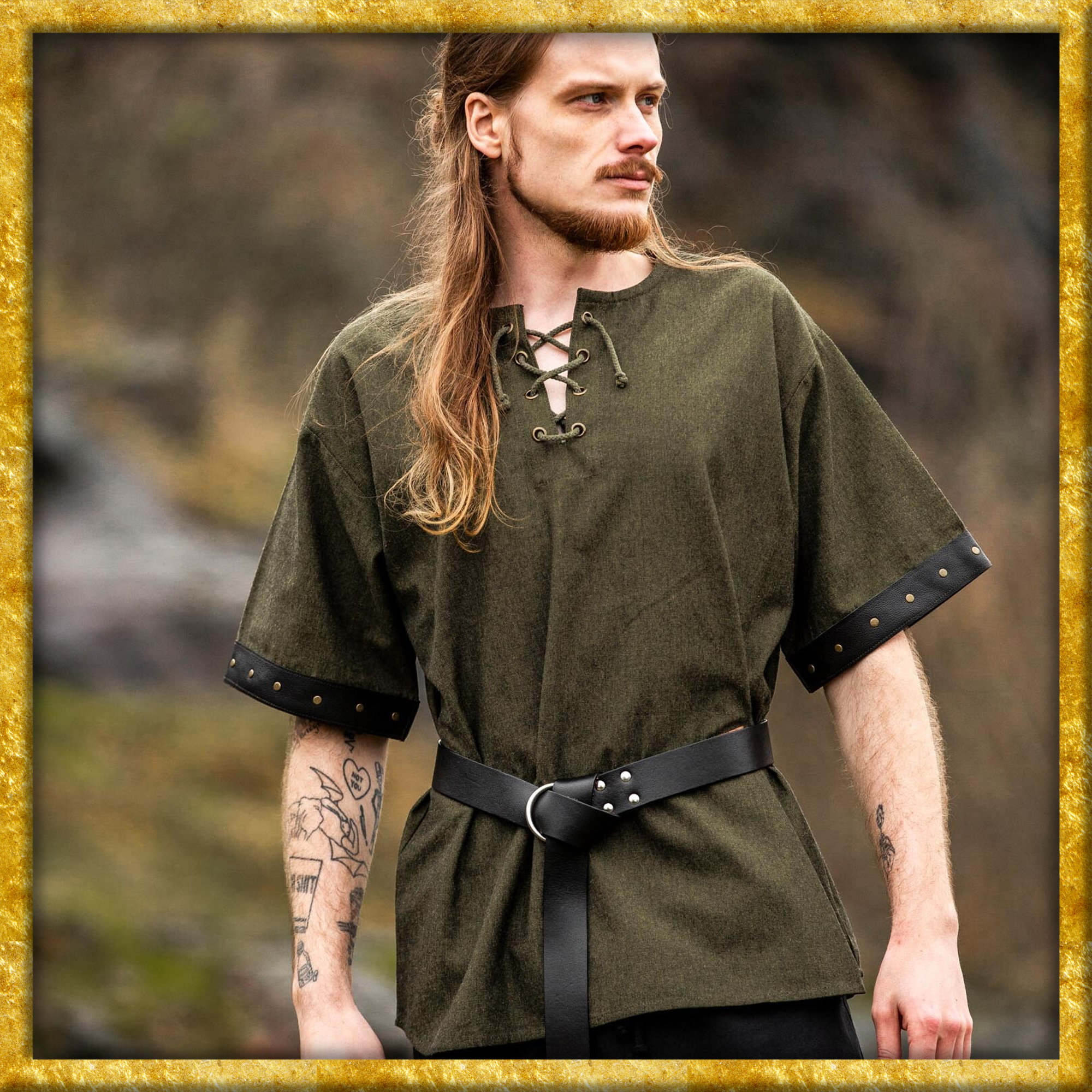 Dieses Mittelalterhemd Hagen mit Lederapplikationen ist mehr als nur ein Kleidungsstück. Mit seinem charakteristischen Schnürkragen und den metallenen Ösen vereint es Komfort und Stil, um Dir ein unvergleichliches Trageerlebnis zu bieten. Die kurzen Ärmel, verziert mit kunstvollen Nietenbändern, verleihen dem Hemd einen markanten Look. Dank seiner geraden Passform und dem angenehmen Baumwollstoff begleitet Dich das Hemd auf all Deinen Abenteuern bequem und stilvoll.