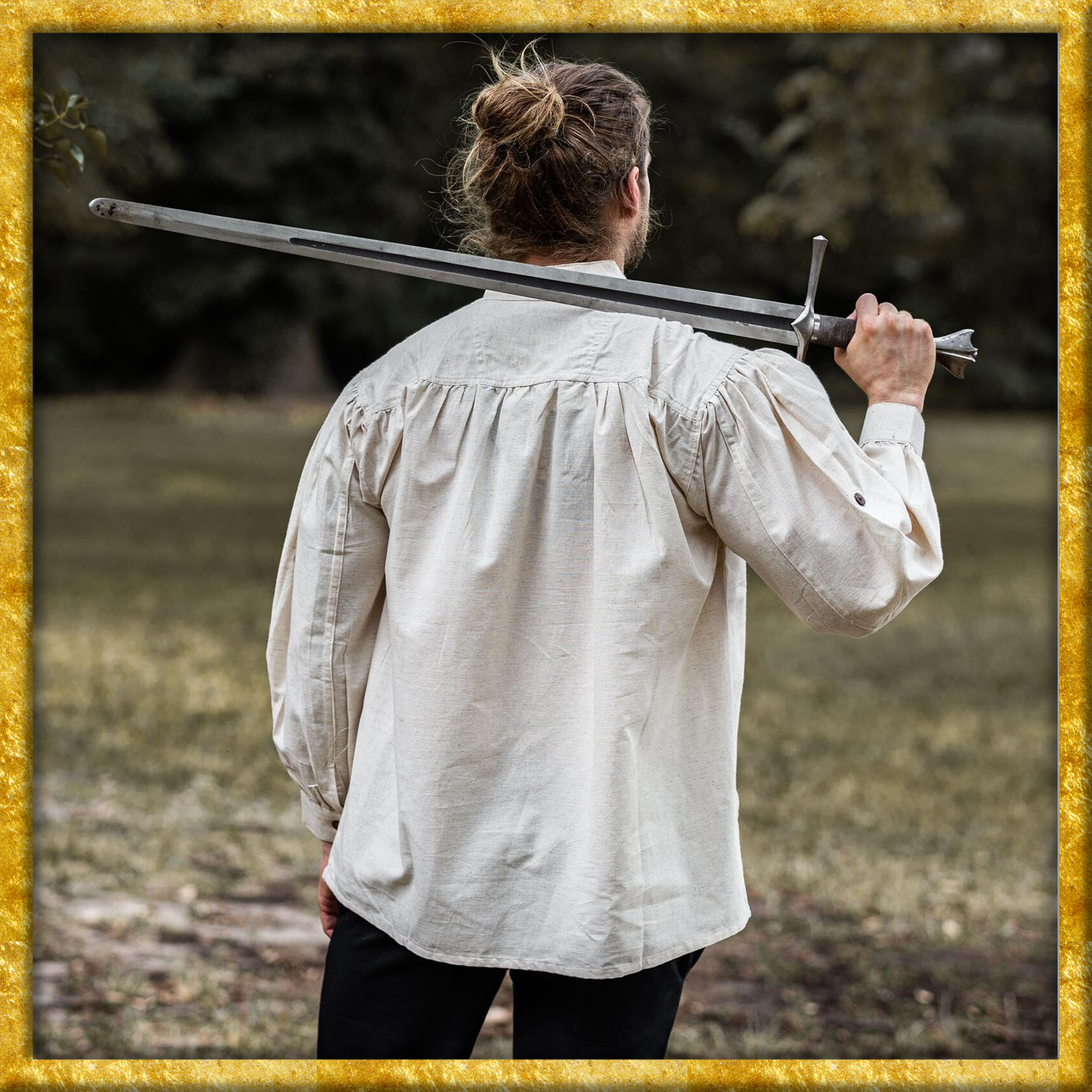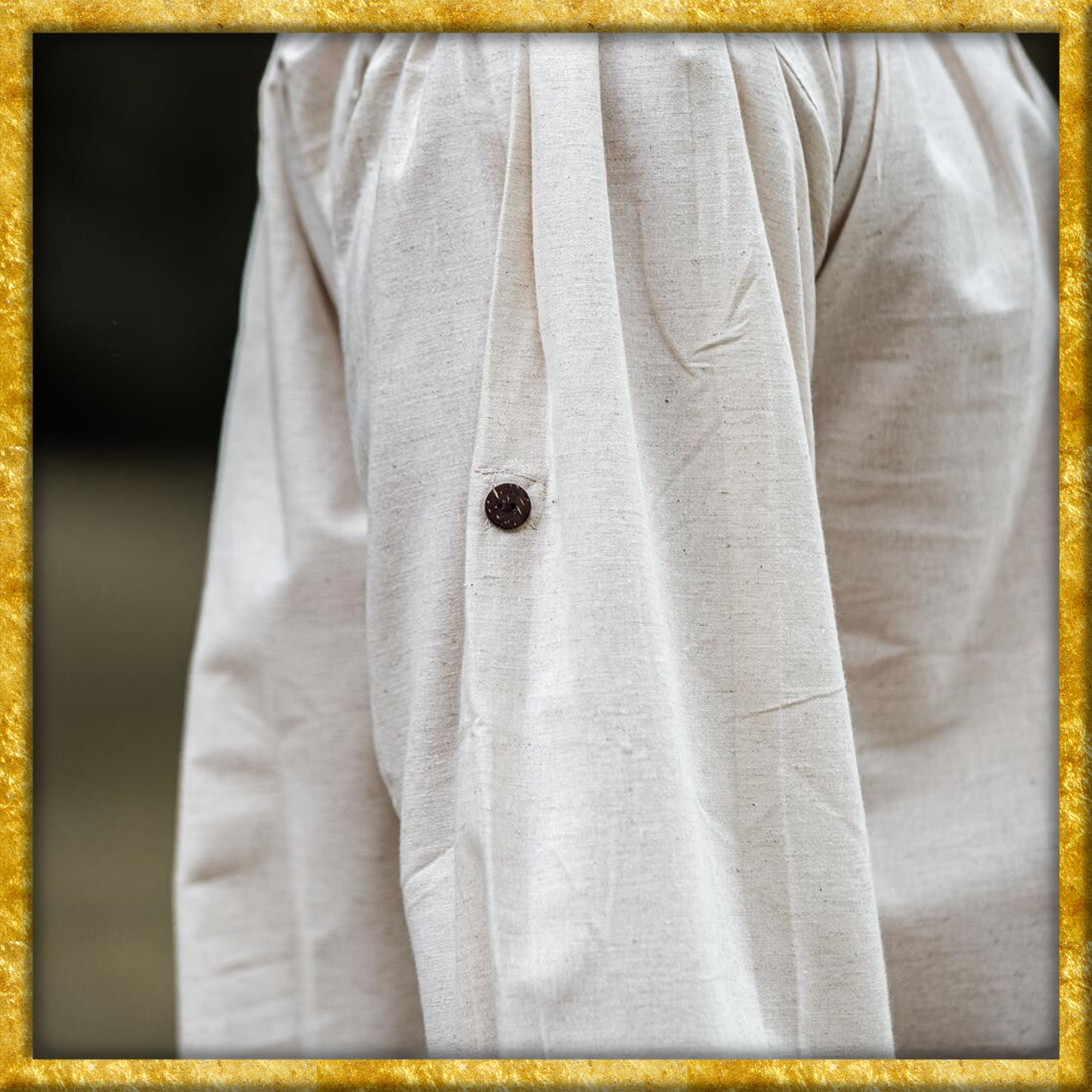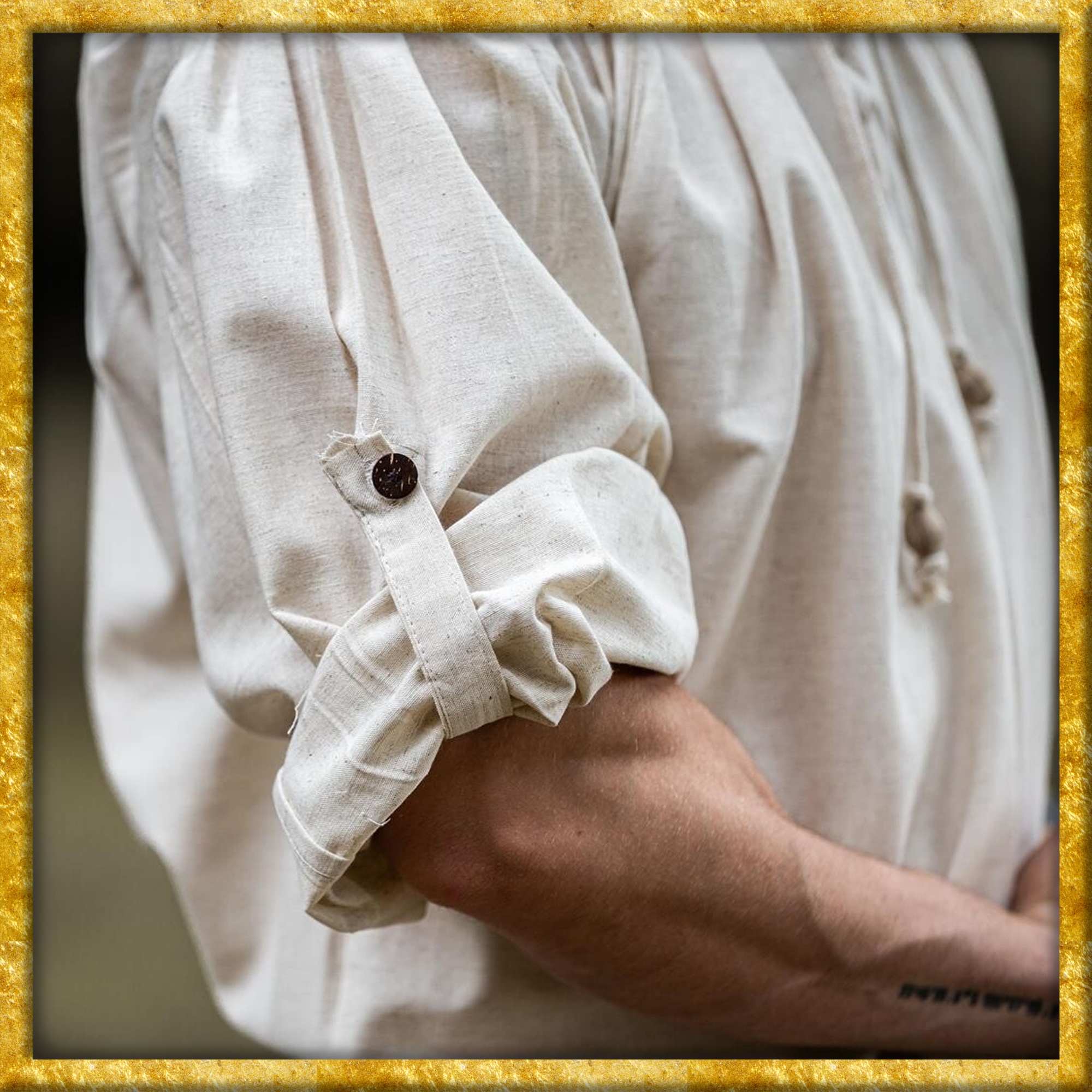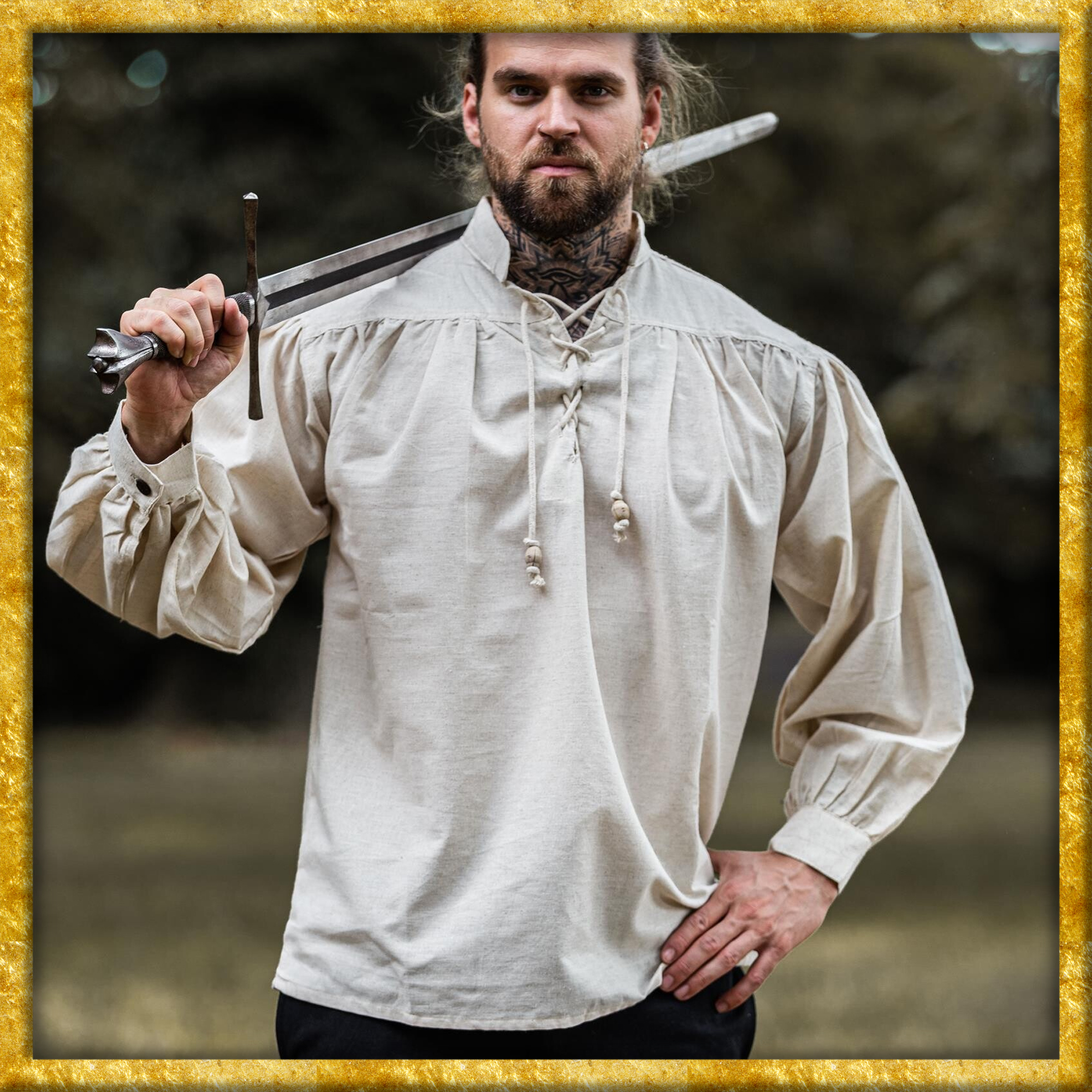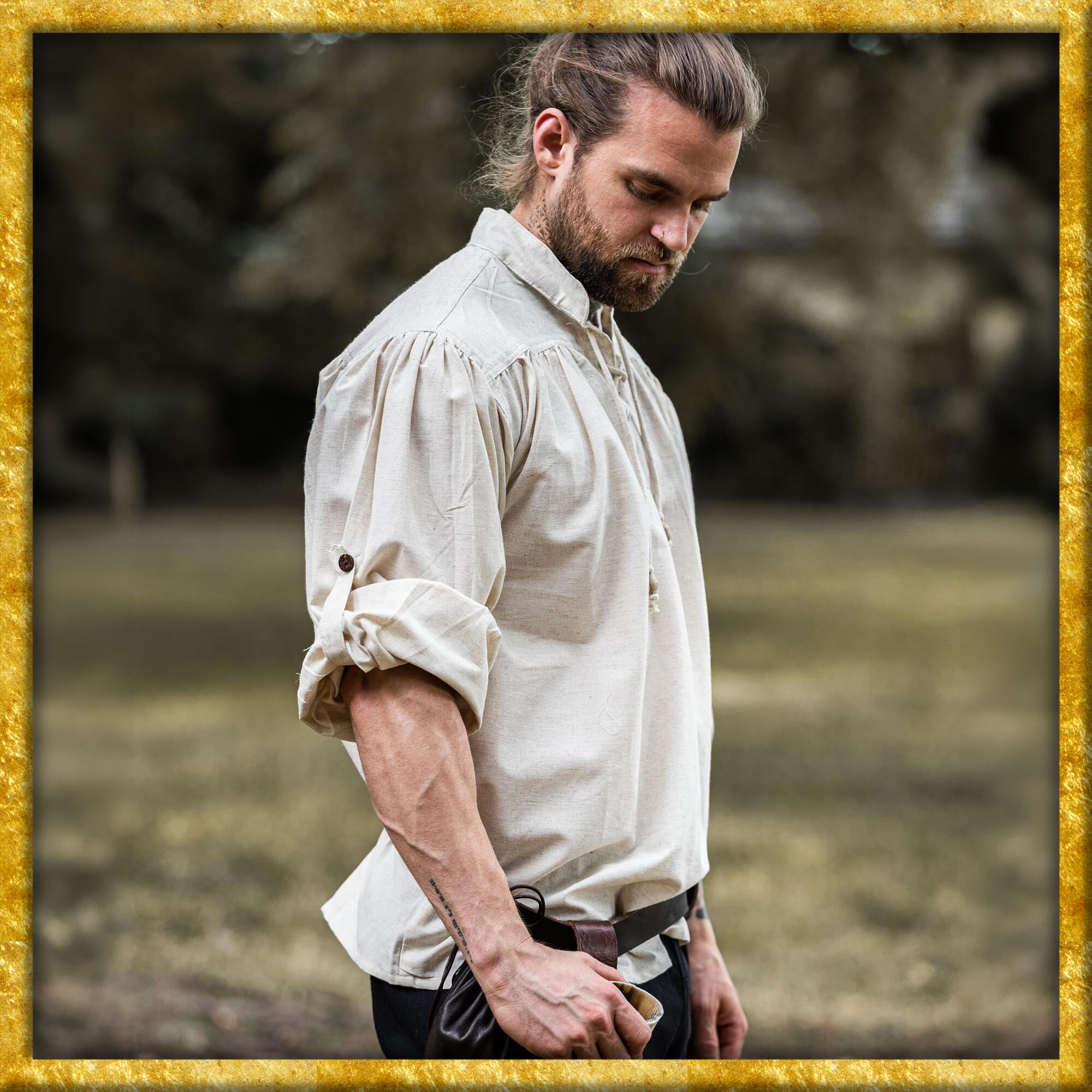 Dieses Hemd ist von klassischen mittelalterlichen Designs inspiriert und entführt dich in eine Zeit, in der Kleidung sowohl funktional als auch repräsentativ war. Die Schnürung am Kragen und die umnähte Knopflöcher sind nicht nur optische Highlights, sondern auch ein Zeugnis der Handwerkskunst jener Tage. Solche Hemden wurden von Reisenden und Abenteurern getragen, die auf ihren Reisen Komfort und Stil gleichermaßen schätzten.