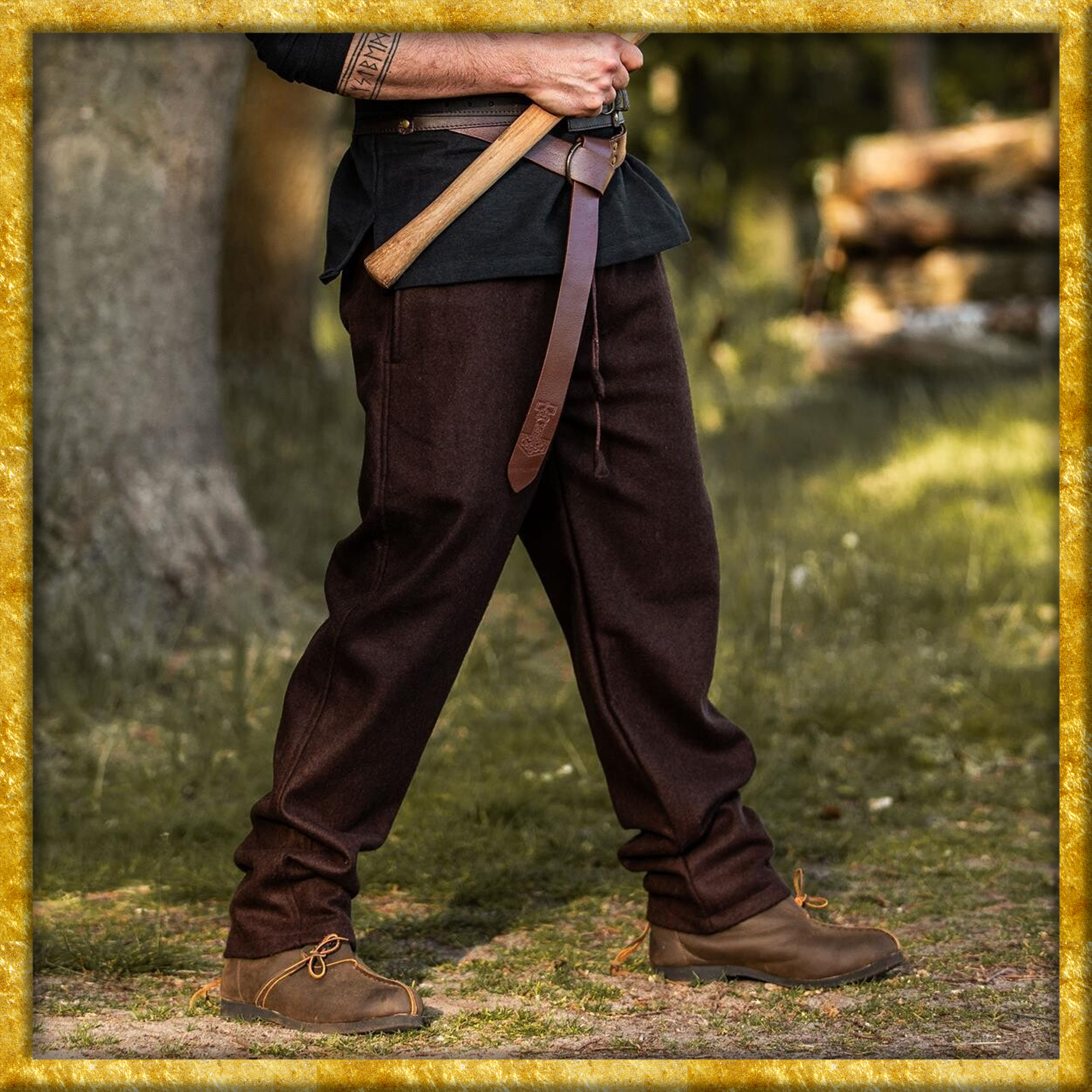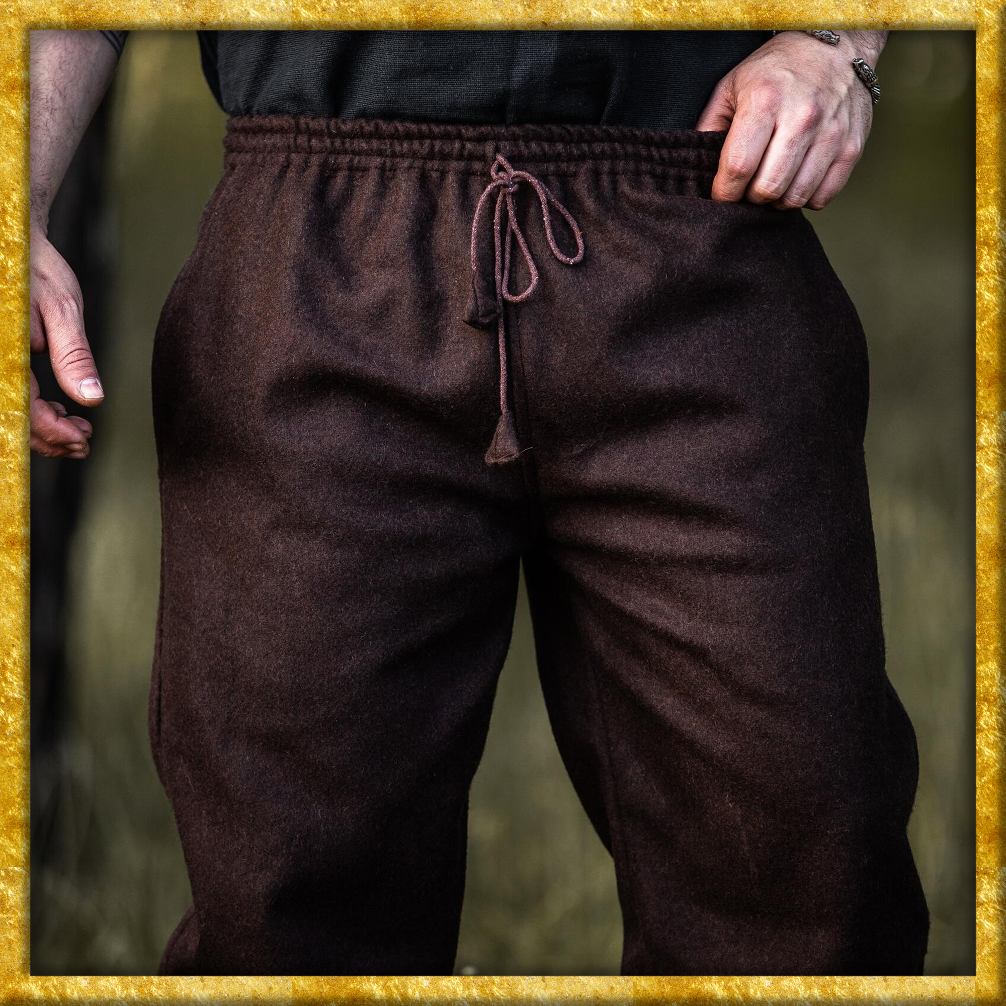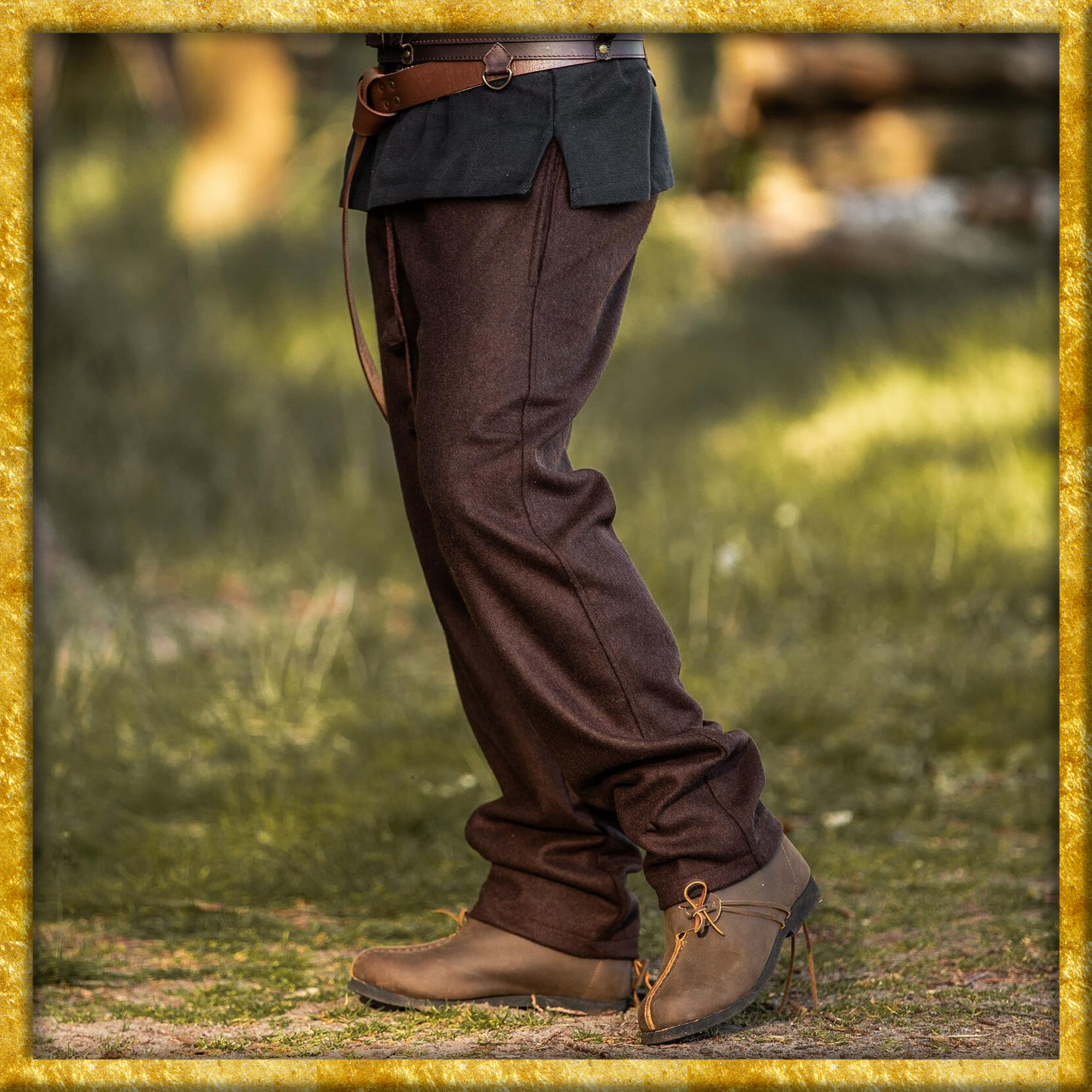 Authentische und rustikale Mittelalter Wollhose in Grau, Dunkelbraun oder Schwarz. Sie ist gerade geschnitten und verfügt über einen Gumizug am Bund. Ideal als Kleidungsstück für das ländliche Volk des Mittelalters.