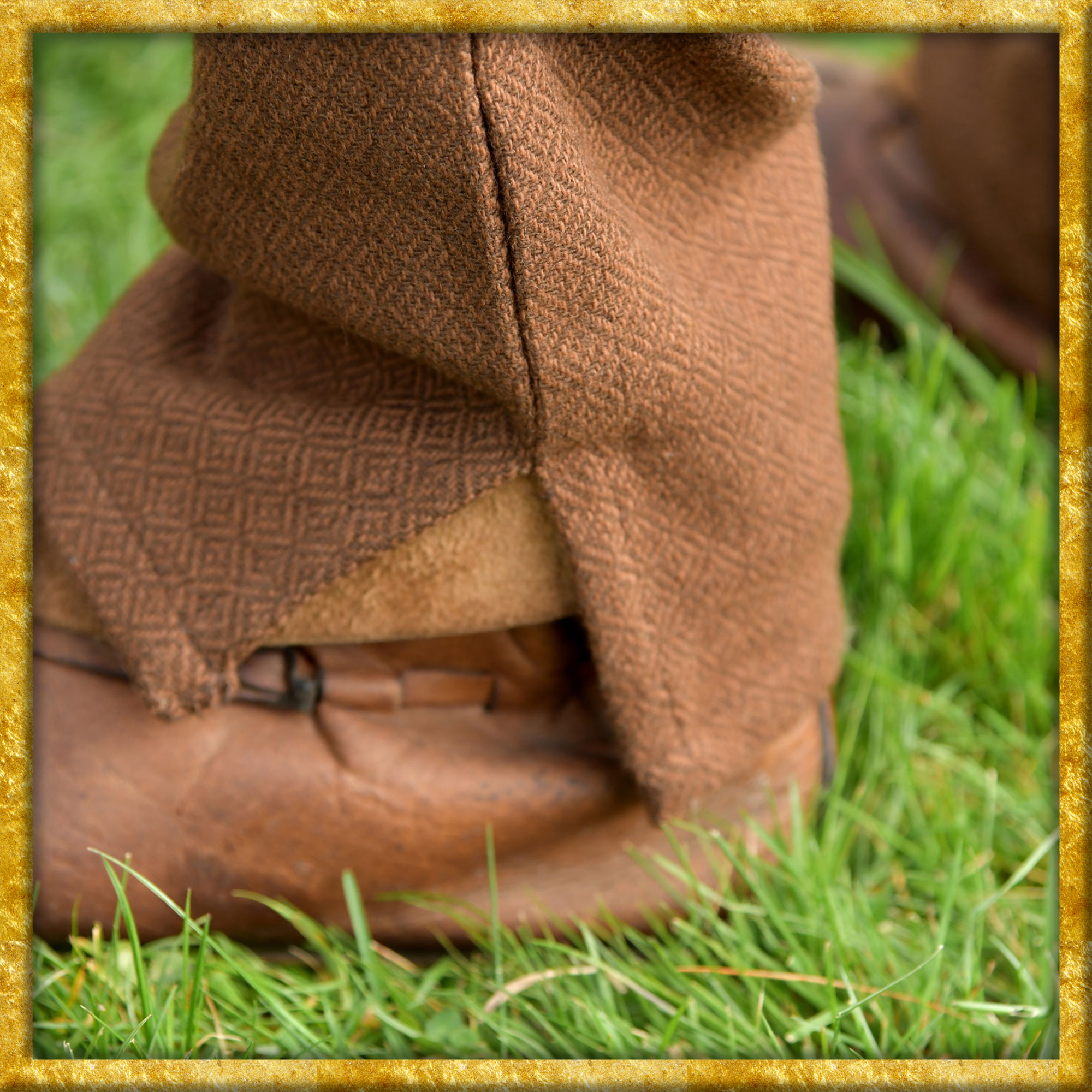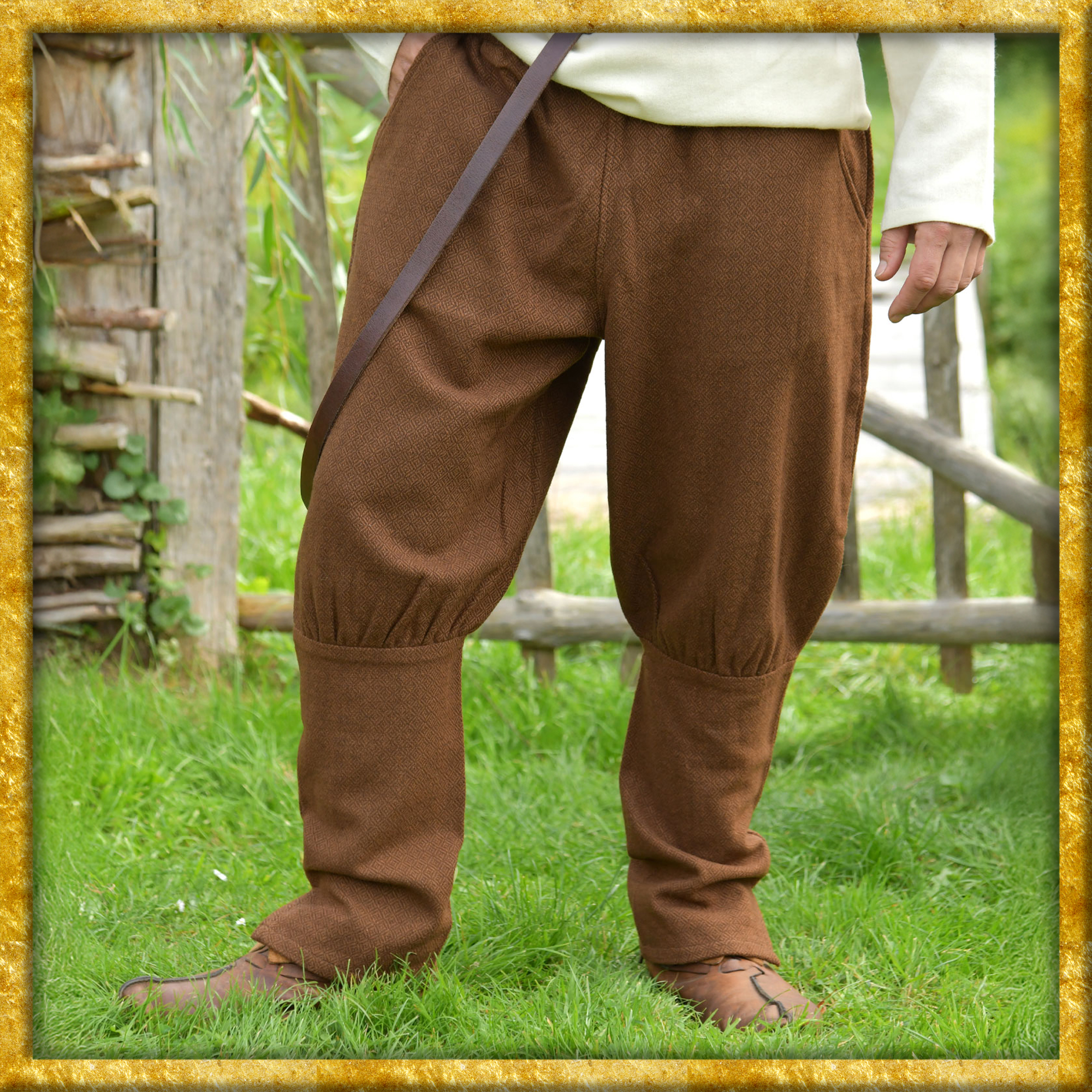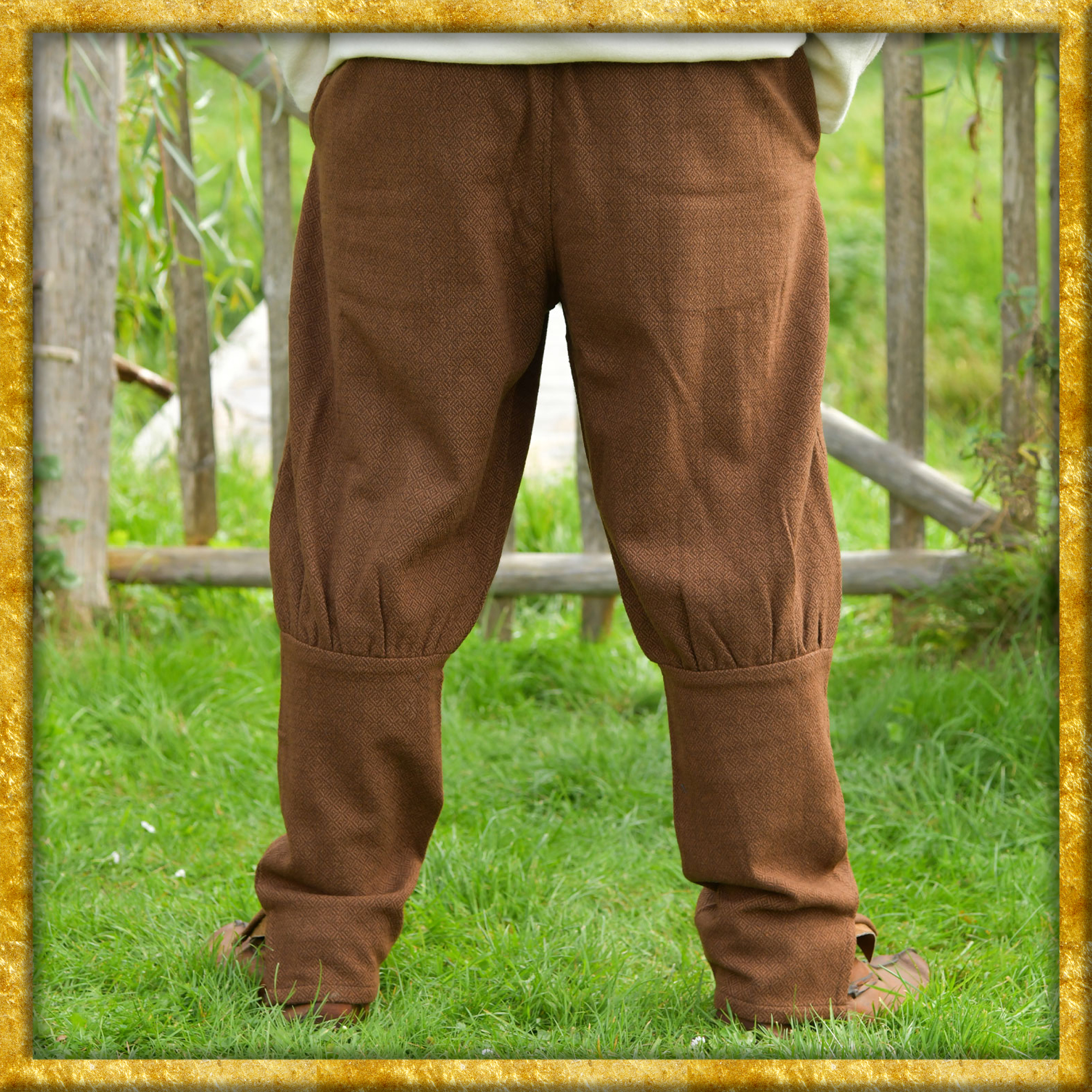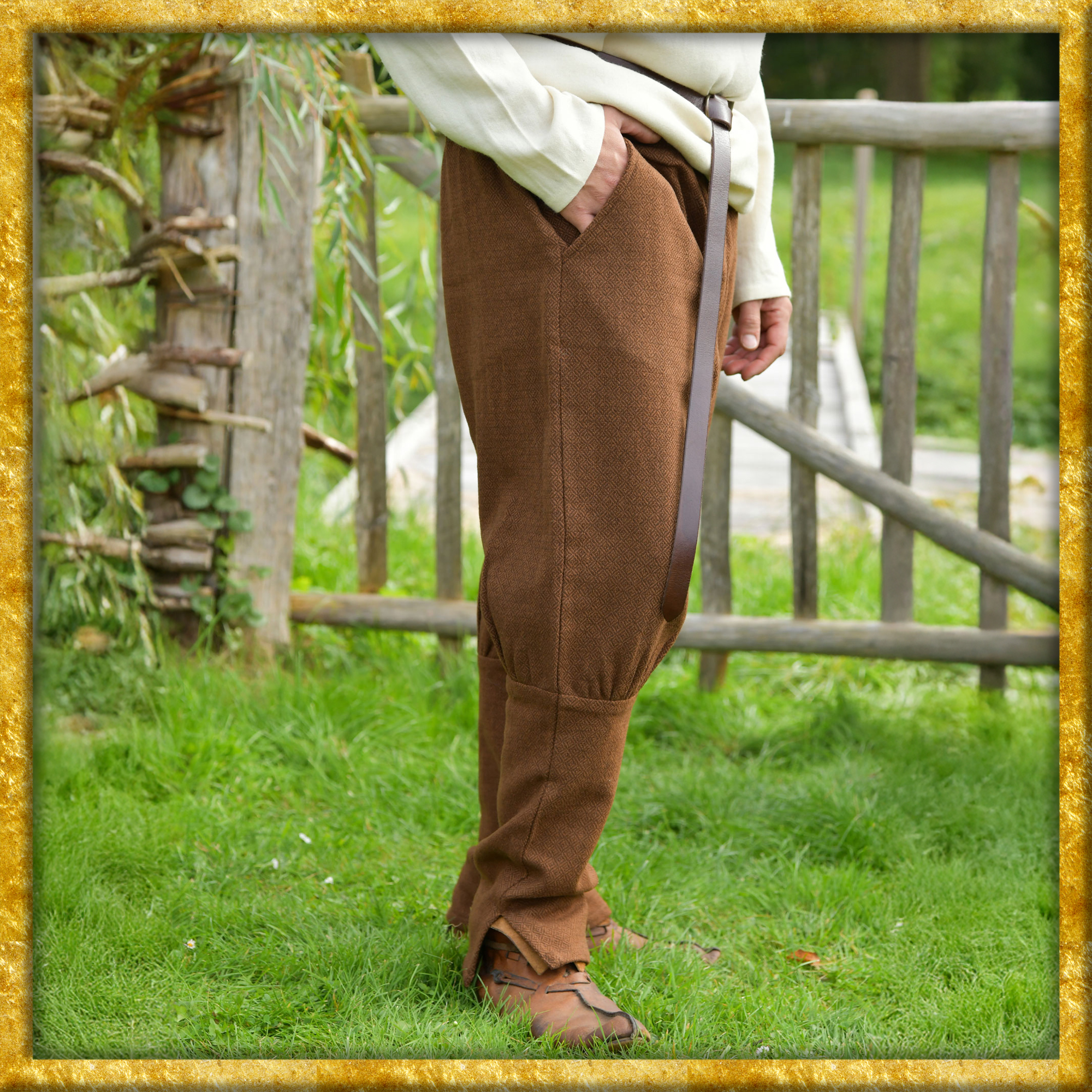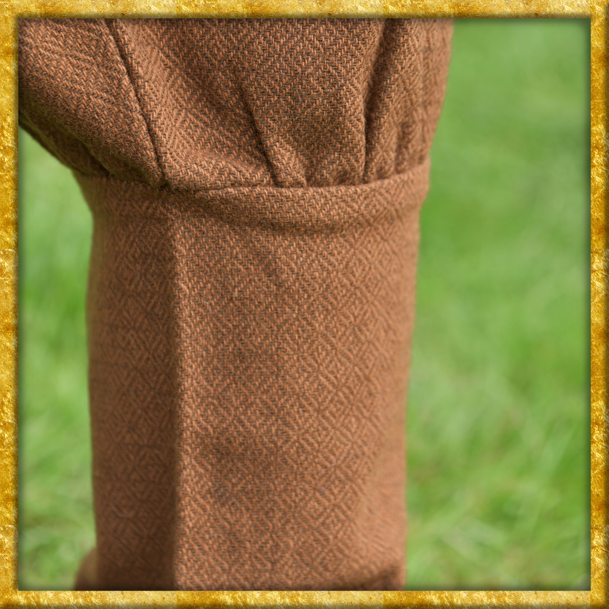 Die Hose ist oben weit und pludrig geschnitten, verjüngt sich ab dem Knie deutlich und endet in einem geschlitzten Hosensaum. Dieser erleichtert das Anlegen von Wadenwickeln und sorgt dafür, dass die Hose problemlos über Schuhe gezogen werden kann. Für einen authentischen Wikinger-Look empfehlen wir die Hose mit Wadenwickeln zu kombinieren.