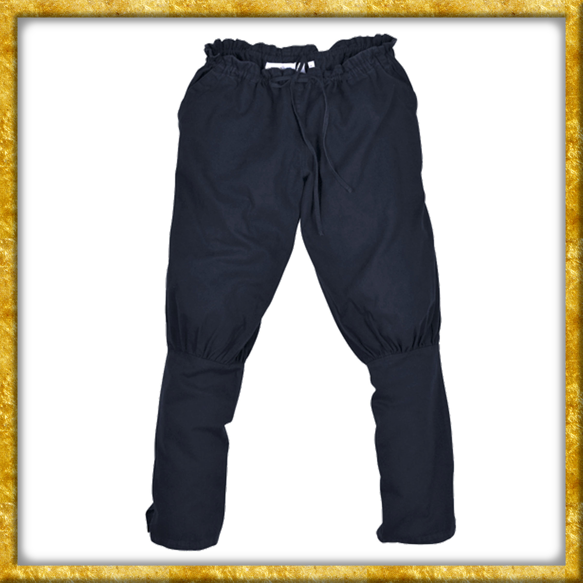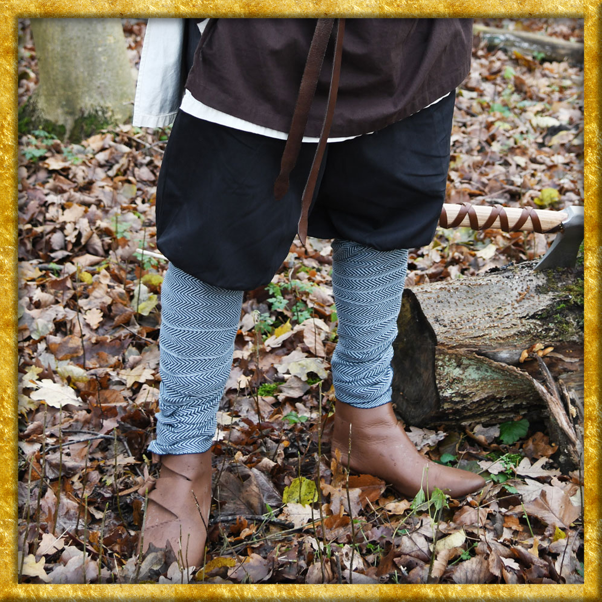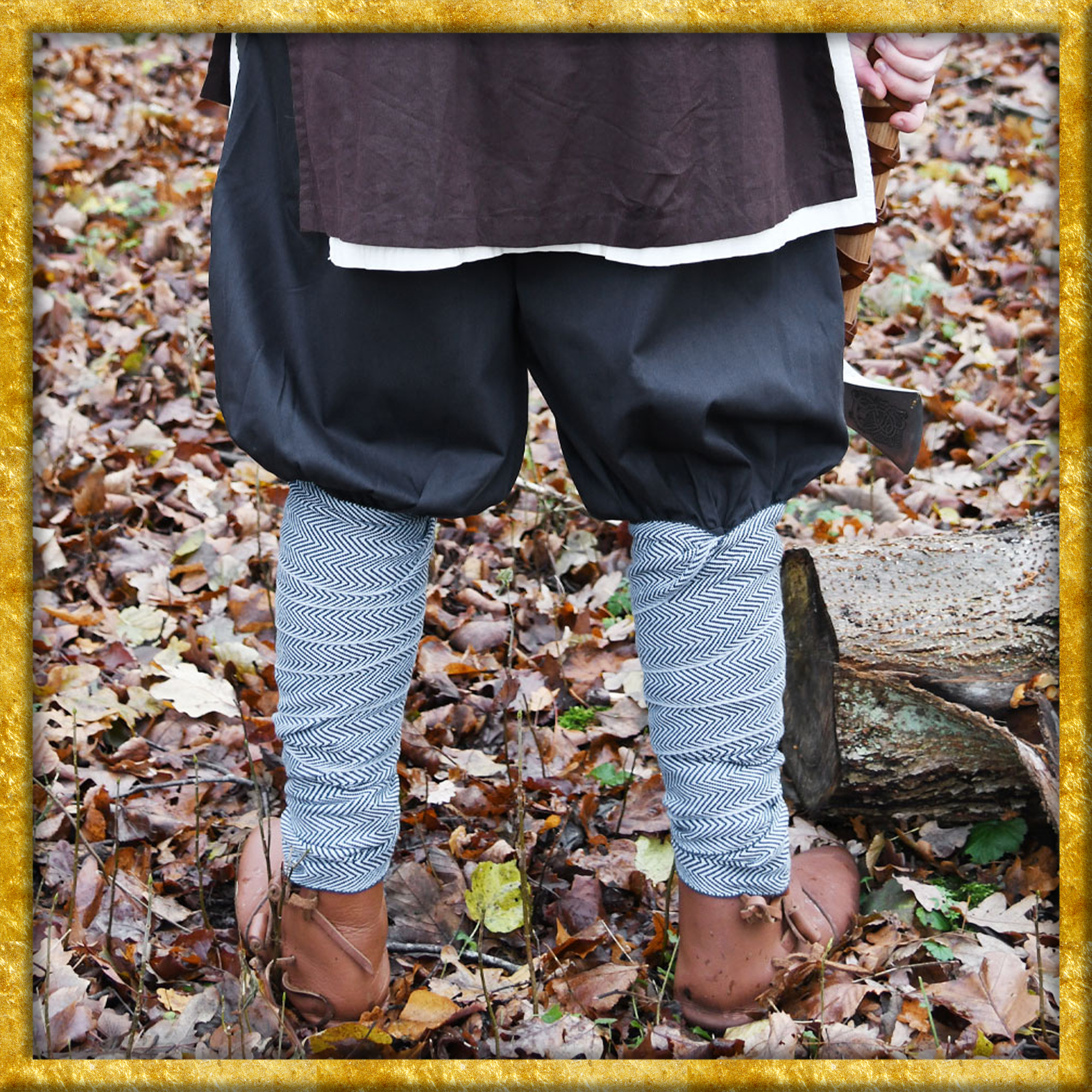 Diese dunkelblaue Wikingerhose ist sicherlich das signifikanteste Kleidungsstück für die Darstellung eines Wikingers oder Slawen. Sie ist oben sehr voluminös geschnitten und unterhalb des Knies ist sie gerafft und verjüngt sich. Der enge Part kann mit Wadenwickeln überwickelt werden. Der Bund ist sehr weit und wird mit einem Tunnelzug individuell angepasst. Seitliche Eingriffstaschen und kleine Schlitze am Saum erhöhen den Tragekomfort. Die Hose ist aus Baumwollstoff gefertigt und wurde vorgewaschen, dadurch erhält sie einen authentischen Look und einen angenehmen Tragekomfort.