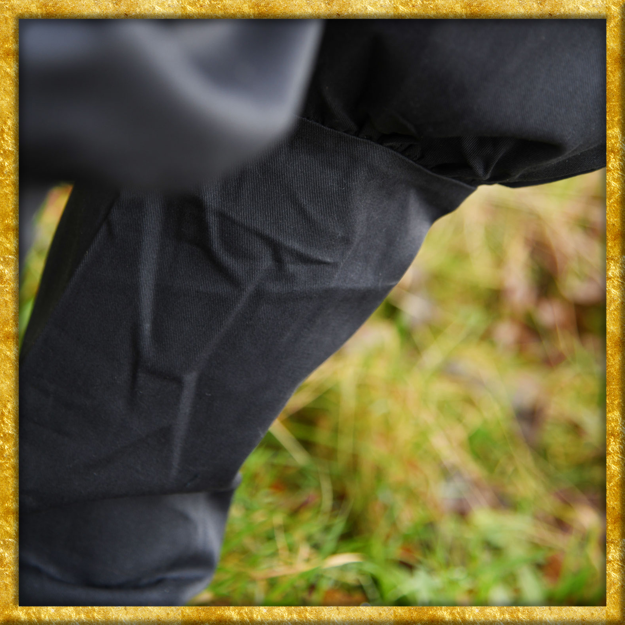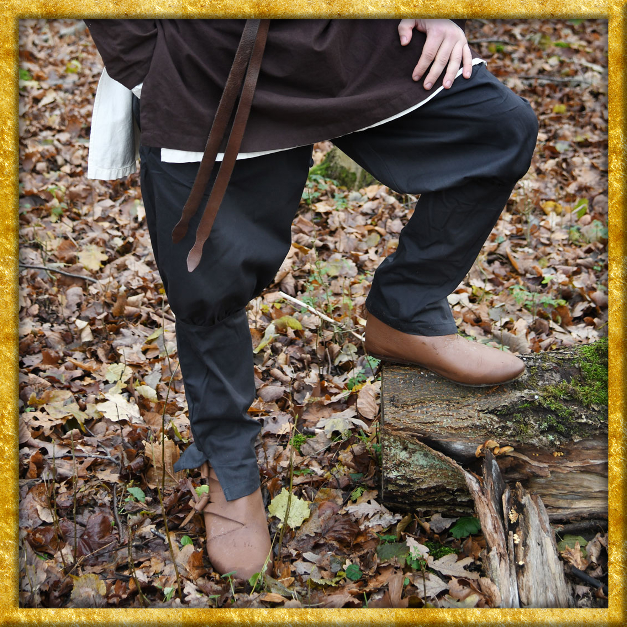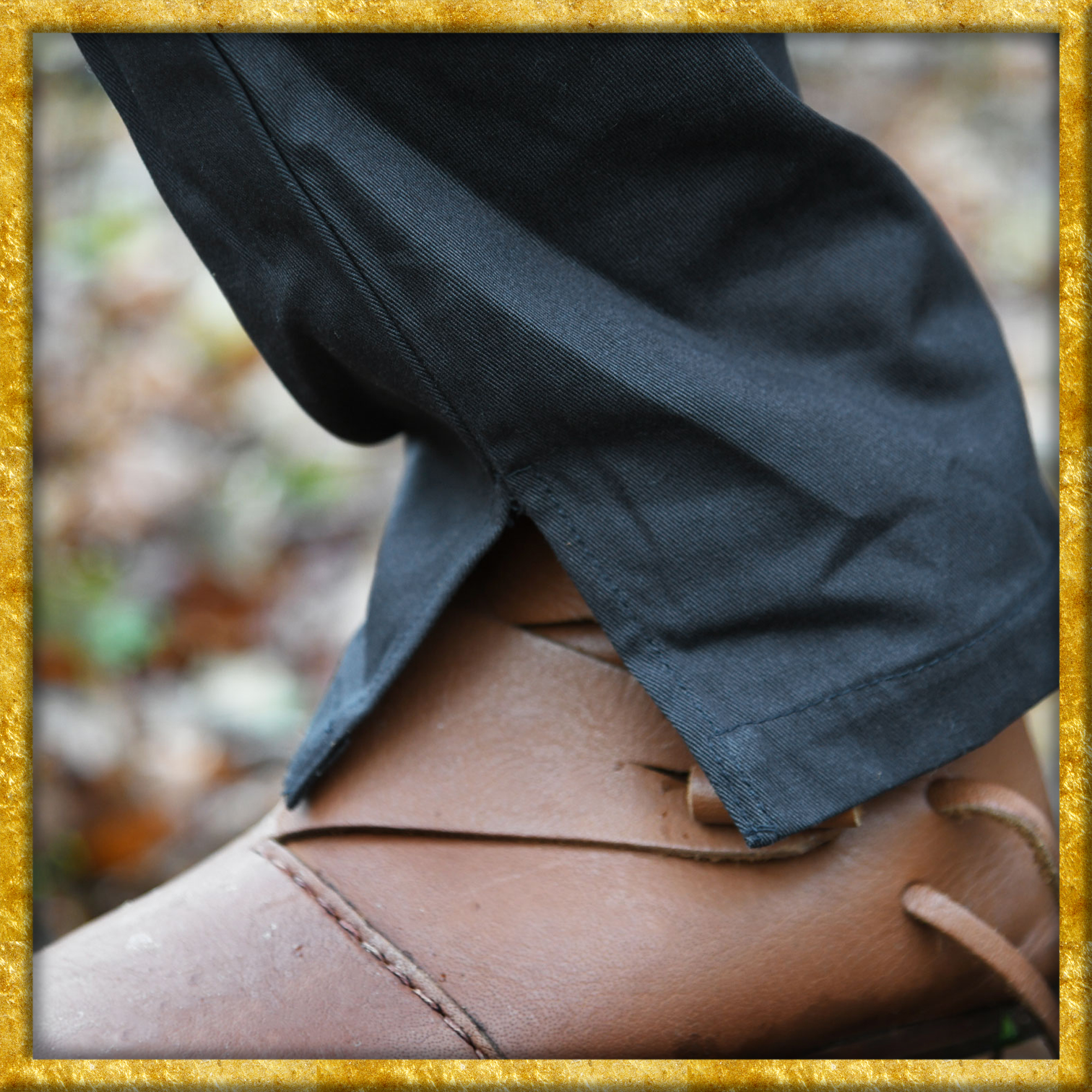Diese dunkelblaue Wikingerhose ist sicherlich das signifikanteste Kleidungsstück für die Darstellung eines Wikingers oder Slawen. Sie ist oben sehr voluminös geschnitten und unterhalb des Knies ist sie gerafft und verjüngt sich. Der enge Part kann mit Wadenwickeln überwickelt werden. Der Bund ist sehr weit und wird mit einem Tunnelzug individuell angepasst. Seitliche Eingriffstaschen und kleine Schlitze am Saum erhöhen den Tragekomfort. Die Hose ist aus Baumwollstoff gefertigt und wurde vorgewaschen, dadurch erhält sie einen authentischen Look und einen angenehmen Tragekomfort.