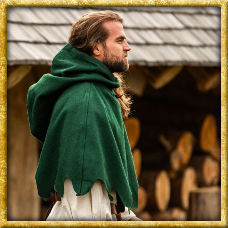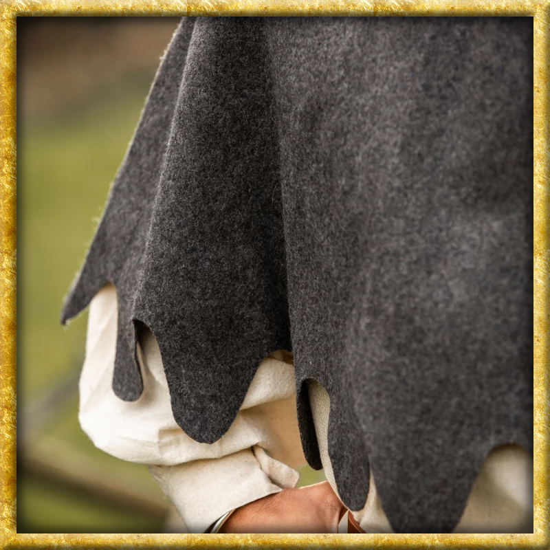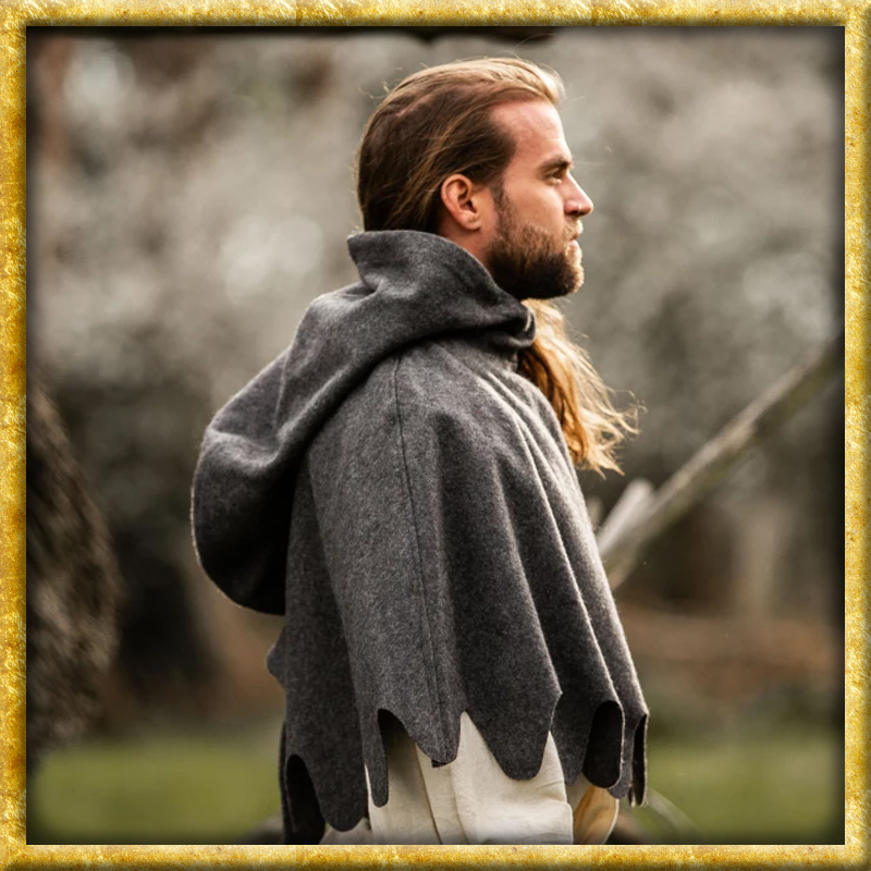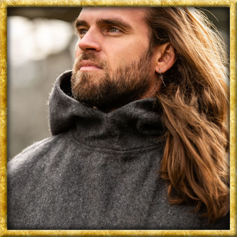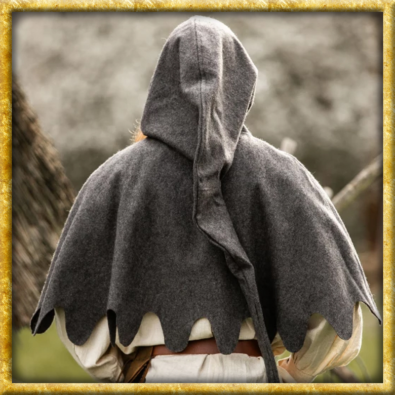 Deine Gugel mit Zaddeln aus Wollgemisch schützt dich vor Wind und Wetter auf deinen Reisen durch das mittelalterliche Land. Die Zaddeln flattern im Wind, während du die alten Pfade entlangwanderst, und ziehen die Blicke der Menschen auf sich. Das weiche, aber robuste Material hält dich warm und trocken, egal wie rau das Klima wird. Jeder Stich und jede Naht dieser Gugel erzählt von den Fertigkeiten des Handwerkers, der sie gefertigt hat. Mit jedem Schritt bist du bereit für neue Abenteuer.