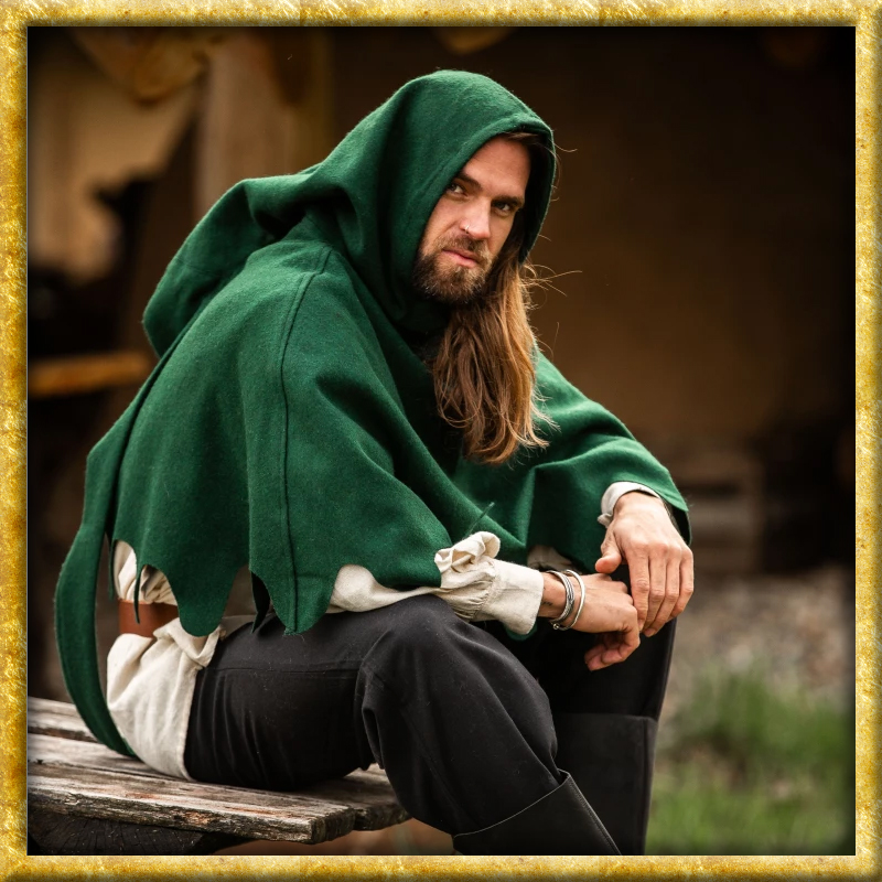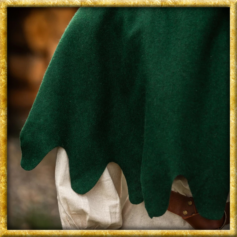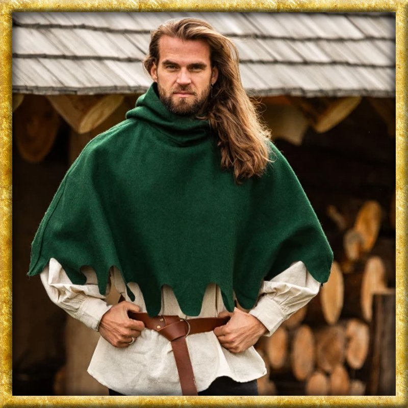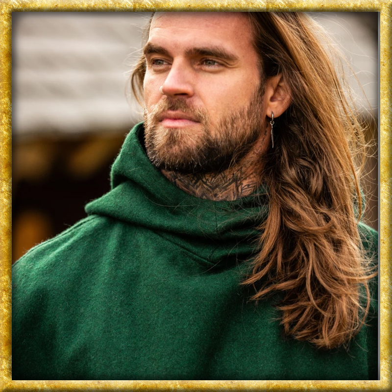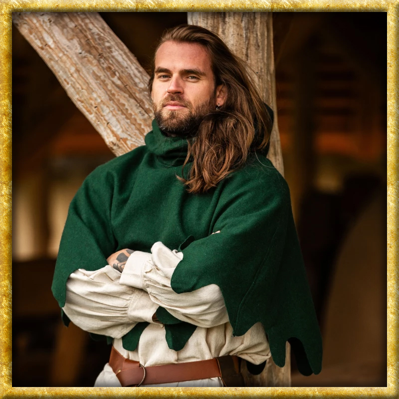 Deine Gugel mit Zaddeln aus Wollgemisch schützt dich vor Wind und Wetter auf deinen Reisen durch das mittelalterliche Land. Die Zaddeln flattern im Wind, während du die alten Pfade entlangwanderst, und ziehen die Blicke der Menschen auf sich. Das weiche, aber robuste Material hält dich warm und trocken, egal wie rau das Klima wird. Jeder Stich und jede Naht dieser Gugel erzählt von den Fertigkeiten des Handwerkers, der sie gefertigt hat. Mit jedem Schritt bist du bereit für neue Abenteuer.