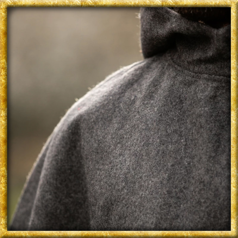 Diese mittelalterliche Gugel verfügt über eine Kapuze mit grossem Kragen und Zatteln. Danke des schweren Wollgemischs ist die Gugel bei leichtem Regen leicht wasserabweisend.