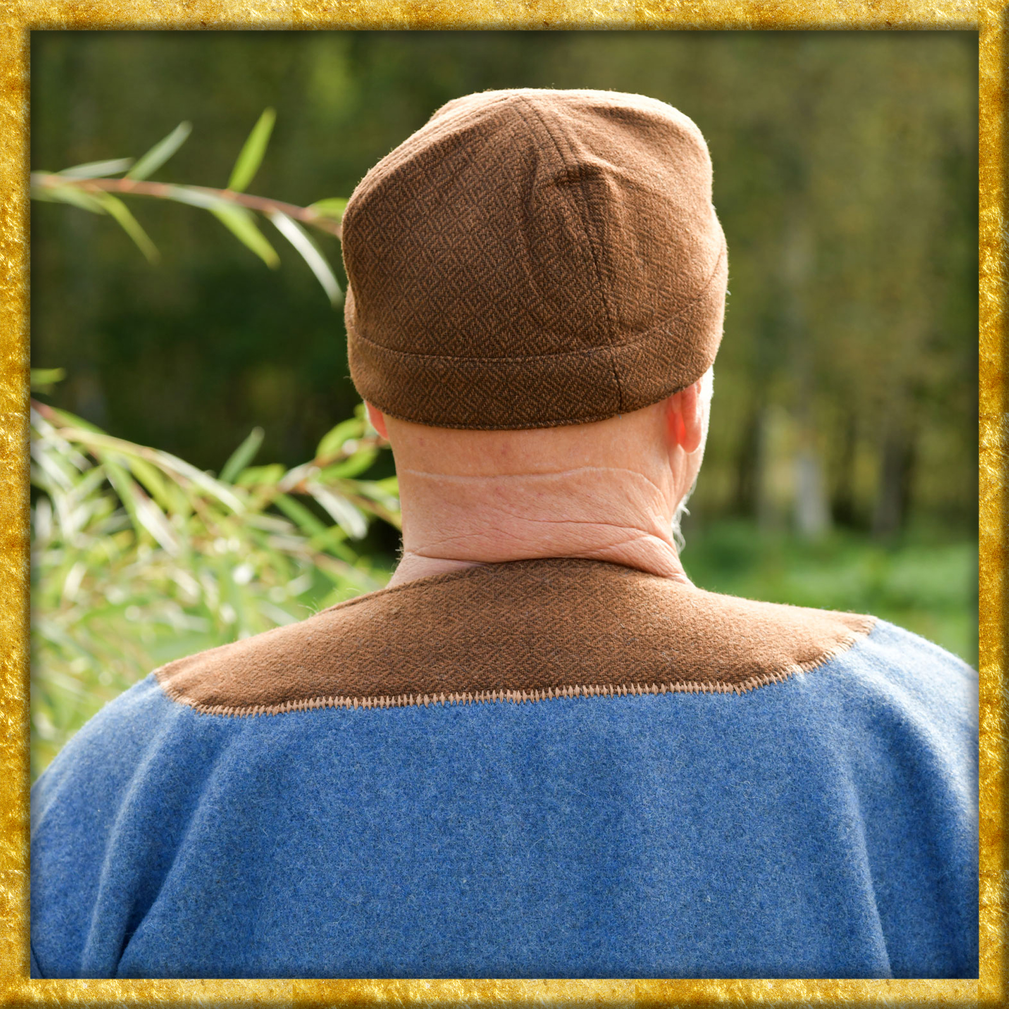 Die Wikinger-Mütze ist aus 100% hochwertiger Wolle in Diamantköperbindung gefertigt. Der Stoff besticht durch sein charakteristisches Rautenmuster, das durch die Verwendung von hell- und dunkelbraun in Kette und Schuss besonders schön zur Geltung kommt.