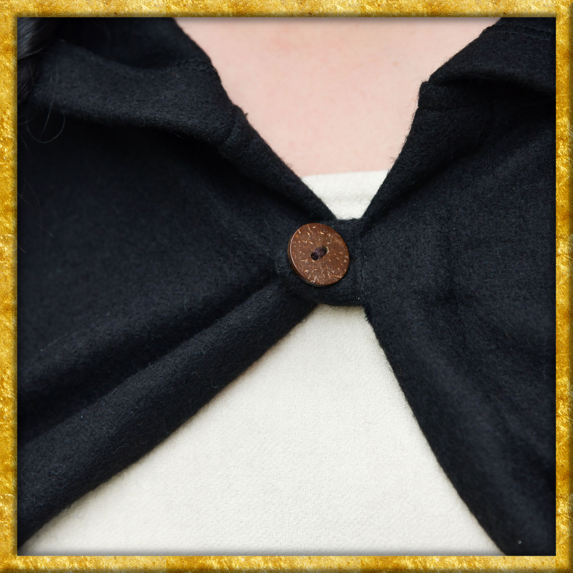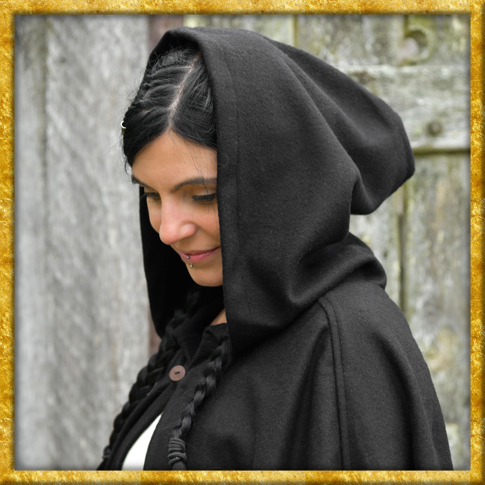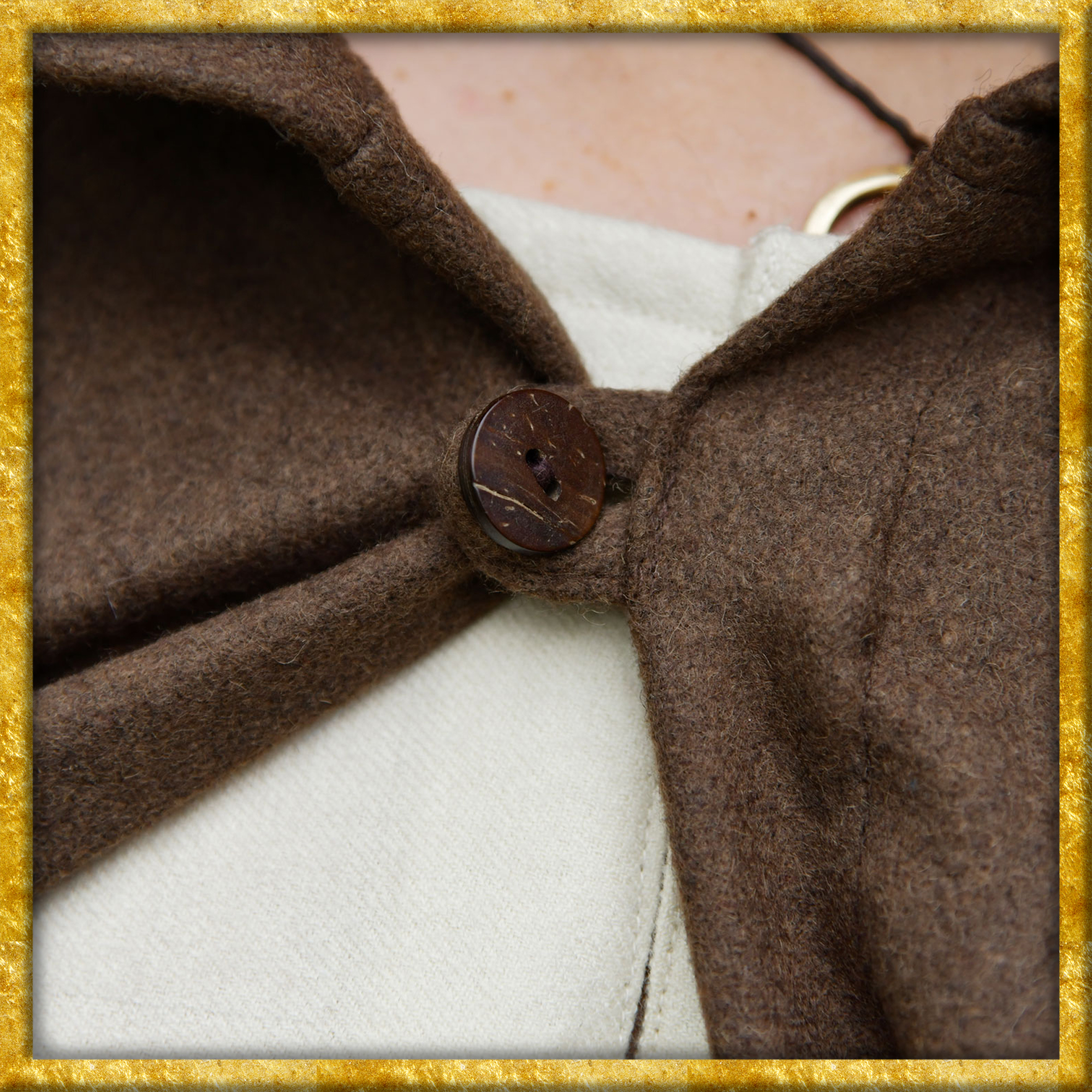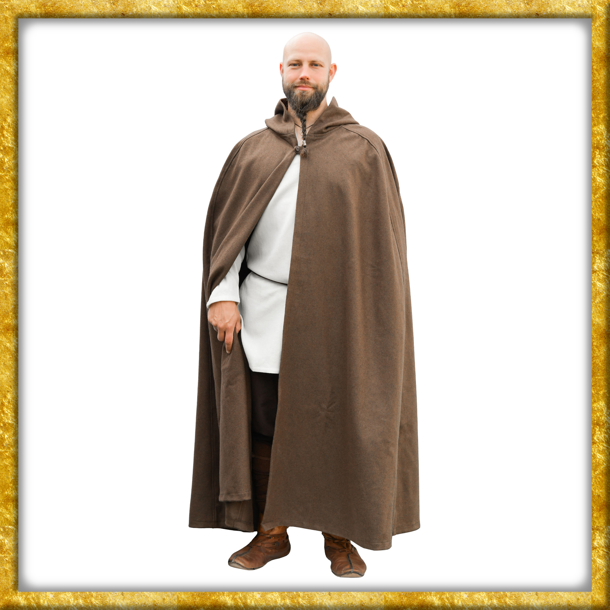 Tauche ein in die Welt der Wikinger mit unserem Wollumhang Jarven – einem unverzichtbaren Kleidungsstück für eine authentische Wikingergewandung. Inspiriert von historischen Funden und mit viel Liebe zum Detail gefertigt, vereint er ein historisches Erscheinungsbild mit moderner Verarbeitung. Der Umhang ist lang geschnitten und verfügt über eine grosszügige Kapuze, die zuverlässigen Schutz vor Wind und Kälte bietet. Verschlossen wird der Wollumhang mittels eines Holzknopfs.