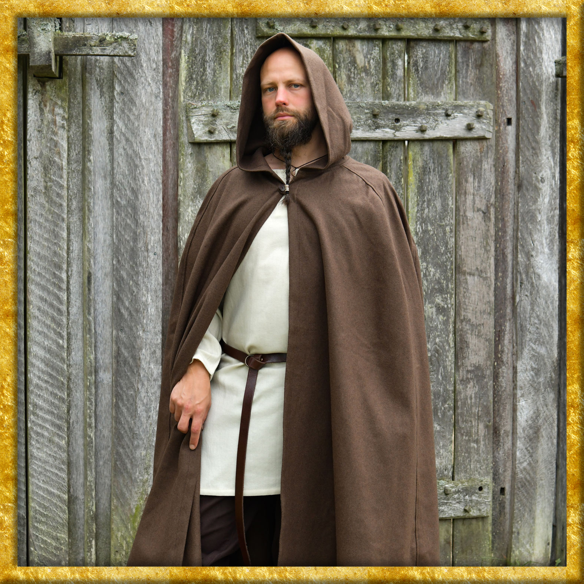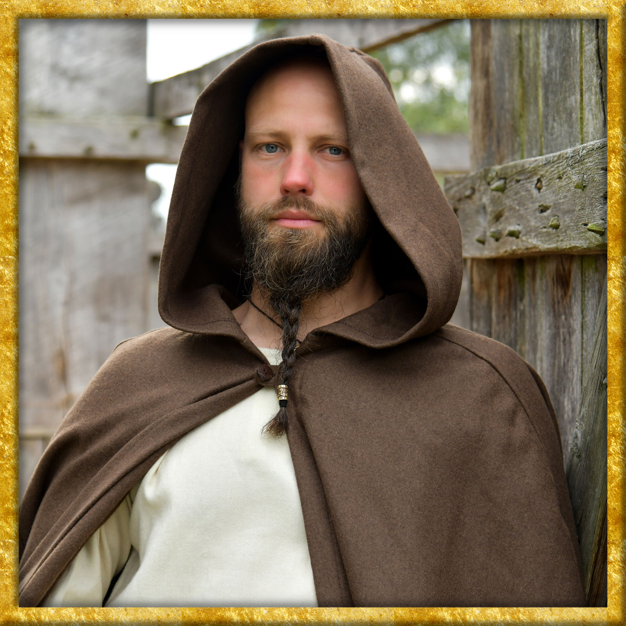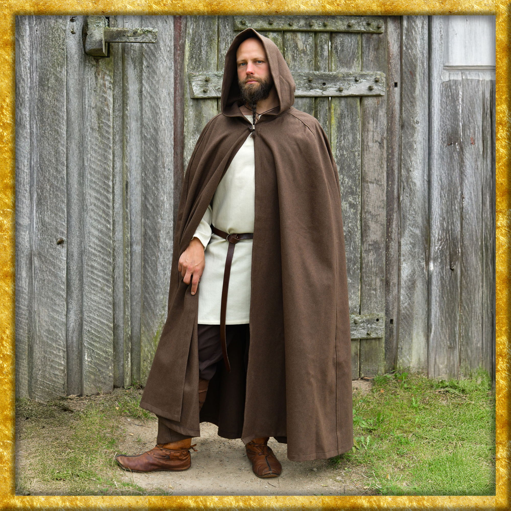 Umhänge wie dieser waren im Mittelalter fester Bestandteil der Gewandung und wurden von allen Ständen getragen. Es gab sie mit und ohne Kapuzen und in vielen unterschiedlichen Längen und Schnitten. Der Umhang schützte und wärmte bei schlechtem Wetter. Wem dies noch nicht genug Schutz bot, der trug zusätzlich noch eine Gugel.