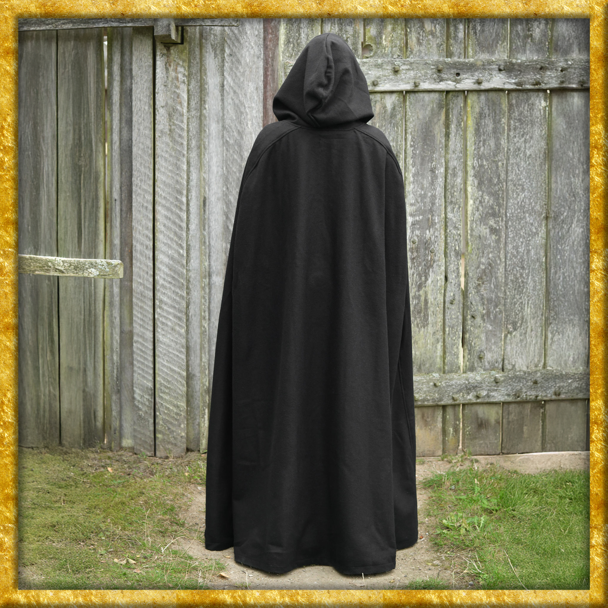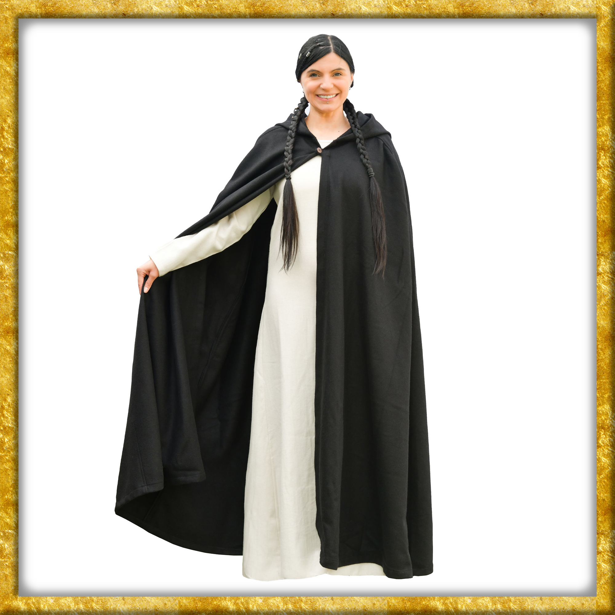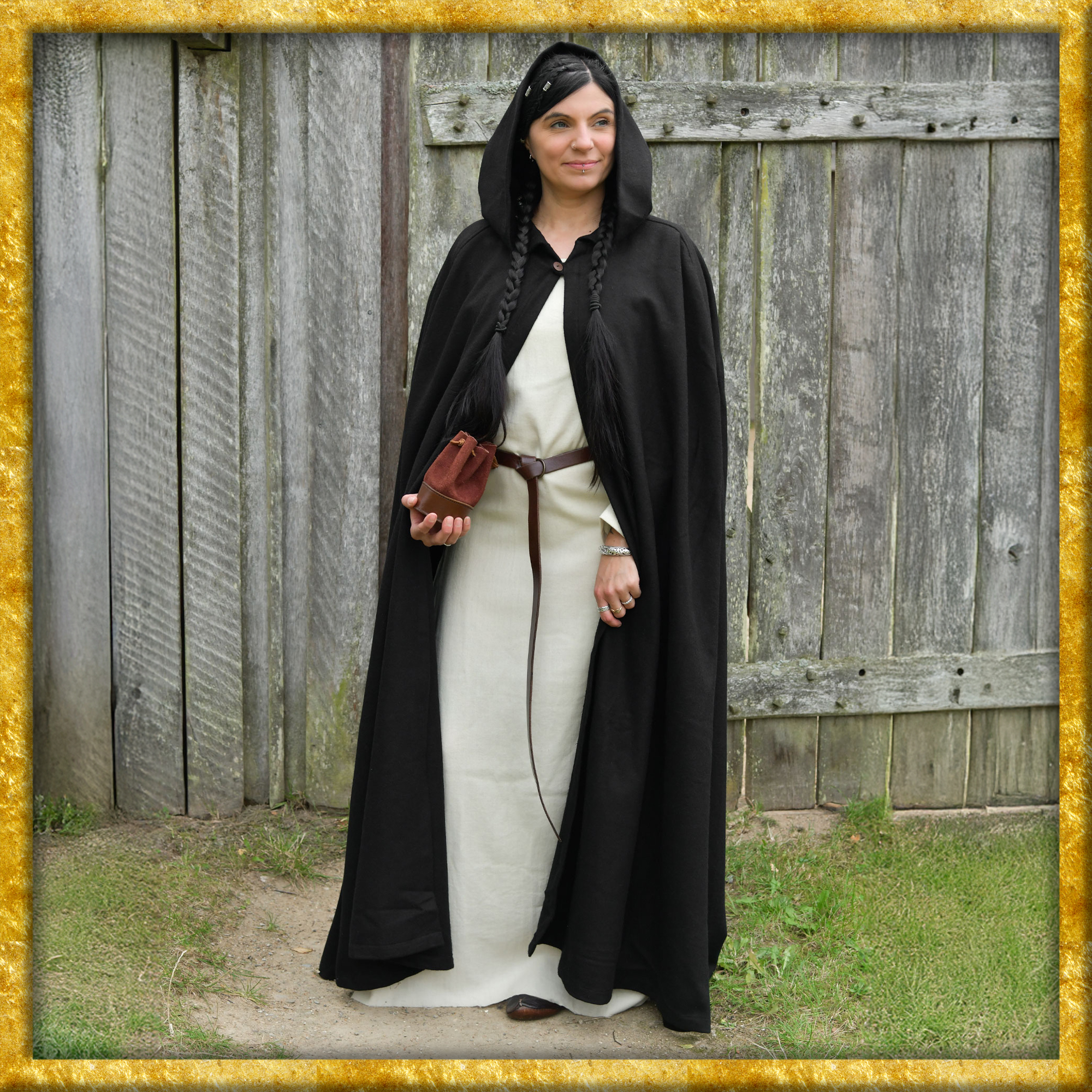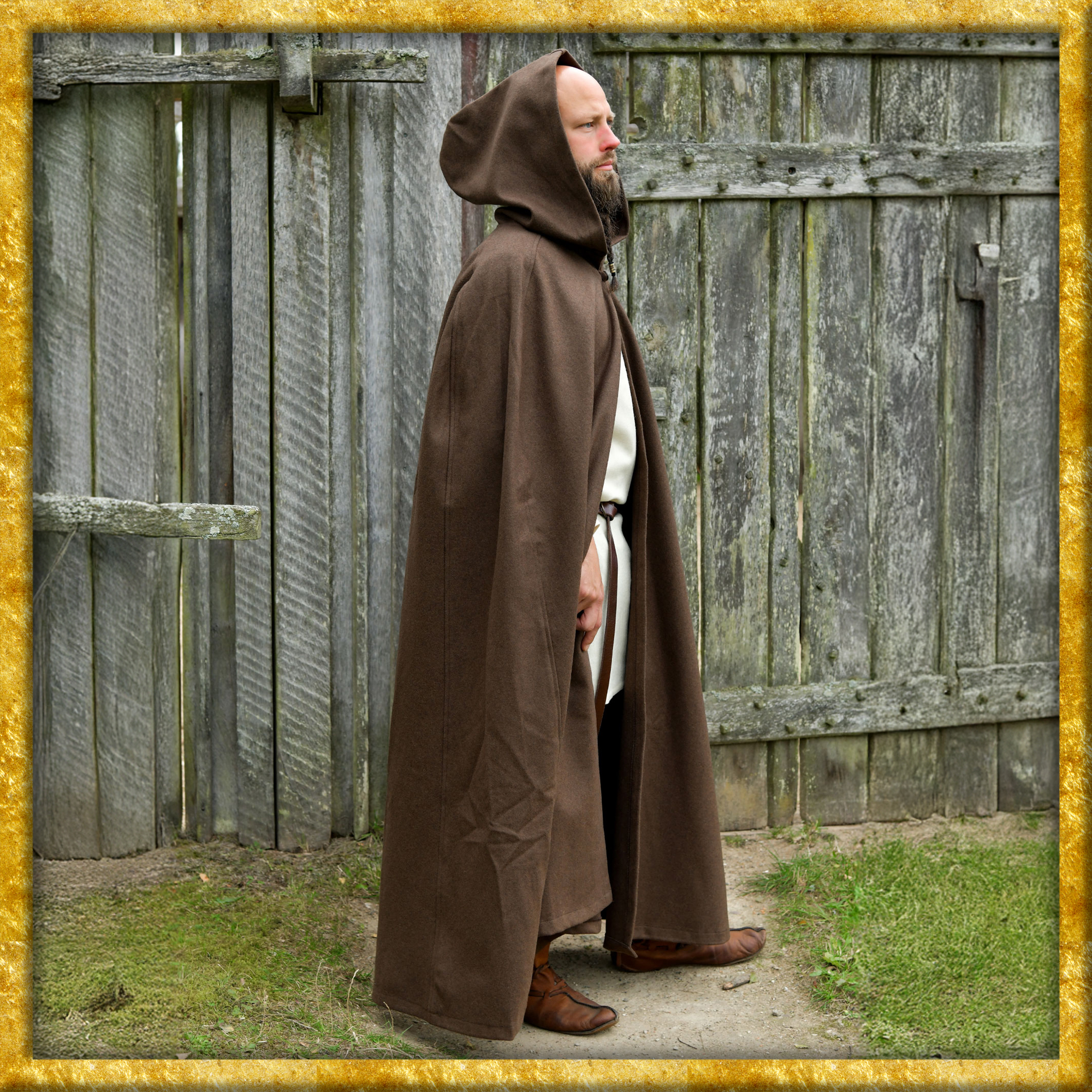 Umhänge wie dieser waren im Mittelalter fester Bestandteil der Gewandung und wurden von allen Ständen getragen. Es gab sie mit und ohne Kapuzen und in vielen unterschiedlichen Längen und Schnitten. Der Umhang schützte und wärmte bei schlechtem Wetter. Wem dies noch nicht genug Schutz bot, der trug zusätzlich noch eine Gugel.
