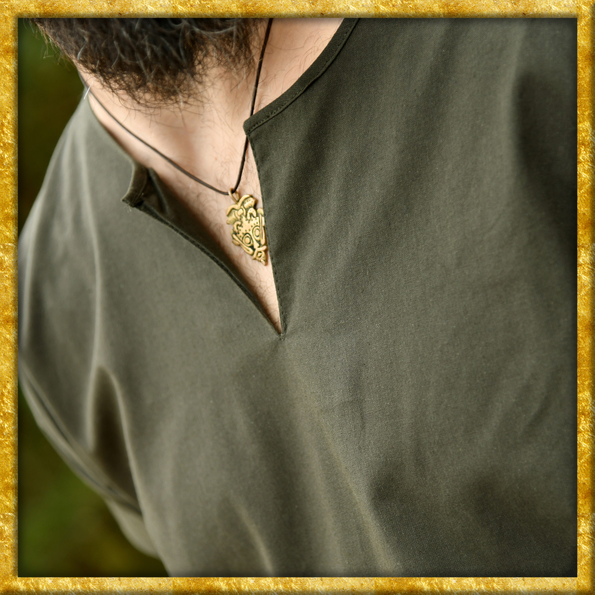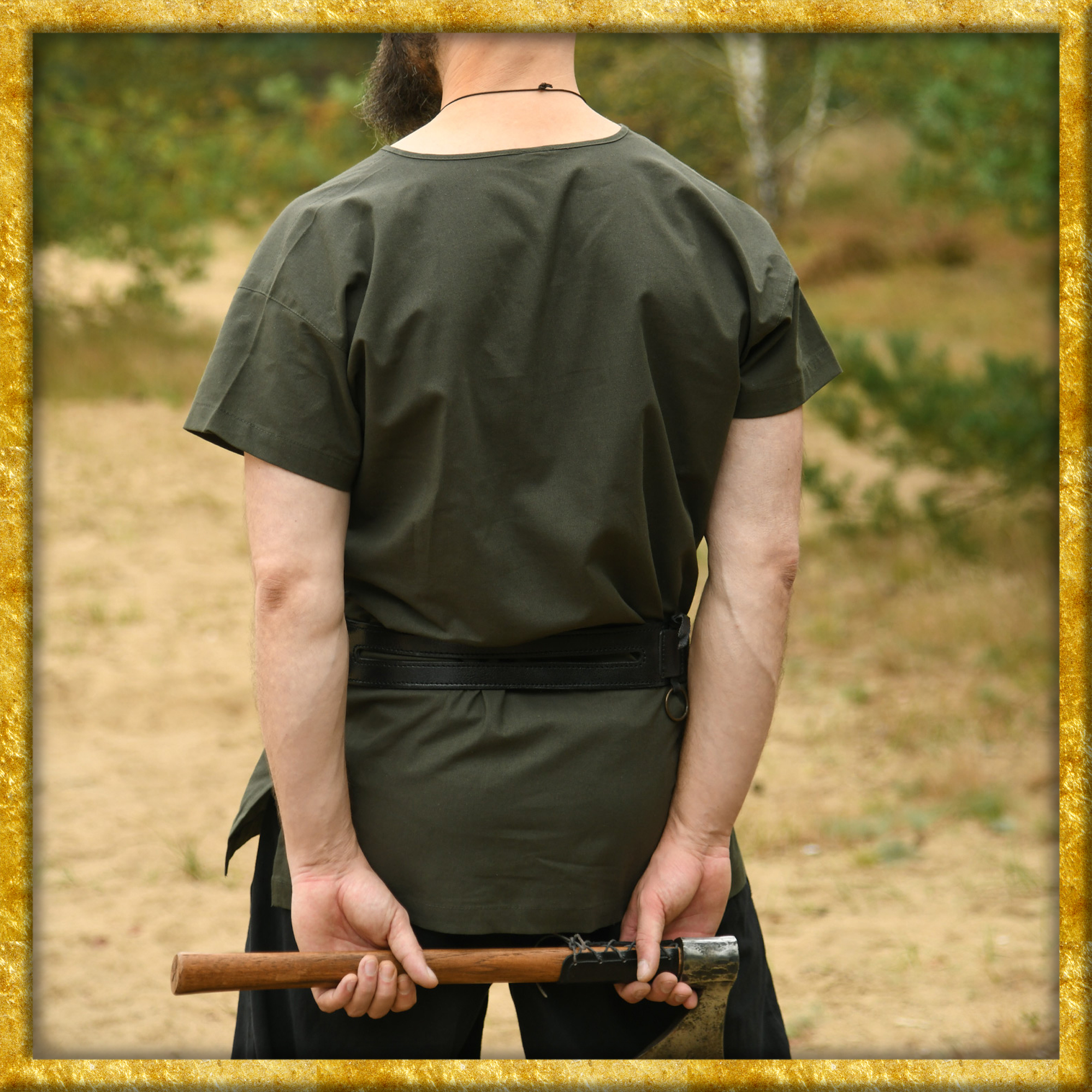 Vielseitig einsetzbare Tunika aus leichtem, olivegrün gefärbtem Baumwollstoff. Der Rundhalsausschnitt ist in der vorderen Mitte mit einem Schlitz versehen. Der Schlitz wird je nach Belieben mit einer Fibel geschlossen oder einfach offen getragen. Schlitze an den Seitennähten erhöhen den Tragekomfort. Tragbar als Ober- und Untergewand. Im Sommer ist die Tunika ein luftiges Obergewand und im Winter schützt sie als Leibhemd die Oberkleidung vor Schweiss.