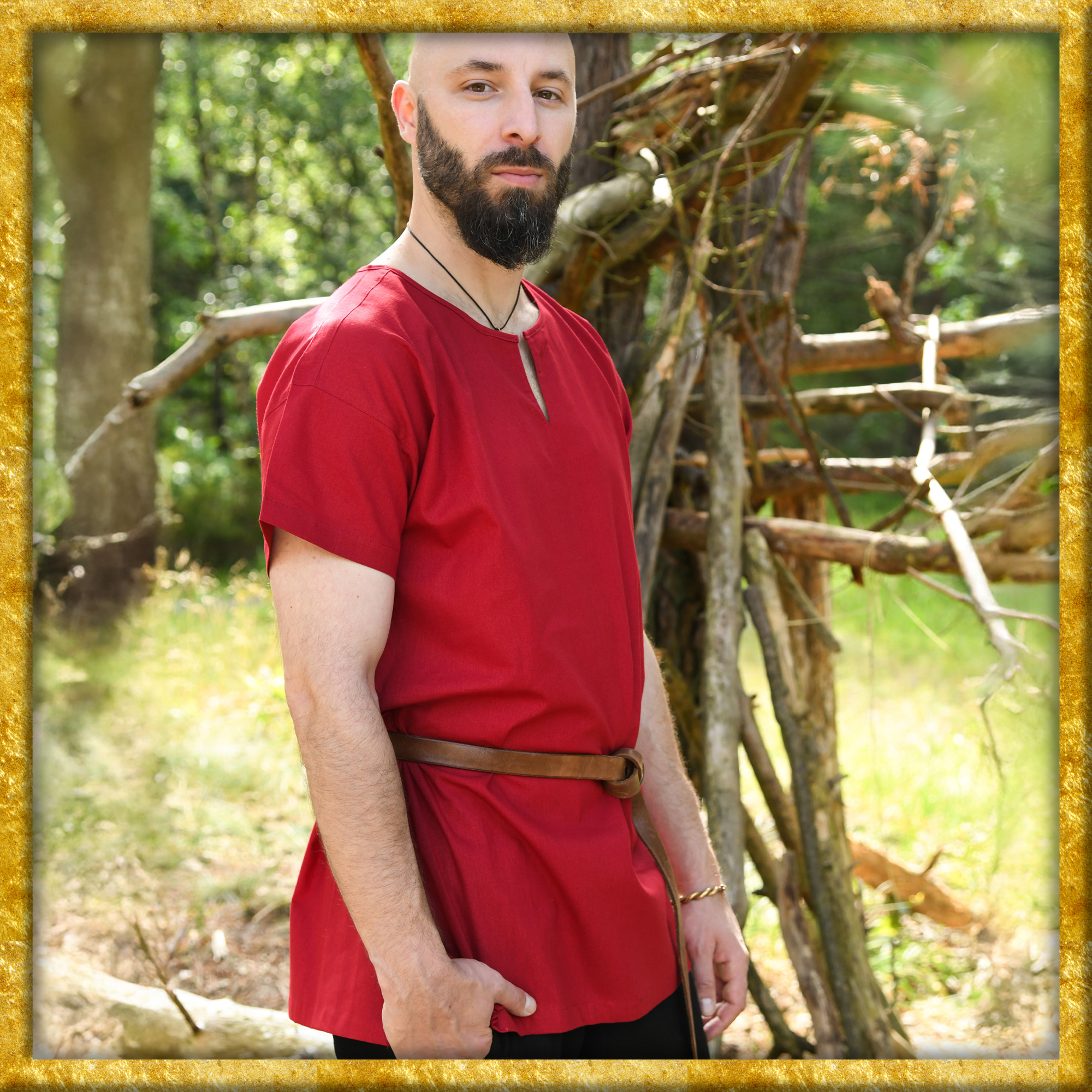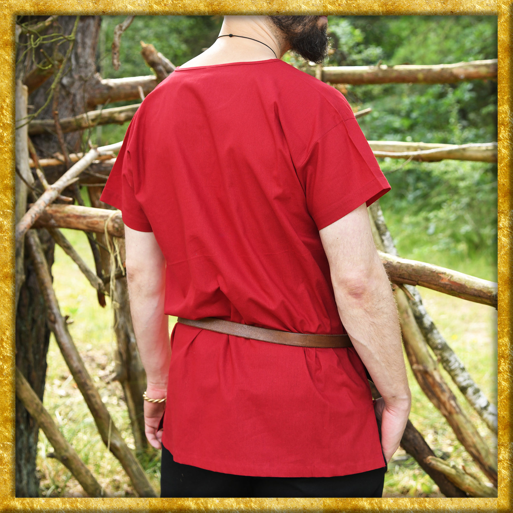 Vielseitig einsetzbare Tunika aus leichtem, rot gefärbtem Baumwollstoff. Der Rundhalsausschnitt ist in der vorderen Mitte mit einem Schlitz versehen. Der Schlitz wird je nach Belieben mit einer Fibel geschlossen oder einfach offen getragen. Schlitze an den Seitennähten erhöhen den Tragekomfort. Tragbar als Ober- und Untergewand. Im Sommer ist die Tunika ein luftiges Obergewand und im Winter schützt sie als Leibhemd die Oberkleidung vor Schweiss.