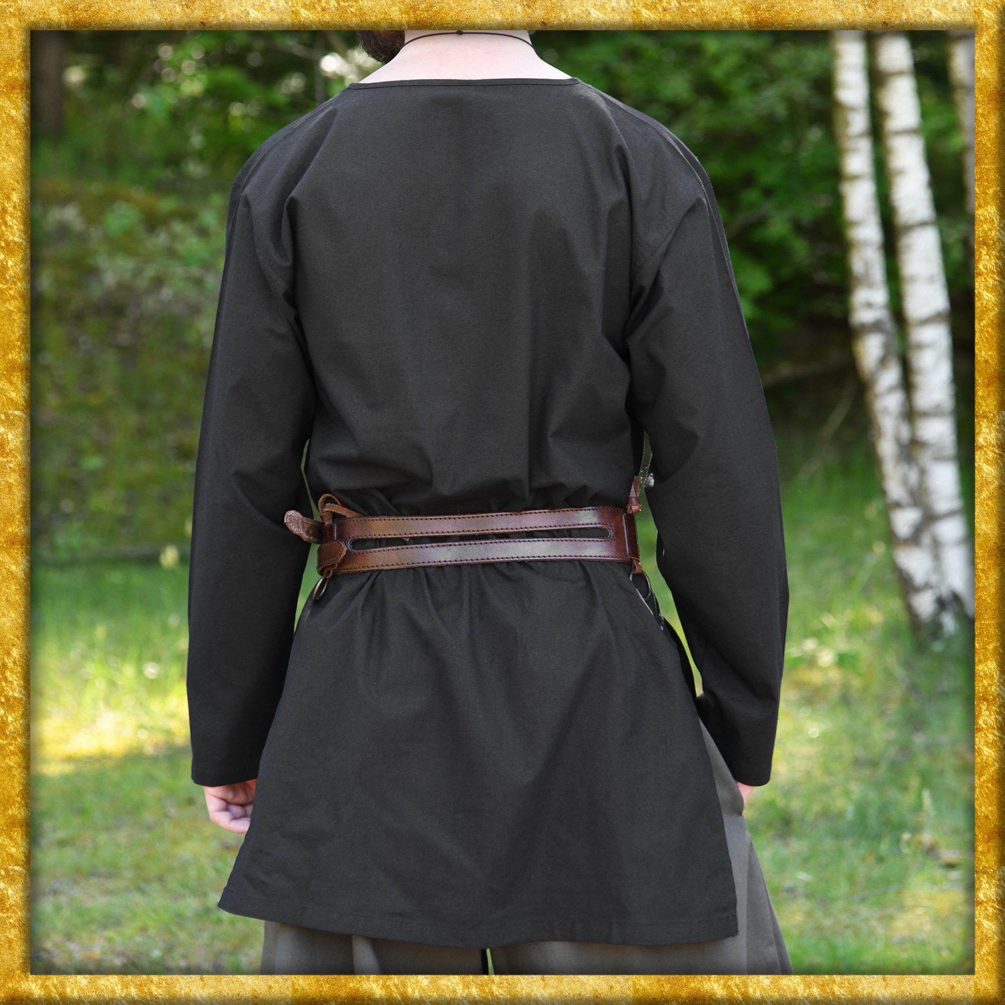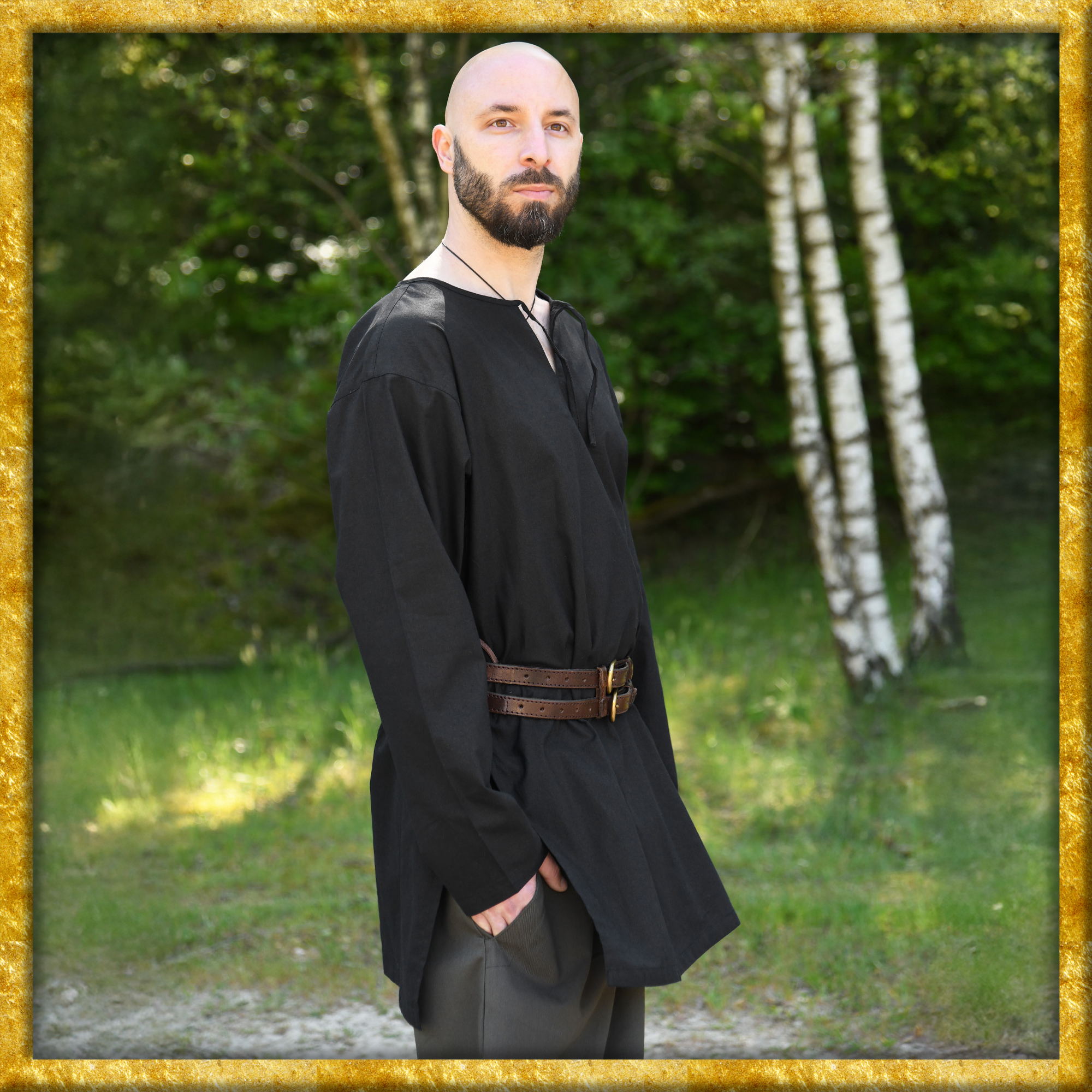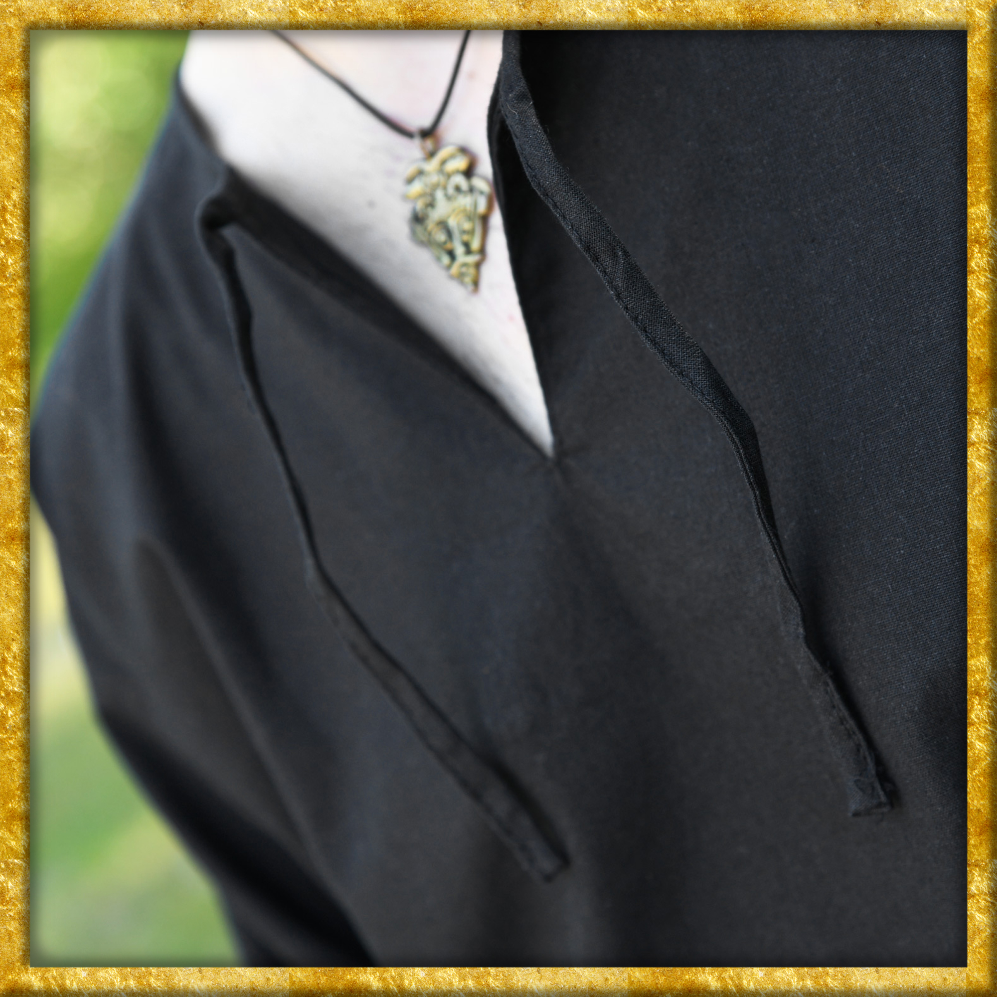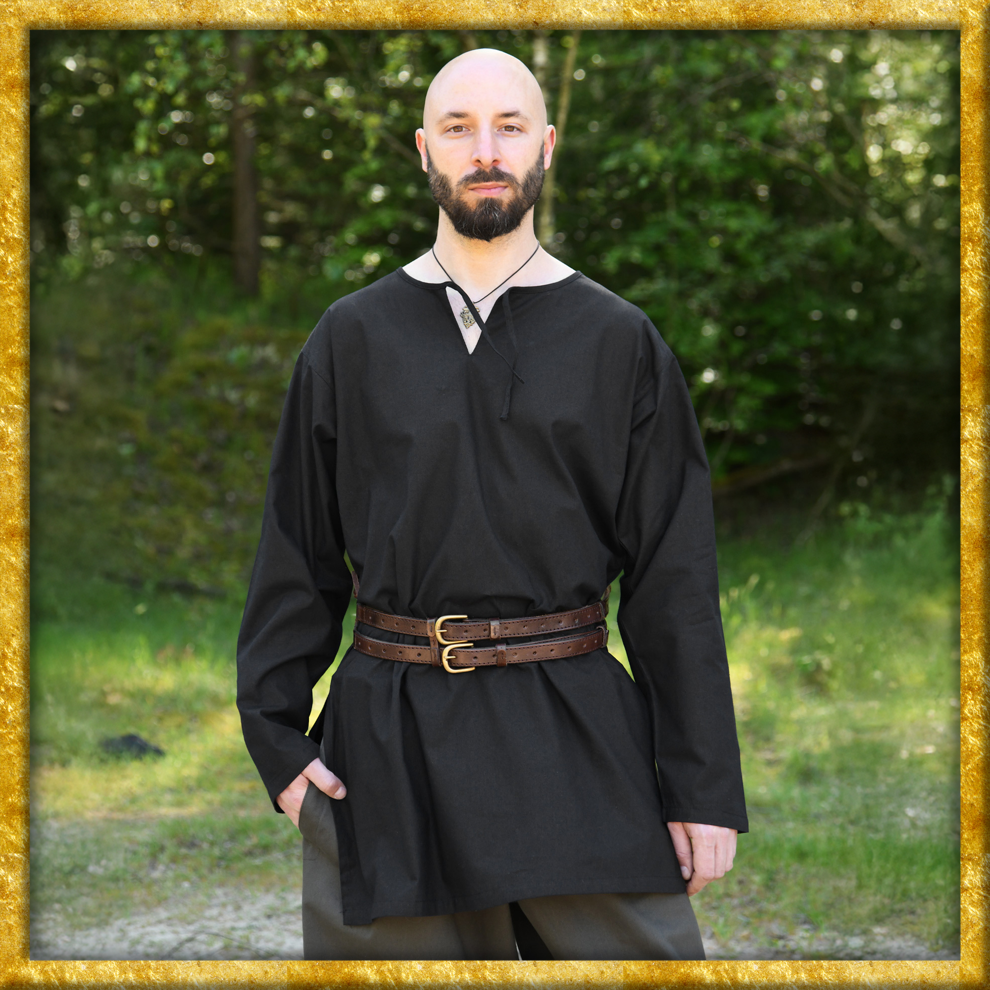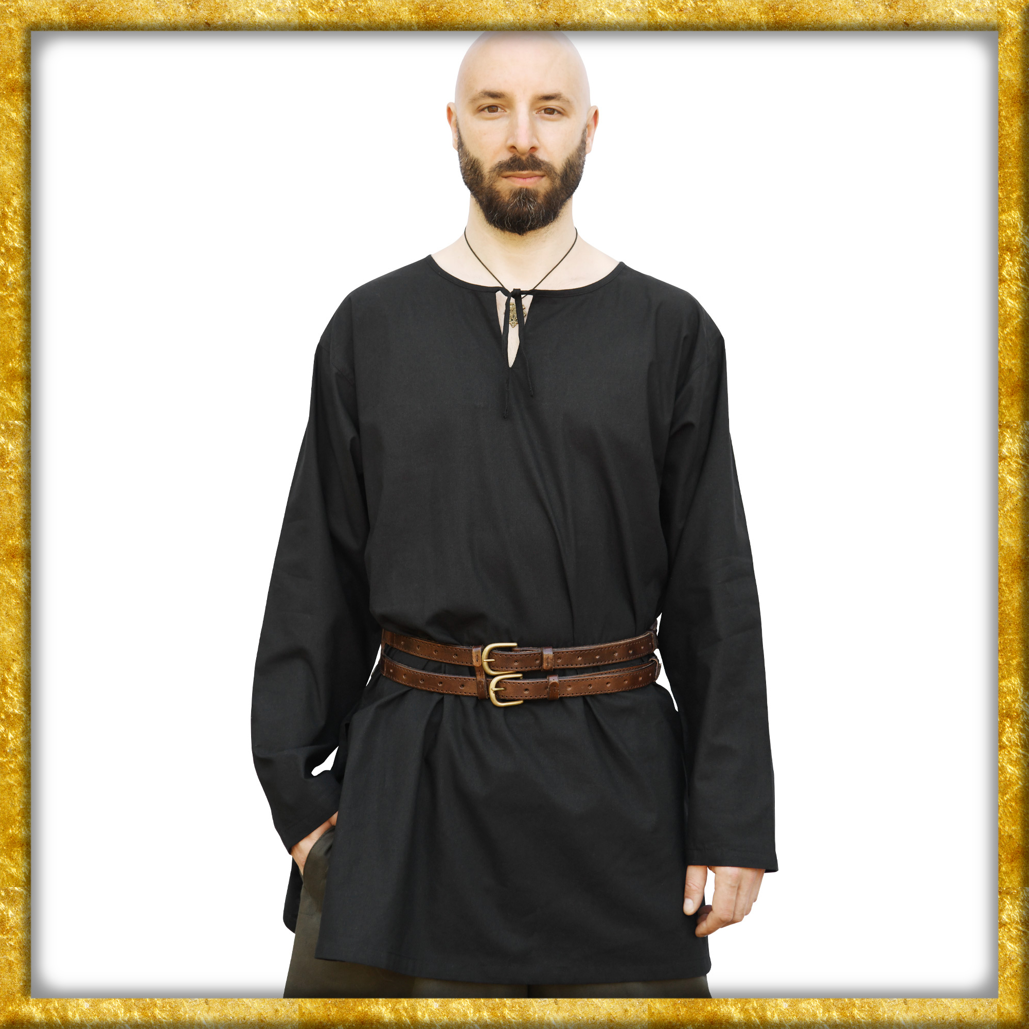 Vielseitig einsetzbare Tunika aus leichtem Baumwollstoff. Der Rundhalsausschnitt ist in der vorderen Mitte mit einem Schlitz versehen. Der Schlitz wird je nach Belieben mit dem Bändchen geschlossen oder einfach offen getragen. Schlitze an den Seitennähten erhöhen die Bewegungsfreiheit. Tragbar als Ober- und Untergewand. Als Untergewand getragen schützt es die Oberkleidung vor Schweiss. Wir empfehlen die Tunika besonders als Untergewand für Wollgewandung, um die kratzige Wolle nicht direkt auf der Haut zu spüren. Im Sommer ist die Tunika ideal als luftiges Obergewand.